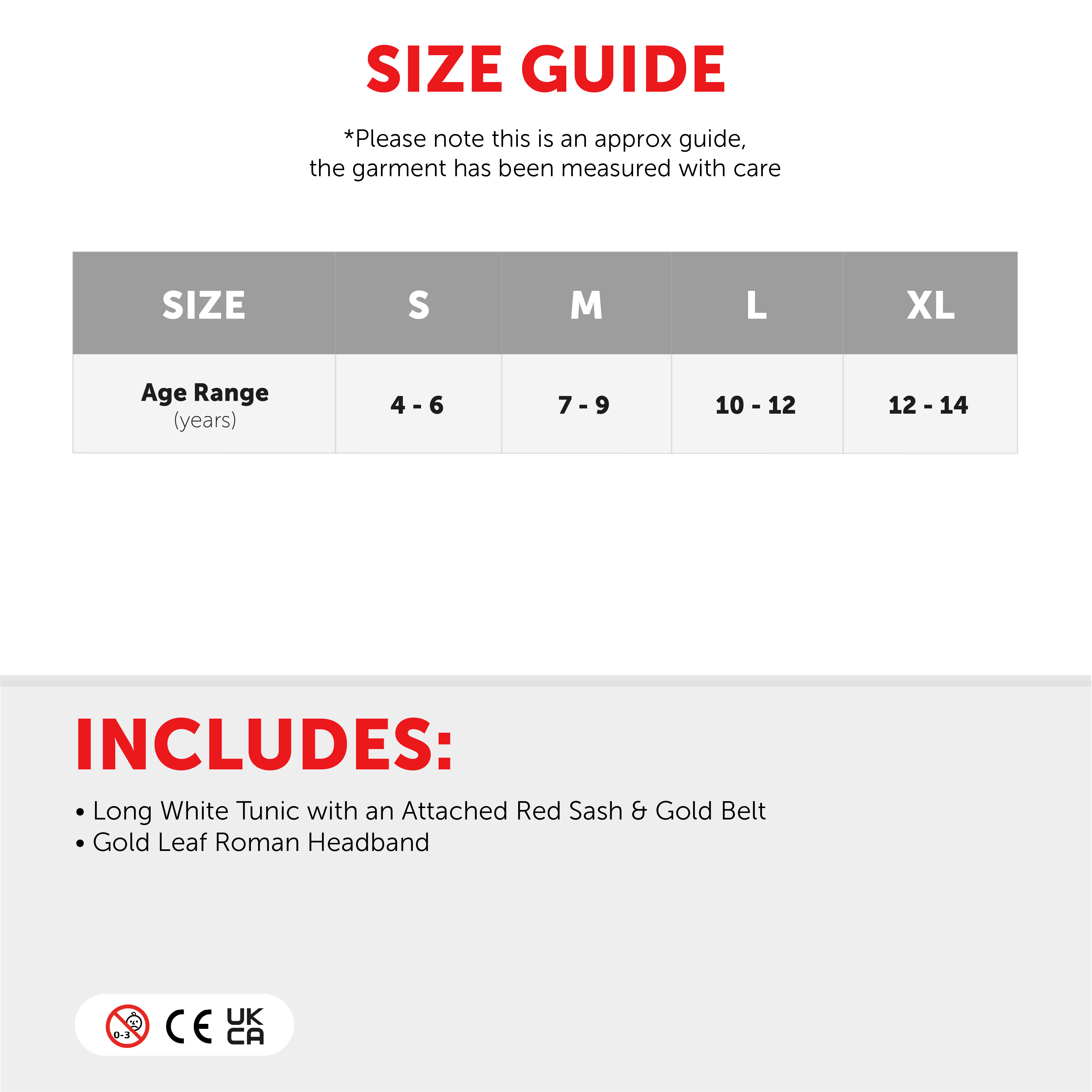 Your Child’s Roman Goddess Costume includes a long white tunic with an attached red sash, a decorative gold belt, and a matching gold leaf headpiece. The perfect look for Roman Day, school history events, or fancy dress parties!