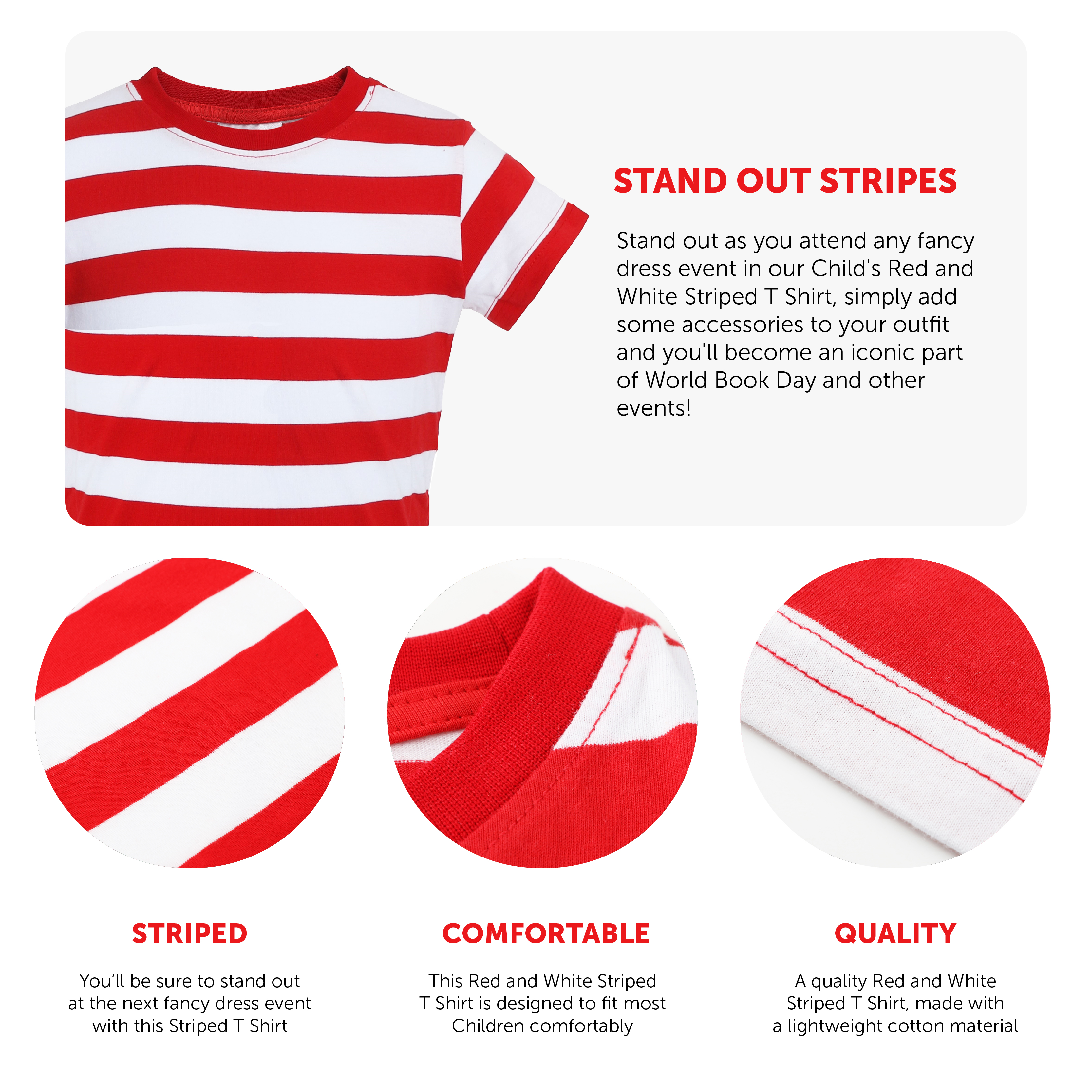 FANTASTIC QUALITY: Add to an iconic World Book Day character look, and be instantly recognisable in this bold, quality made Red and White Striped T Shirt - add Glasses and a Bobble Hat, and you'll be set to go!