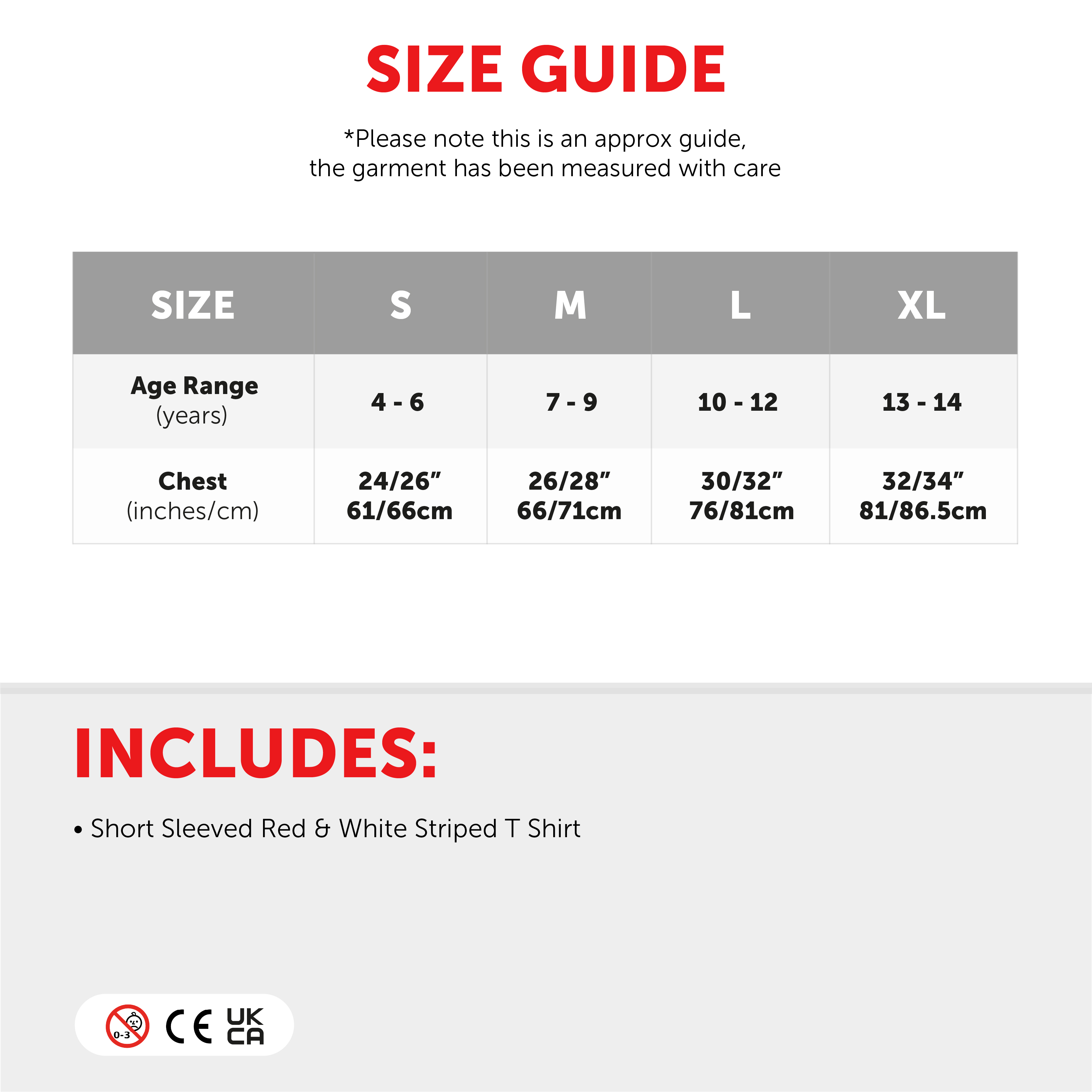 AVAILABLE IN MULTIPLE SIZES: Your Child’s Red and White Striped T Shirt is available in multiple sizes from Small to X-Large: Small: Age: 4 - 6 years - Chest: 24/26" (61/66cm) | Medium: Age: 7 - 9 years - Chest: 26/28" (66/71cm) | Large: Age: 10 - 12 years - Chest: 30/32" (76/81cm) | X-Large: Age: 13 - 14 years - Chest: 32/34" (81/86.5cm)