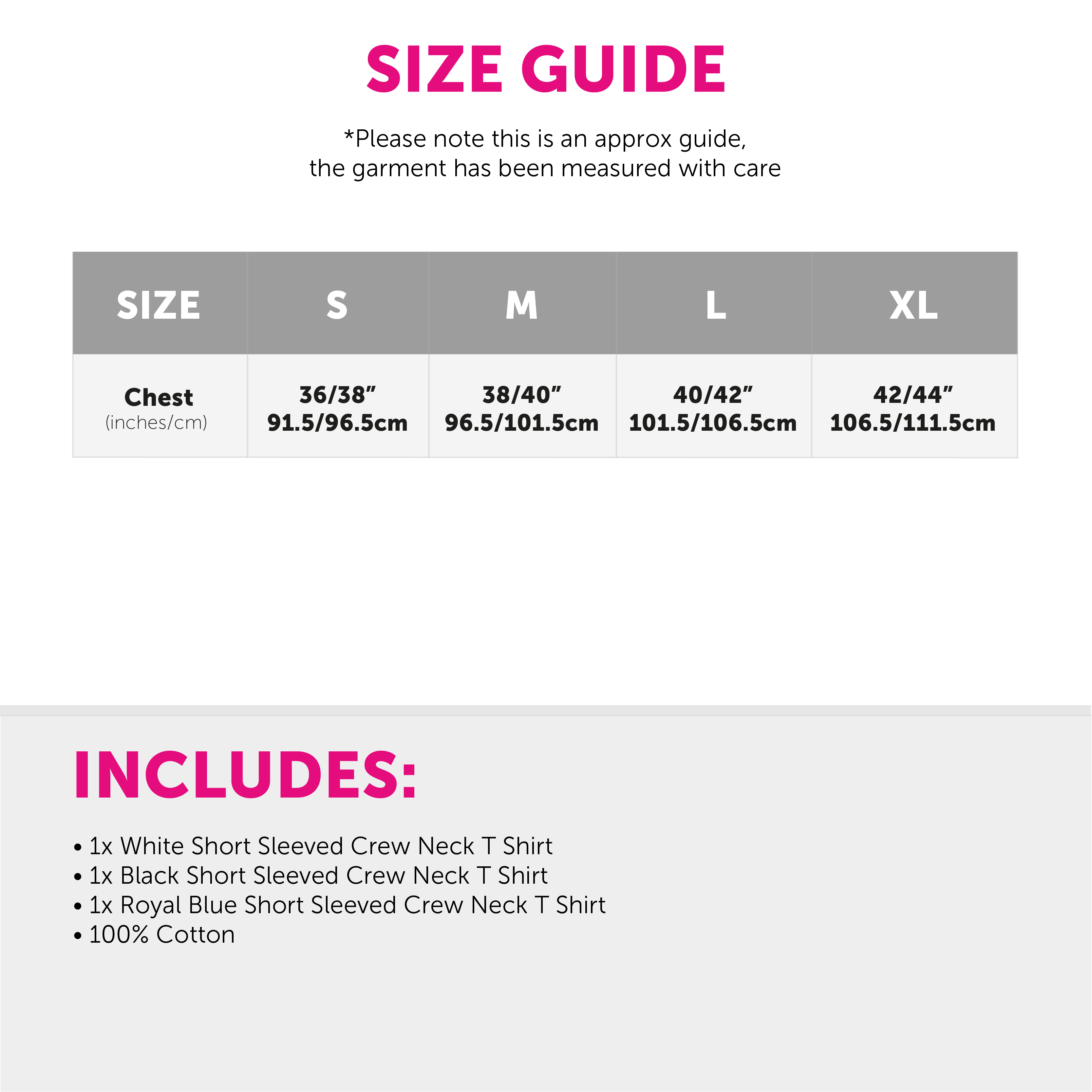 AVAILABLE IN MULTIPLE SIZES: Your Men's Black, White and Royal Blue Crew Neck T Shirts are available in multiple sizes from Small to X-Large: Small - Chest: 36/38" (91.5/96.5cm) | Medium - Chest: 38/40" (96.5/101.5cm) | Large - Chest: 40/42" (101.5/106.5cm) | X-Large - Chest: 42/44" (106.5/111.5cm)
