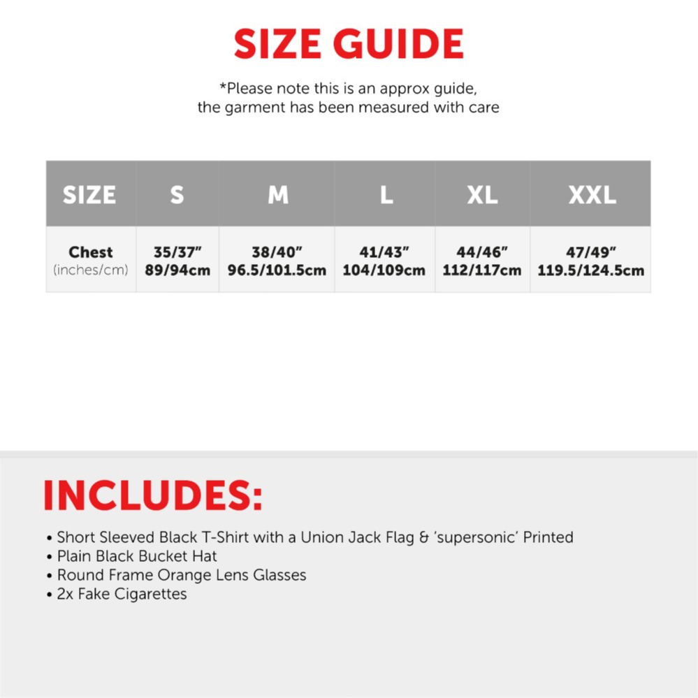This Adults Britpop Costume Set includes a short-sleeved Black T-Shirt with a Red, White & Blue Union Jack print and 'supersonic' printed over the top, Round Frame Orange Lens Glasses, 2x Fake Cigarettes, a Plain Black Bucket Hat, and a Silver Glitter Microphone Prop – the perfect look for any music fan!