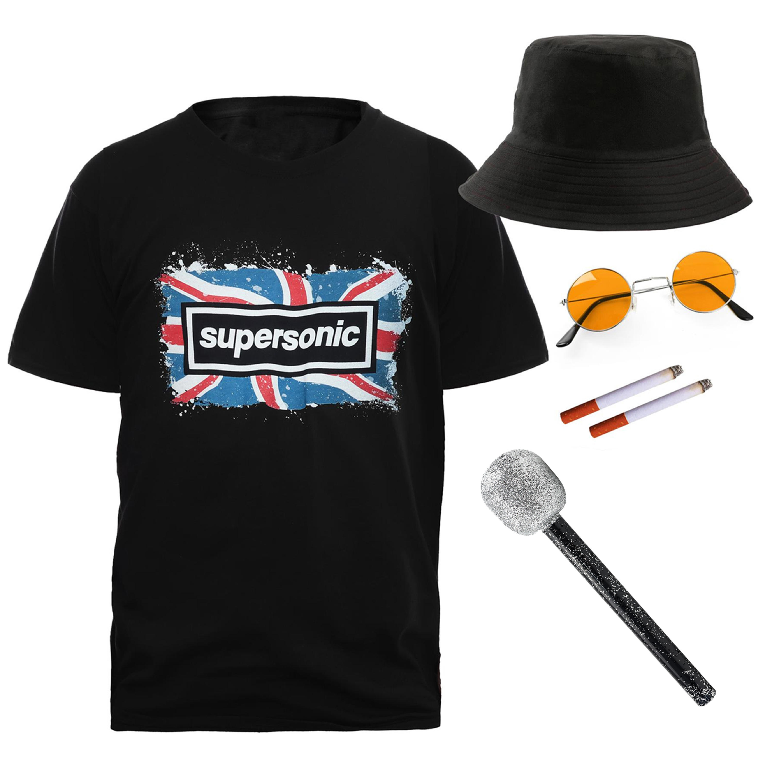 Adults Britpop Cosplay Costume - Super Sonic Tee, Glasses, Fake Cigarettes, Bucket Hat & Mic £17.99