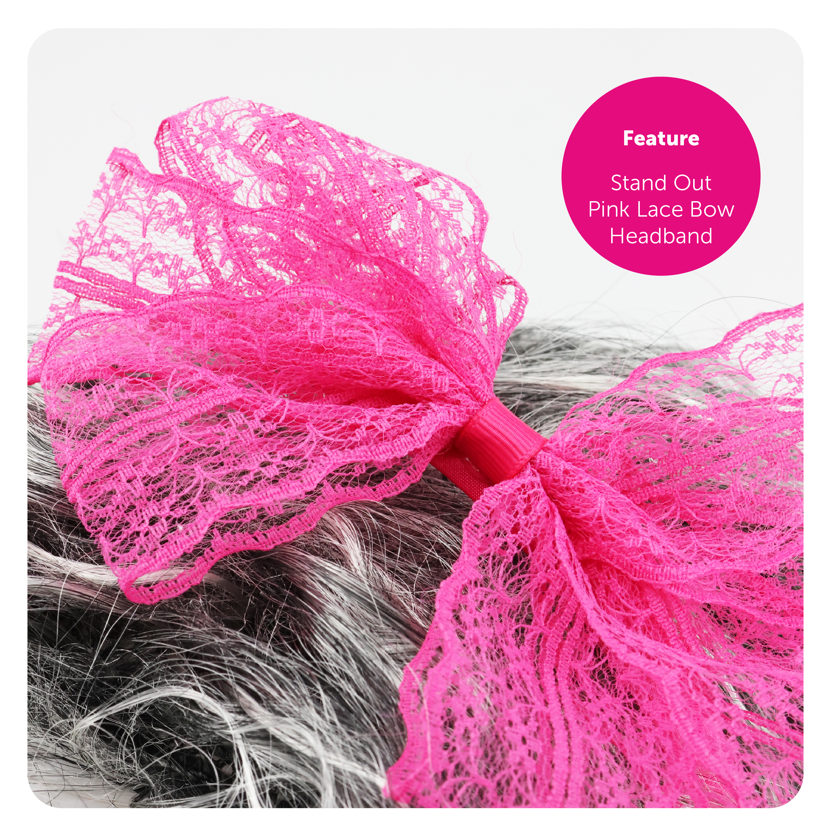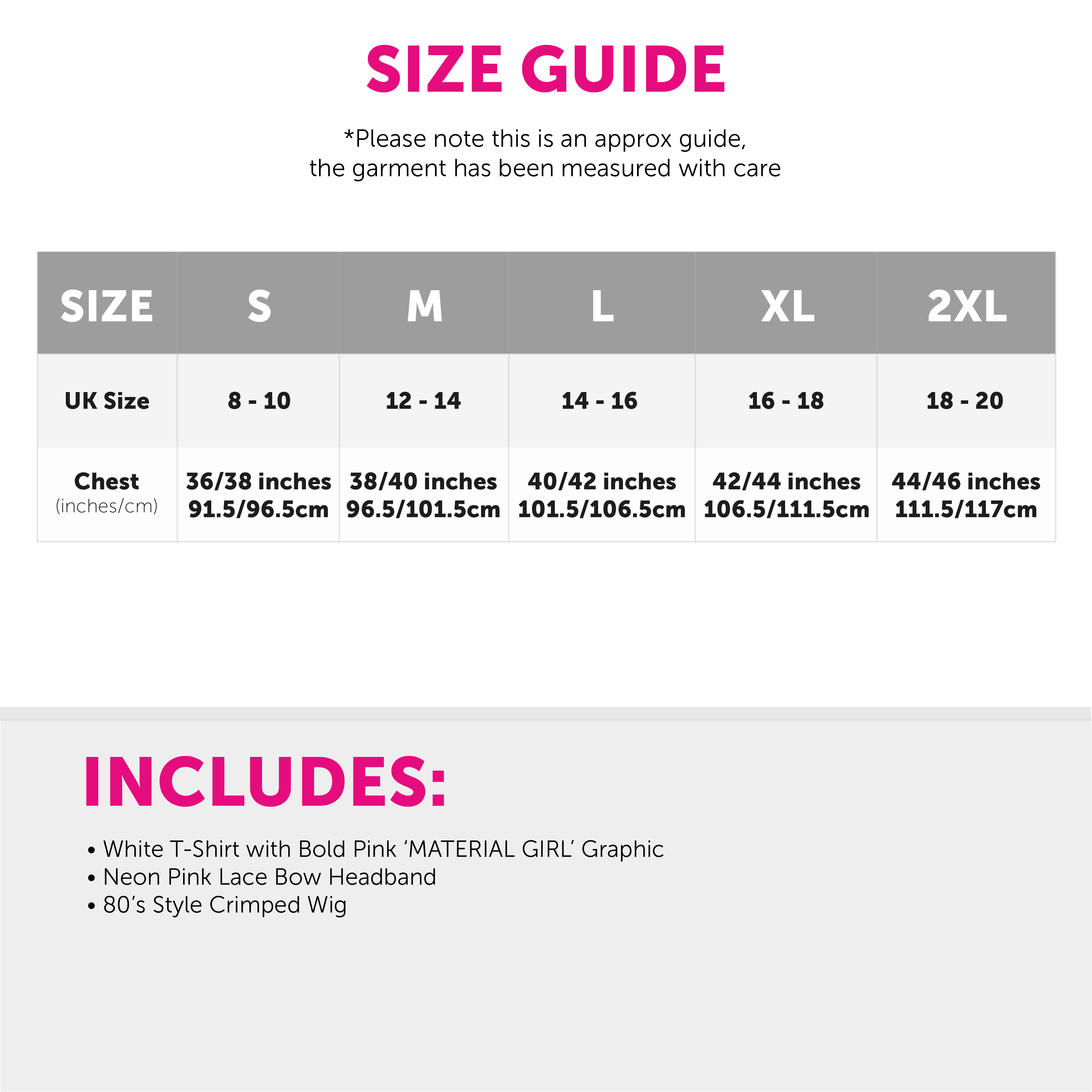 COSTUME INCLUDES: This 80's Pop Girl Costume includes a crisp White T-Shirt with a bold Pink 'Material Girl' graphic on the front, an 80's Style Wig, and a Hot Pink Lace Bow Headband, perfect for any 80's event!