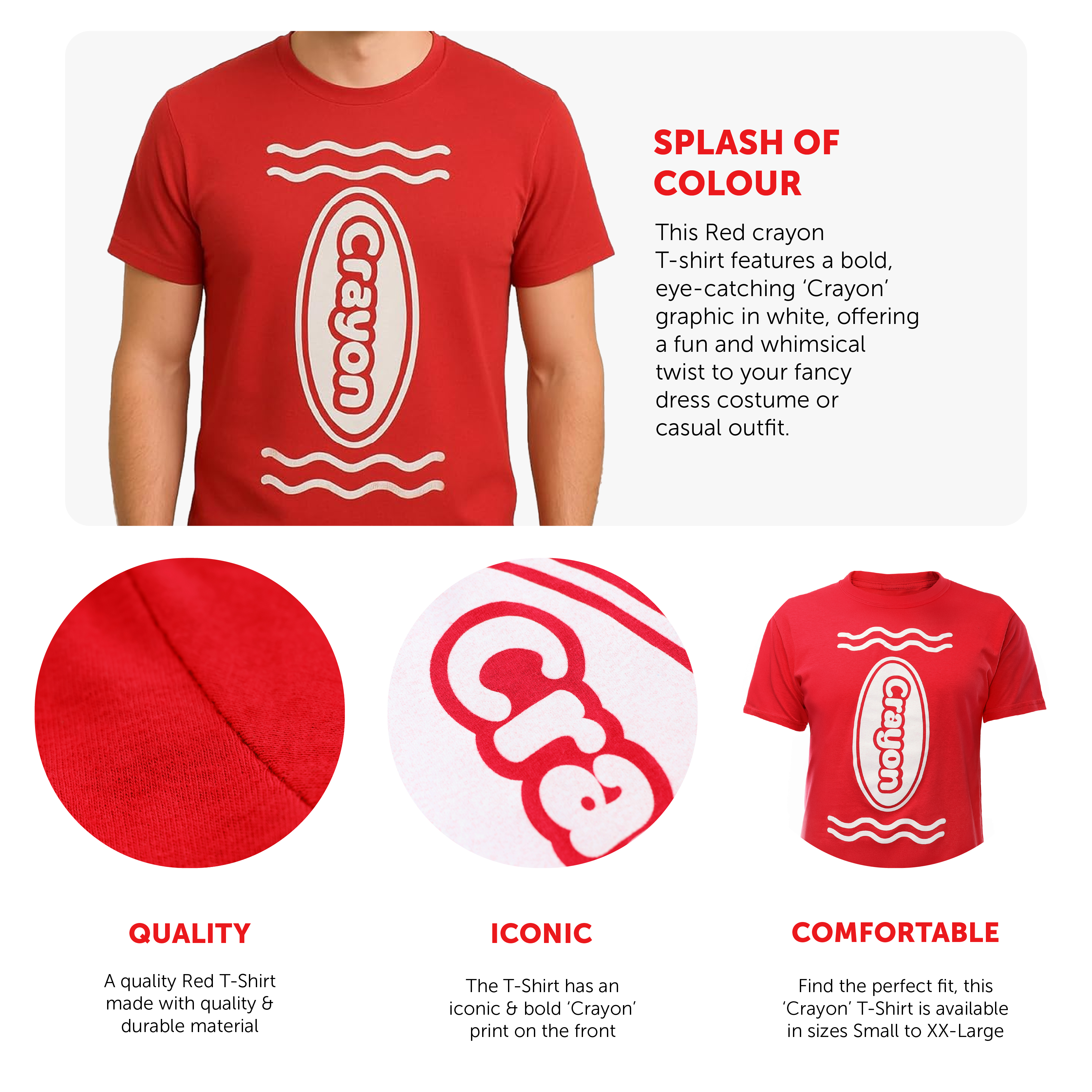 FUN AND CREATIVE DESIGN: This Red crayon T-shirt features a bold, eye-catching "Crayon" graphic in white, offering a fun and whimsical twist to your fancy dress costume or casual outfit.