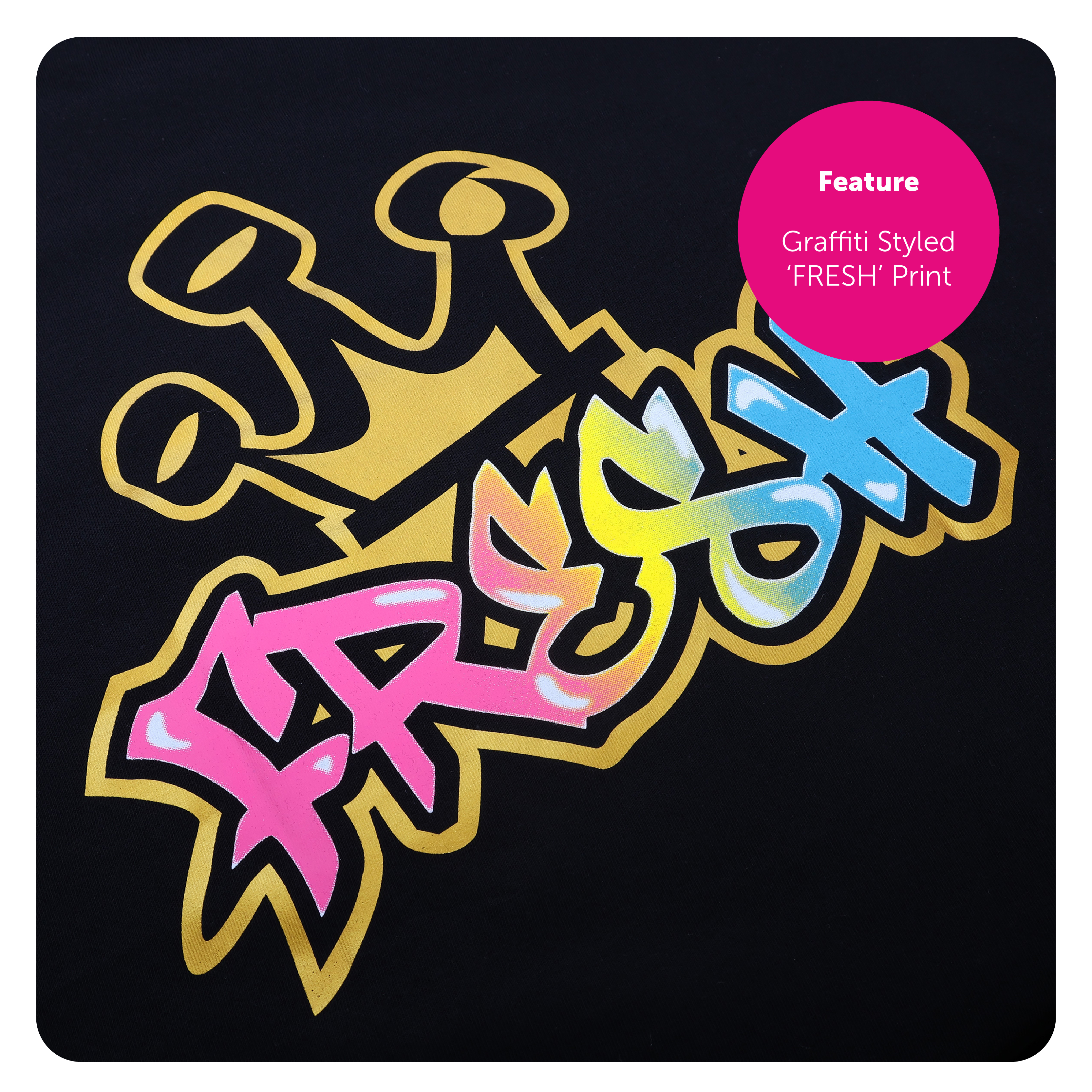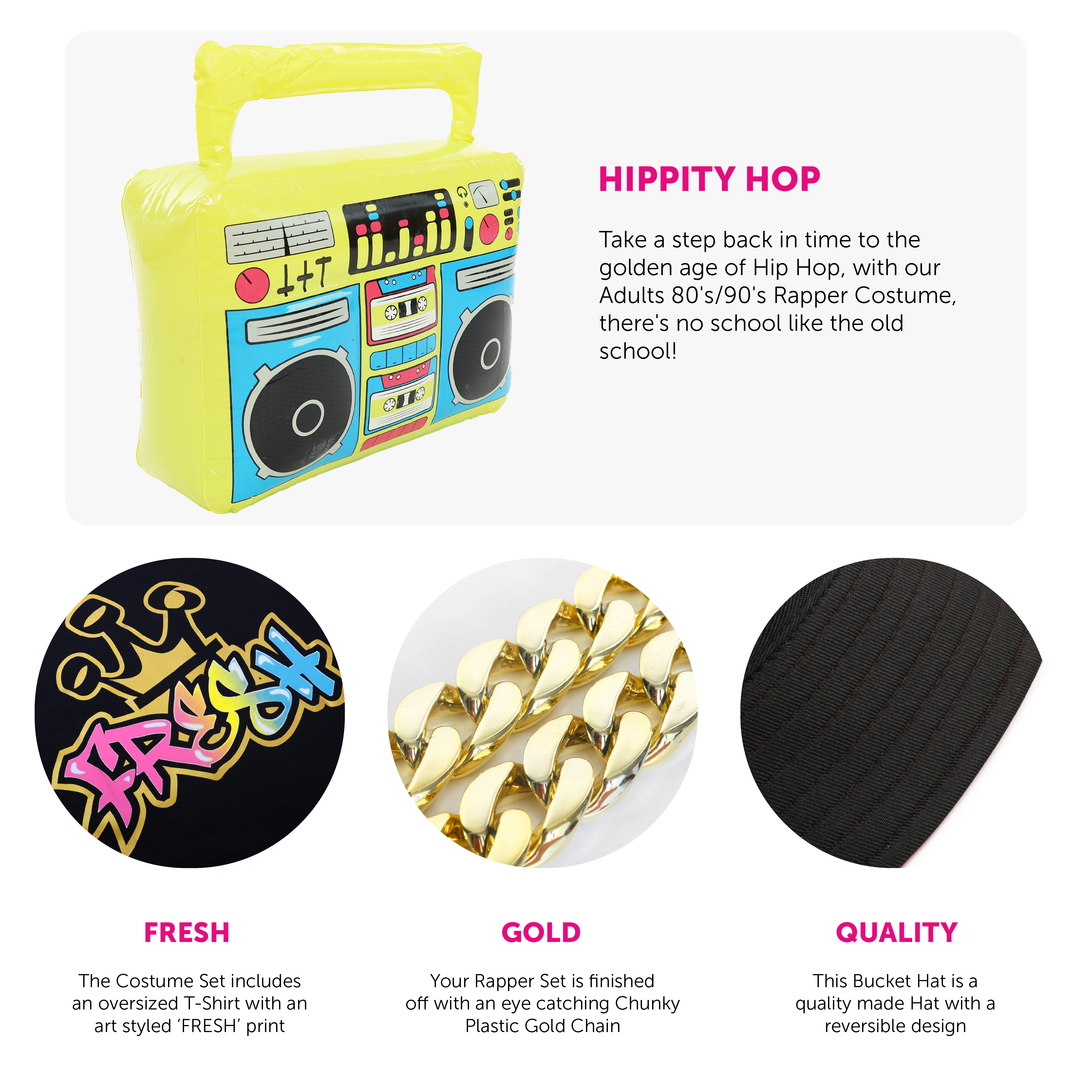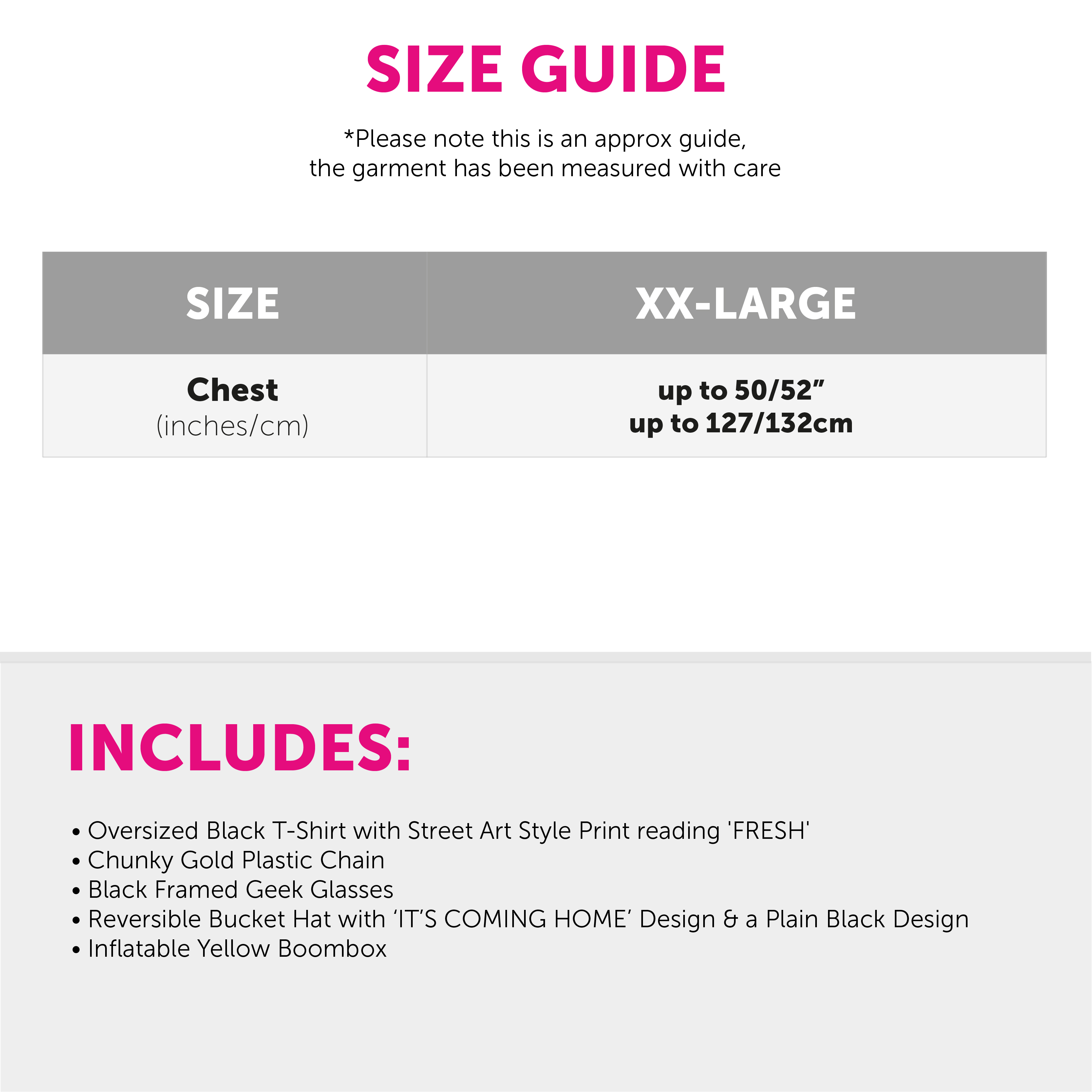 COSTUME DETAILS: Your Adults 80's/90's Rapper Costume includes a Black T-Shirt with Street Art Style Print reading 'FRESH', a chunky Gold Plastic Chain, Black Framed Geek Glasses, a reversible Bucket Hat with one side being Plain Black and the other being a Red Three Lions Football themed design and an Inflatable Yellow Boombox!