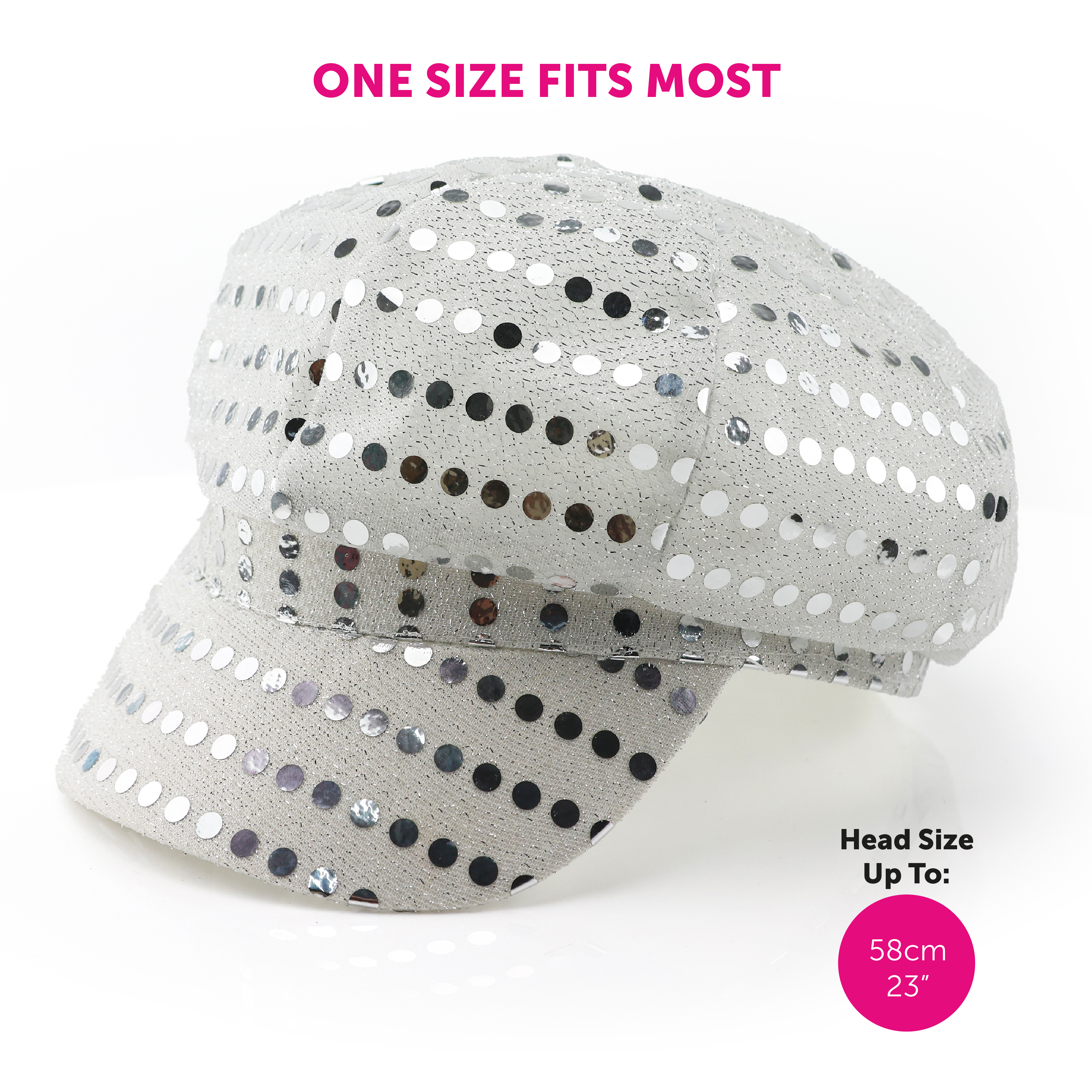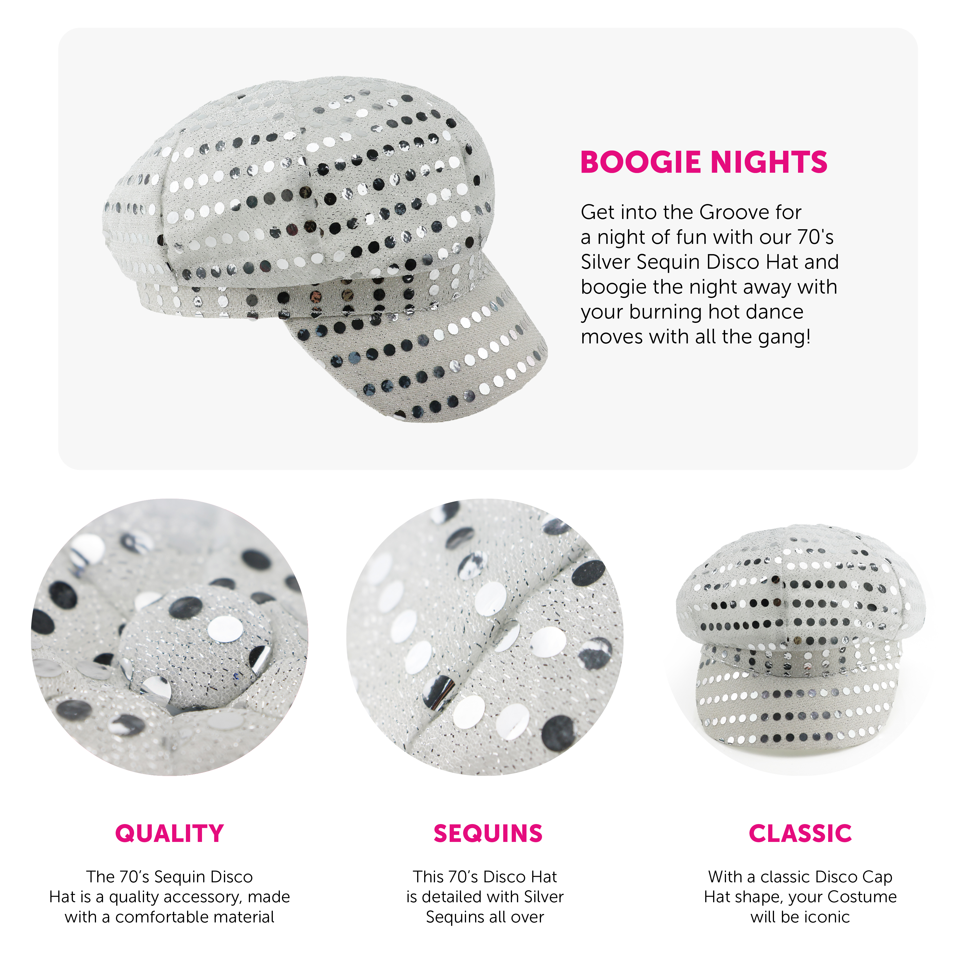 HAT DETAILS: Your 70's Disco Hat is a classic styled Silver Cap, covered in stand out Silver Sequins all over, the perfect addition to your 70's Disco Costume!