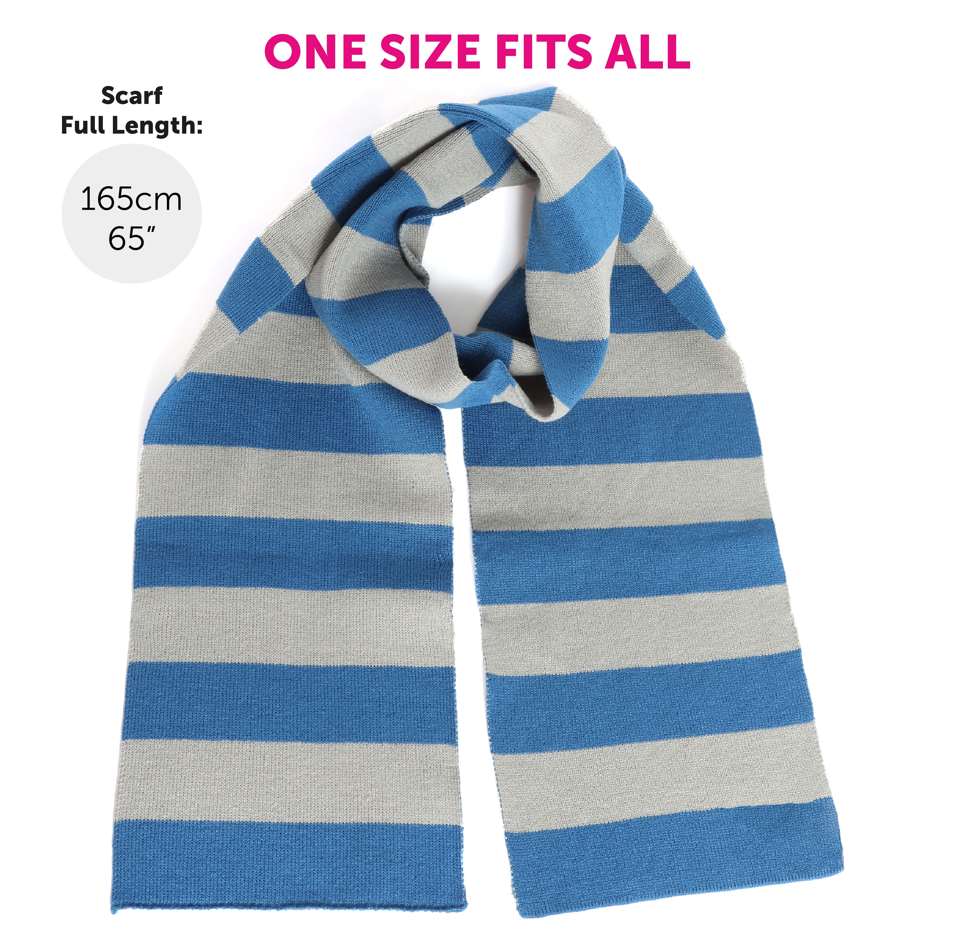 The Blue & Grey Striped Scarf features a soft and comfortable design with alternating blue and grey stripes, creating a classic and instantly recognisable Ravenclaw look. Measuring approximately 165cm (65"), it is designed to fit most adults comfortably and completes the outfit perfectly.