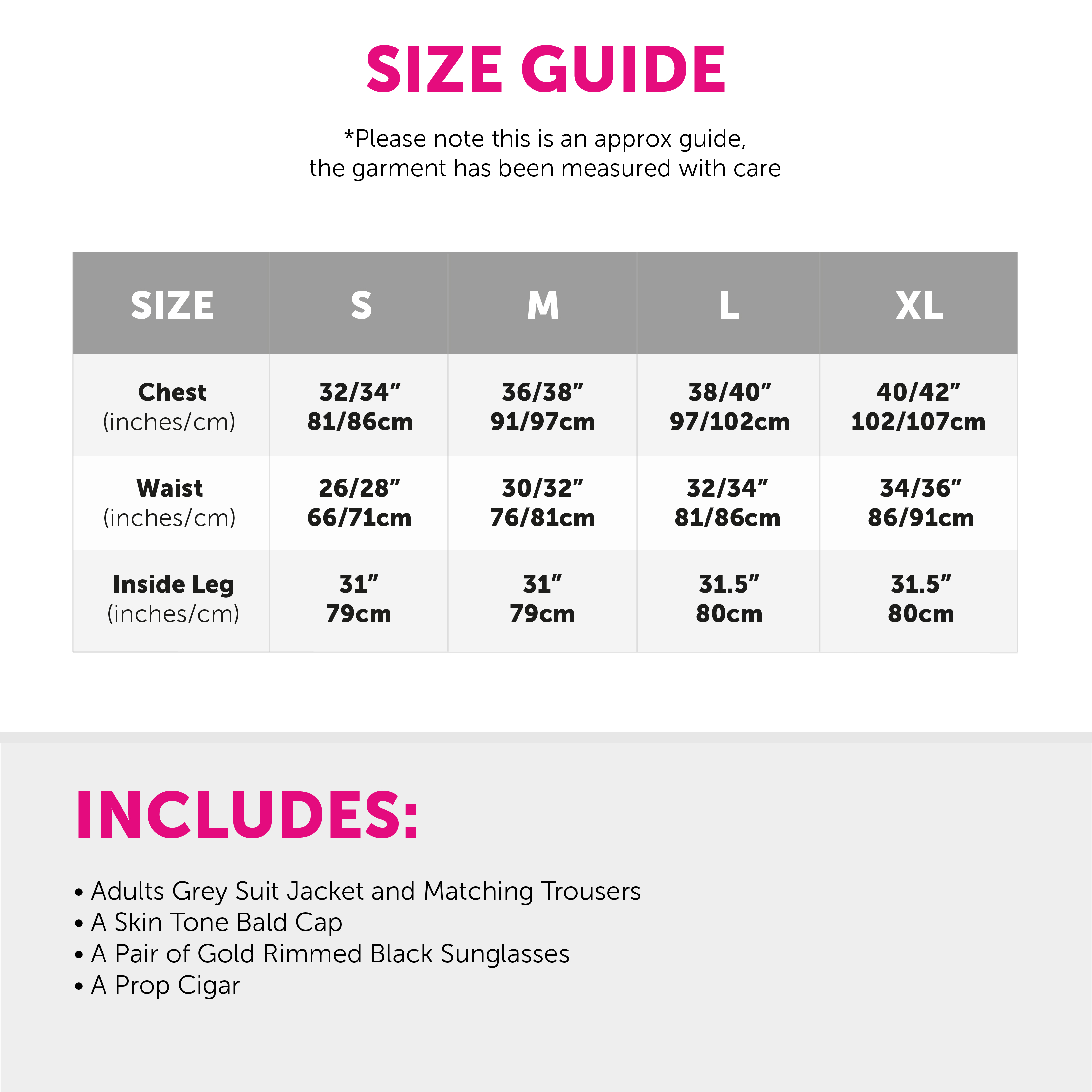 MATCHING GREY SUIT TROUSERS: To finish the costume off, a matching pair of Grey Suit Trousers with an elasticated waistband to adjust and stretch to your comfort for any Adult!