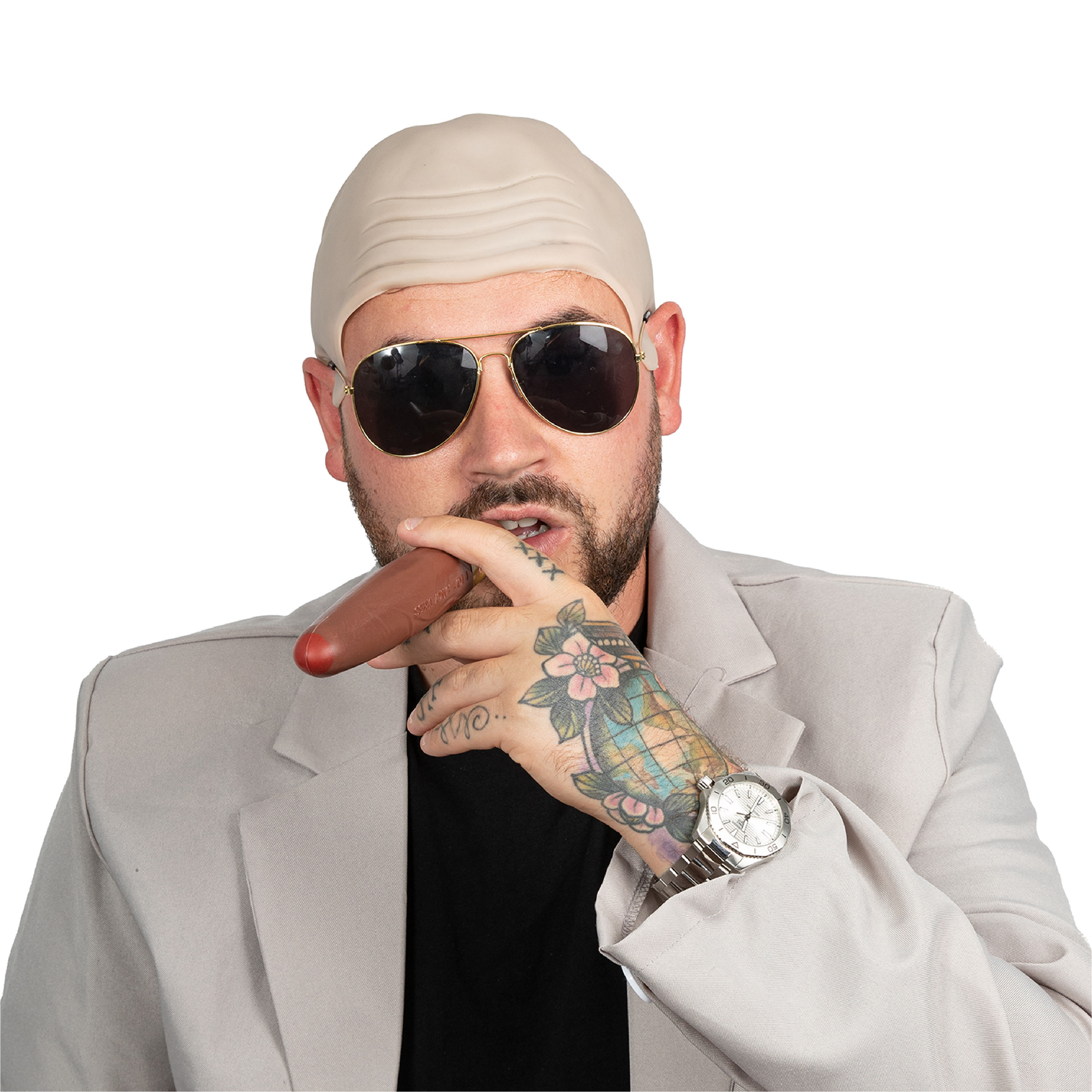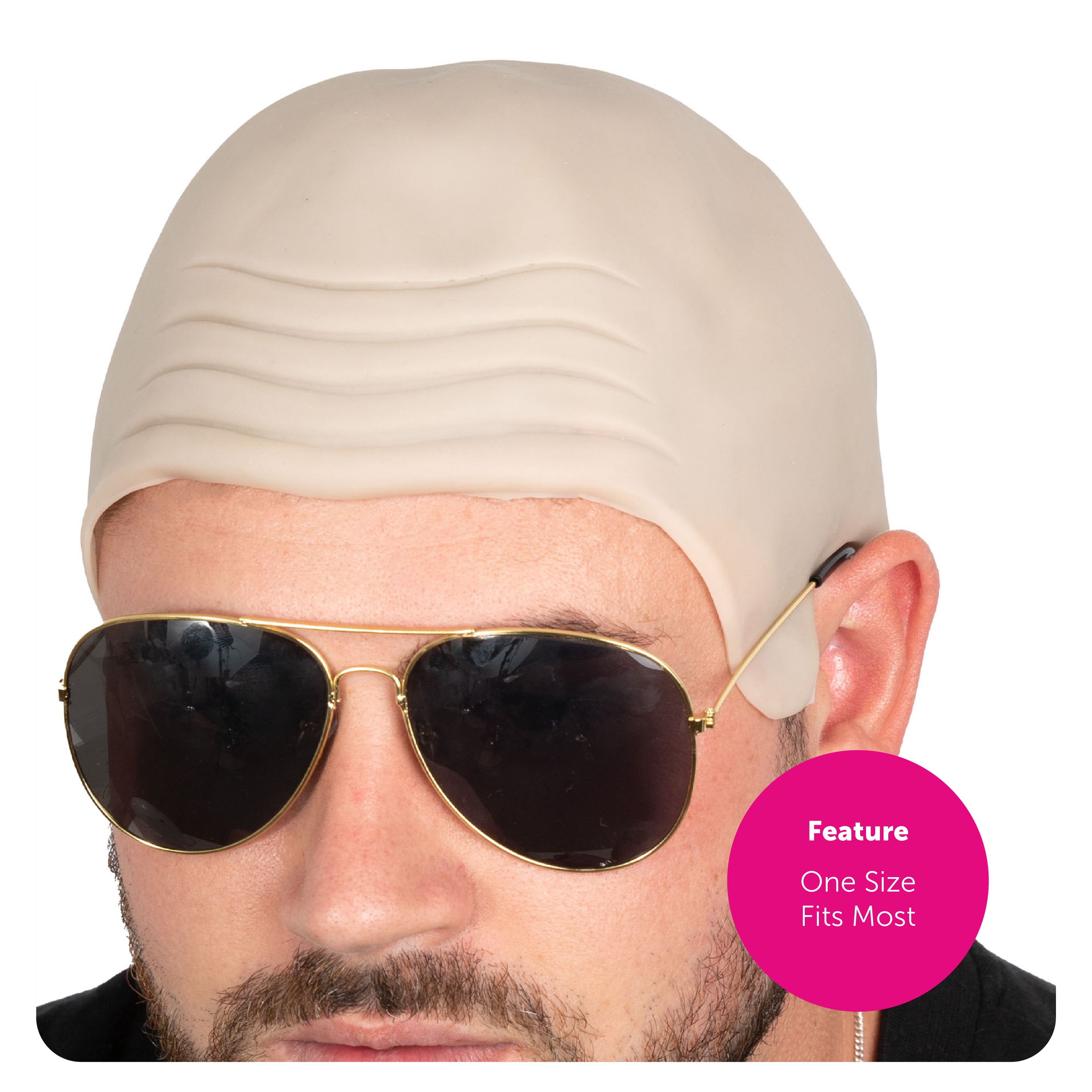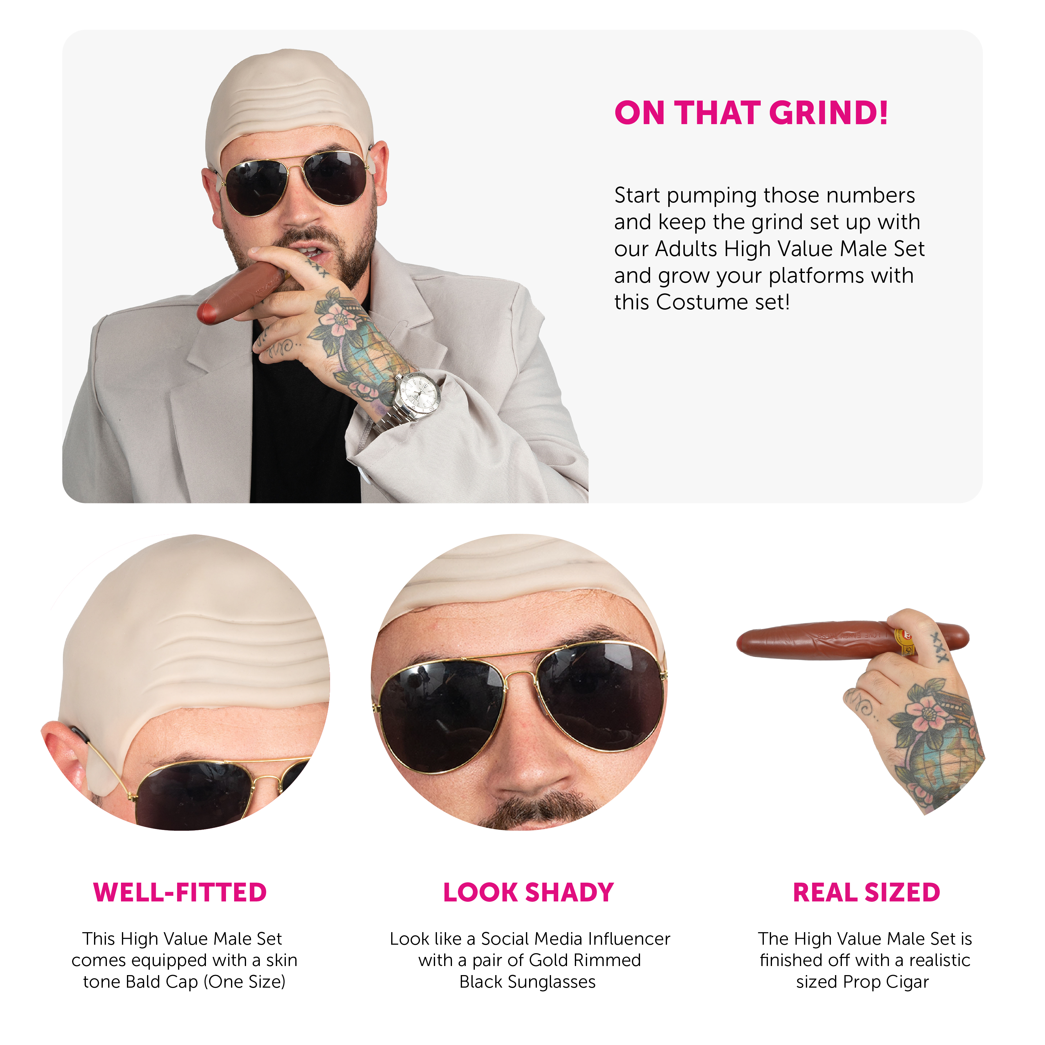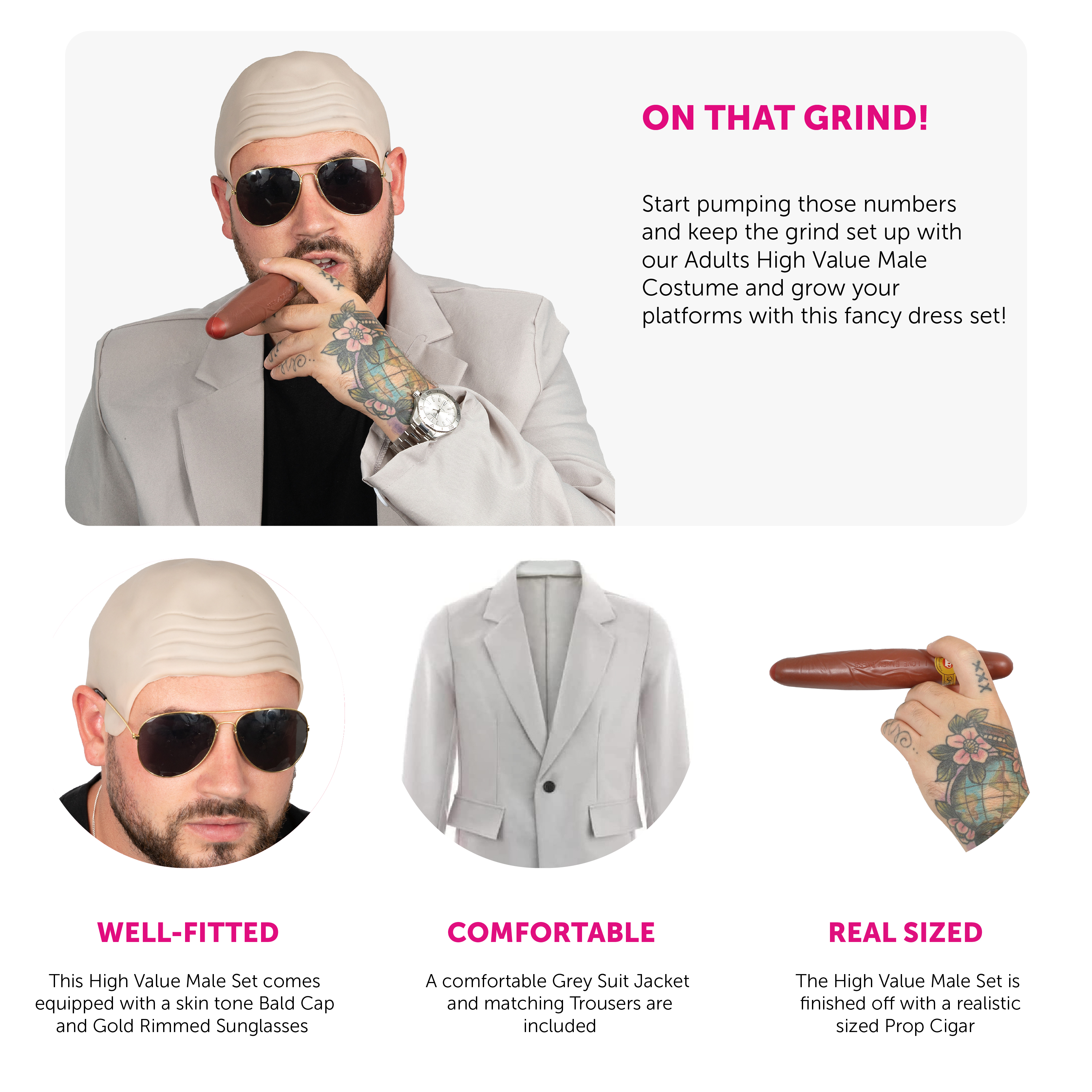 ADULTS HIGH VALUE MALE DETAILS: Your High Value Male Costume Set includes a Beige Bald Cap, A pair of Gold Rimmed Black Sunglasses, Adults Grey Suit Jacket and Trousers, and a Prop Cigar to complete your social media influencer look!