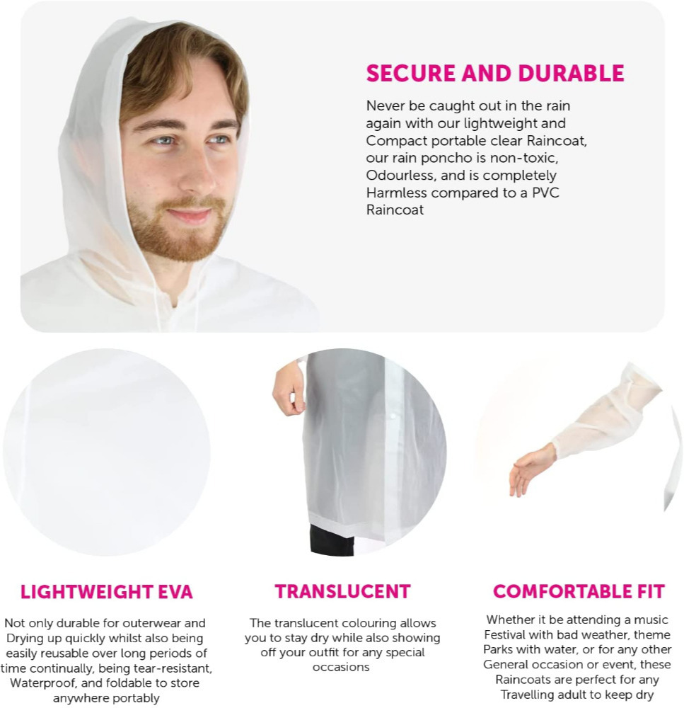SECURE AND DURABLE RAINCOAT: Never be caught out in the rain again with our lightweight and compact portable clear Raincoat, our rain poncho is non-toxic, odourless, and is completely harmless compared to a PVC raincoat
