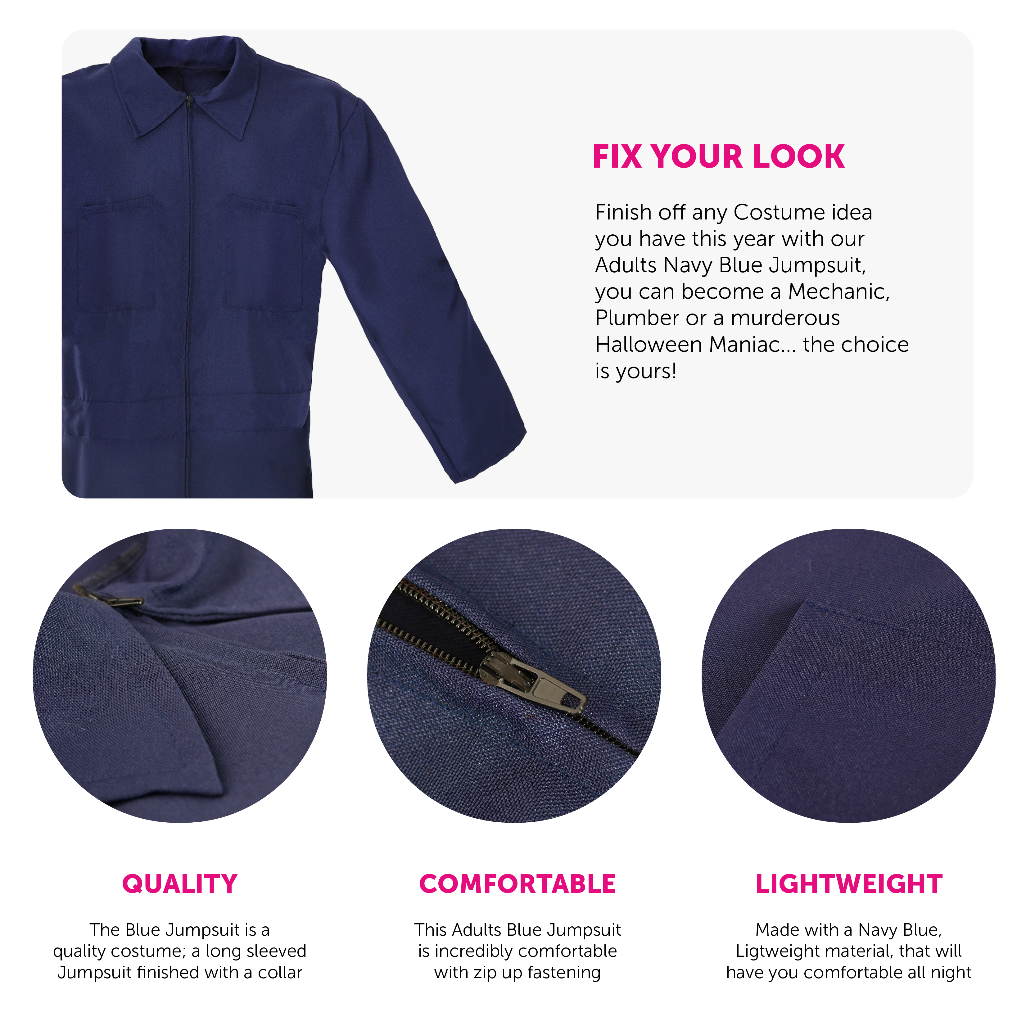 QUALITY DESIGN: This Navy Blue Jumpsuit is a quality Costume piece with comfortable zip fastening, once you put it on, you won't want to take it off, so why not find a use for it for every fancy dress event?