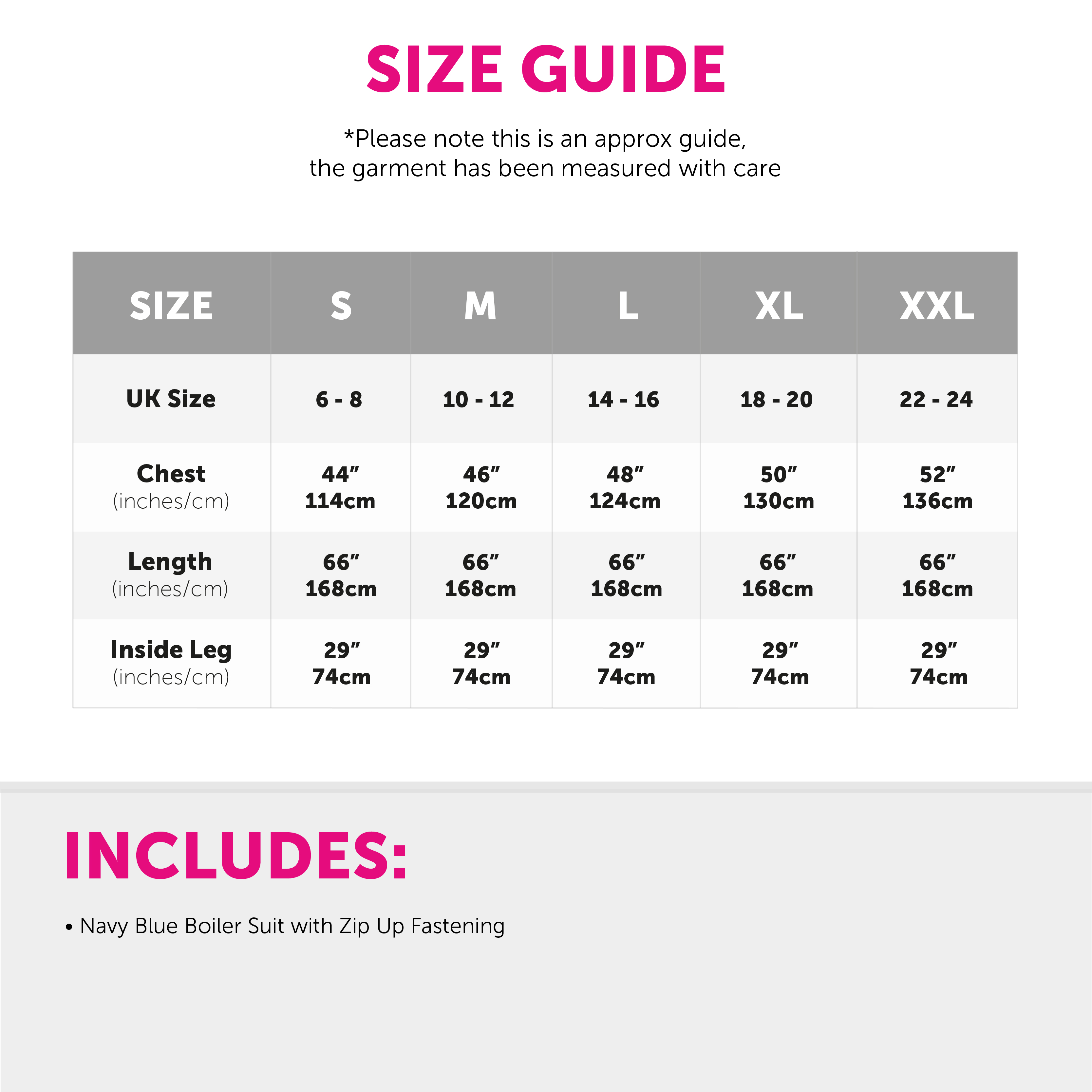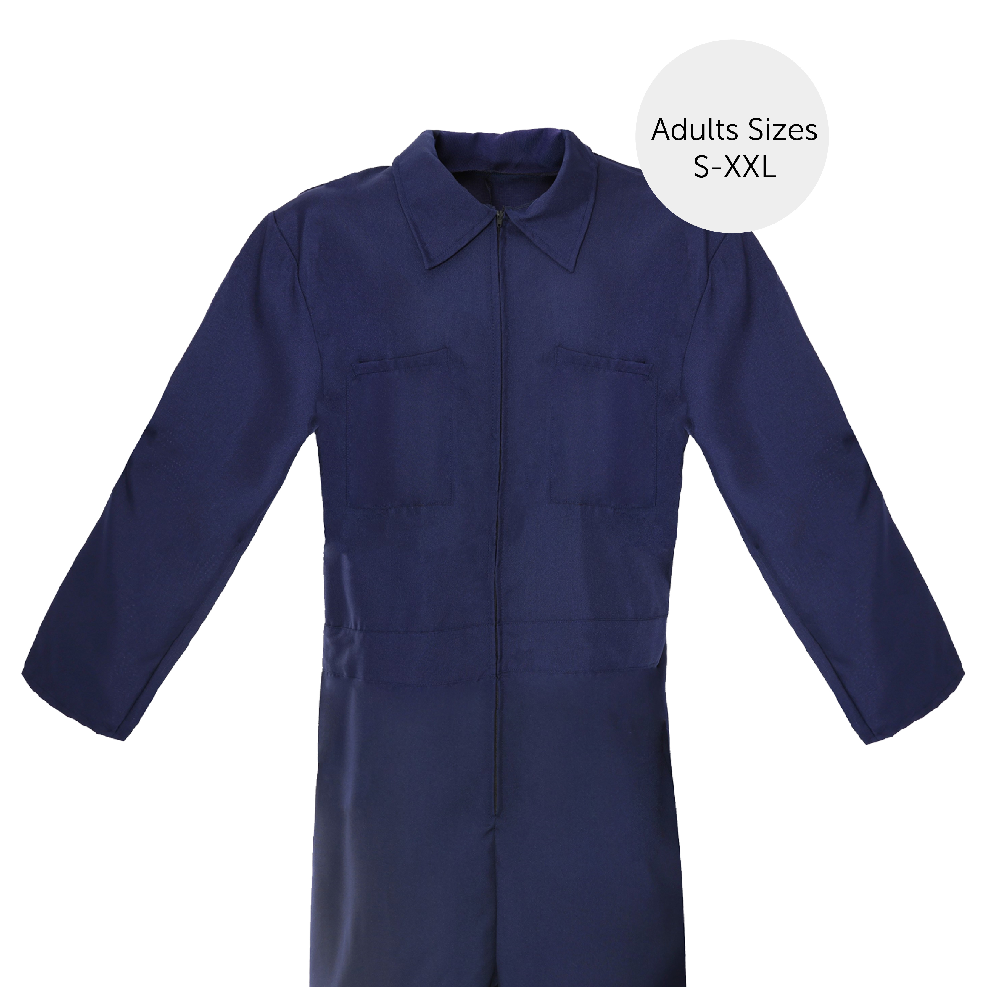 AVAILABLE IN MULTIPLE SIZES: Your Adults Navy Blue Jumpsuit is available in multiple sizes, ranging from Small to XX-Large: Small: UK 6-8: Chest: 44" (114cm), Length: 66" (168cm), Inside Leg: 29" (74cm) | Medium: UK 10-12: Chest: 46" (120cm), Length: 66" (168cm), Inside Leg: 29" (74cm) | Large: UK 14-16: Chest: 48" (124cm), Length: 66" (168cm), Inside Leg: 29" (74cm) | X-Large: UK 18-20: Chest: 50" (130cm), Length - 66" (168cm), Inside Leg: 29" (74cm) | XX-Large: UK 22-24: Chest: 52" (136cm), Length: 66" (168cm), Inside Leg: 29" (74cm)