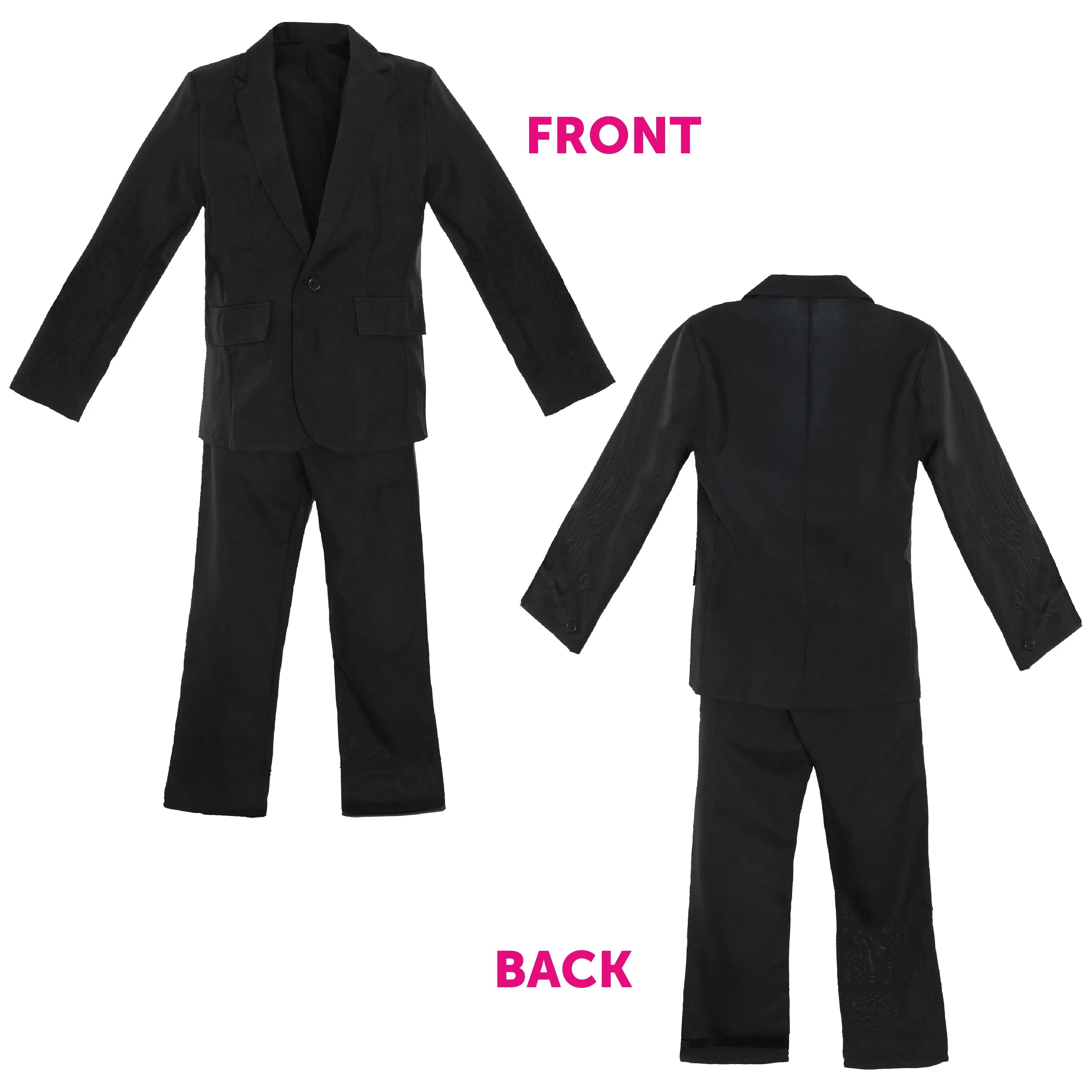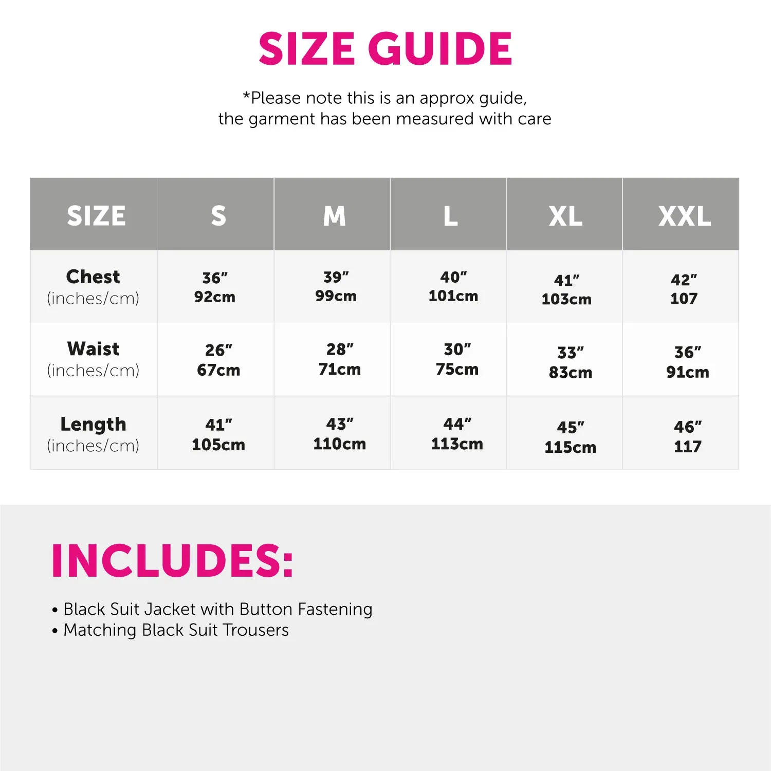 A classic two-piece black suit featuring a smart jacket and matching trousers. The trousers include button fastening and an elasticated waistband for comfort and easy wear. Ideal for both fancy dress and smart events.