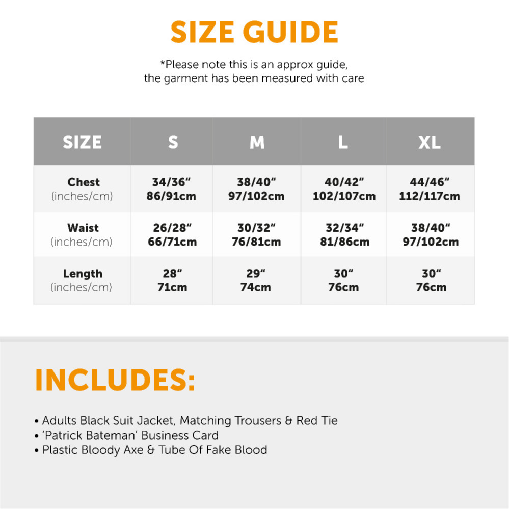 Includes: Black Suit Jacket + Matching Trousers + Red Tie + Bloody Axe + Patrick Bateman Business Card + Tube of Fake Blood
