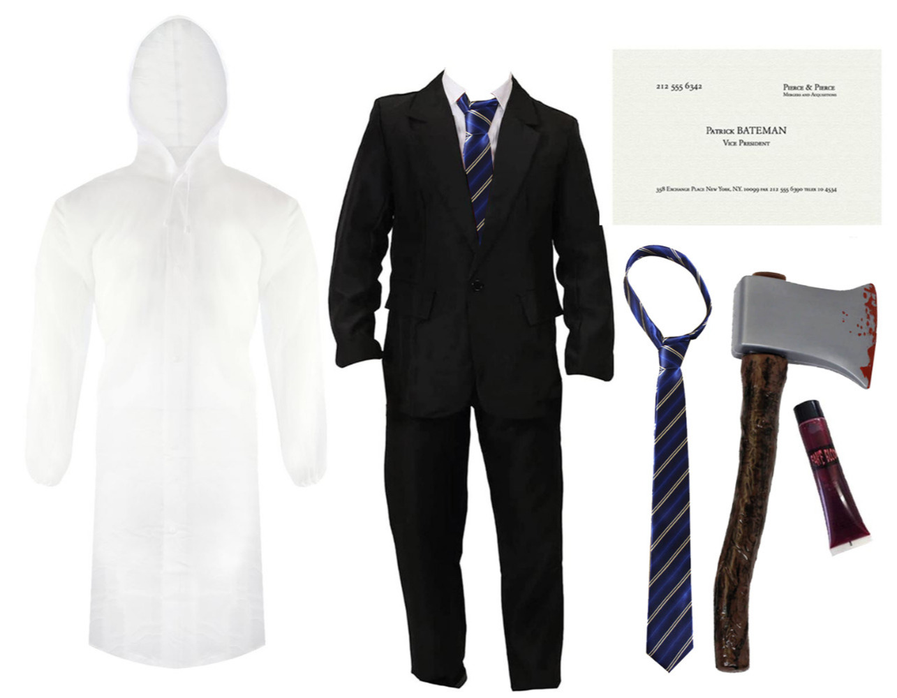 COSTUME INCLUDES: Your American Psycho costume includes a Black Suit Jacket with Matching Trousers, a Clear Raincoat, a Striped Blue Tie, Bloody Axe, Patrick Bateman Business Card, and a Tube of Fake Blood, a perfect set for any movie fancy dress event!