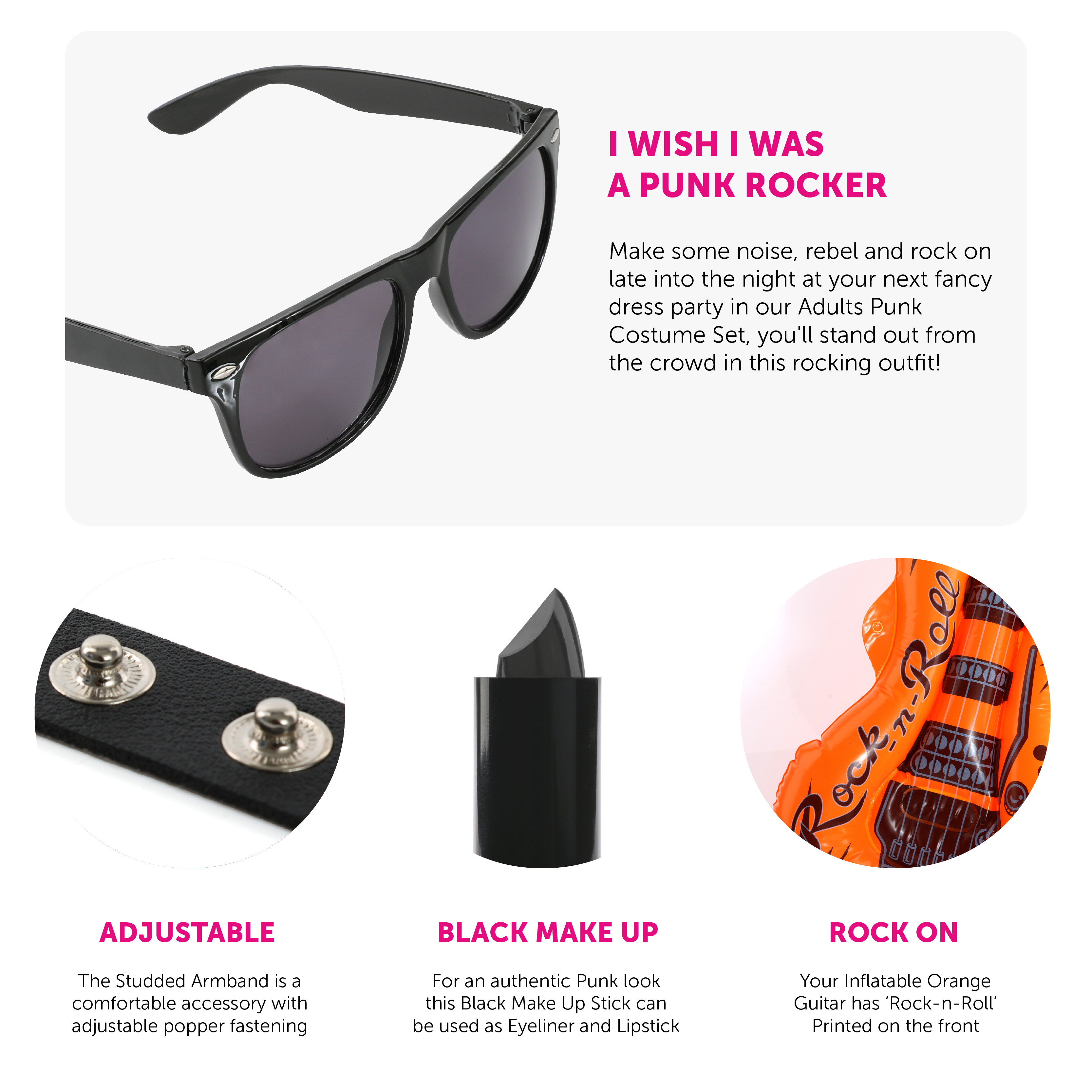 PUNK COSTUME DETAILS: This Adults Punk Costume Set includes a lightweight, short sleeved, Black Mesh Fishnet Top, a black-lensed pair of Sunglasses with a comfortable frame, long lasting Funki Black Lipstick/Eyeliner, a pair of Black Faux-Leather, fingerless Gloves with Silver Studded detailing along the knuckles and an adjustable hook and loop strap, a Silver Studded, black faux-leather Armband with easy fastening poppers, and an Inflatable Orange Guitar, the perfect outfit to rock all night long!