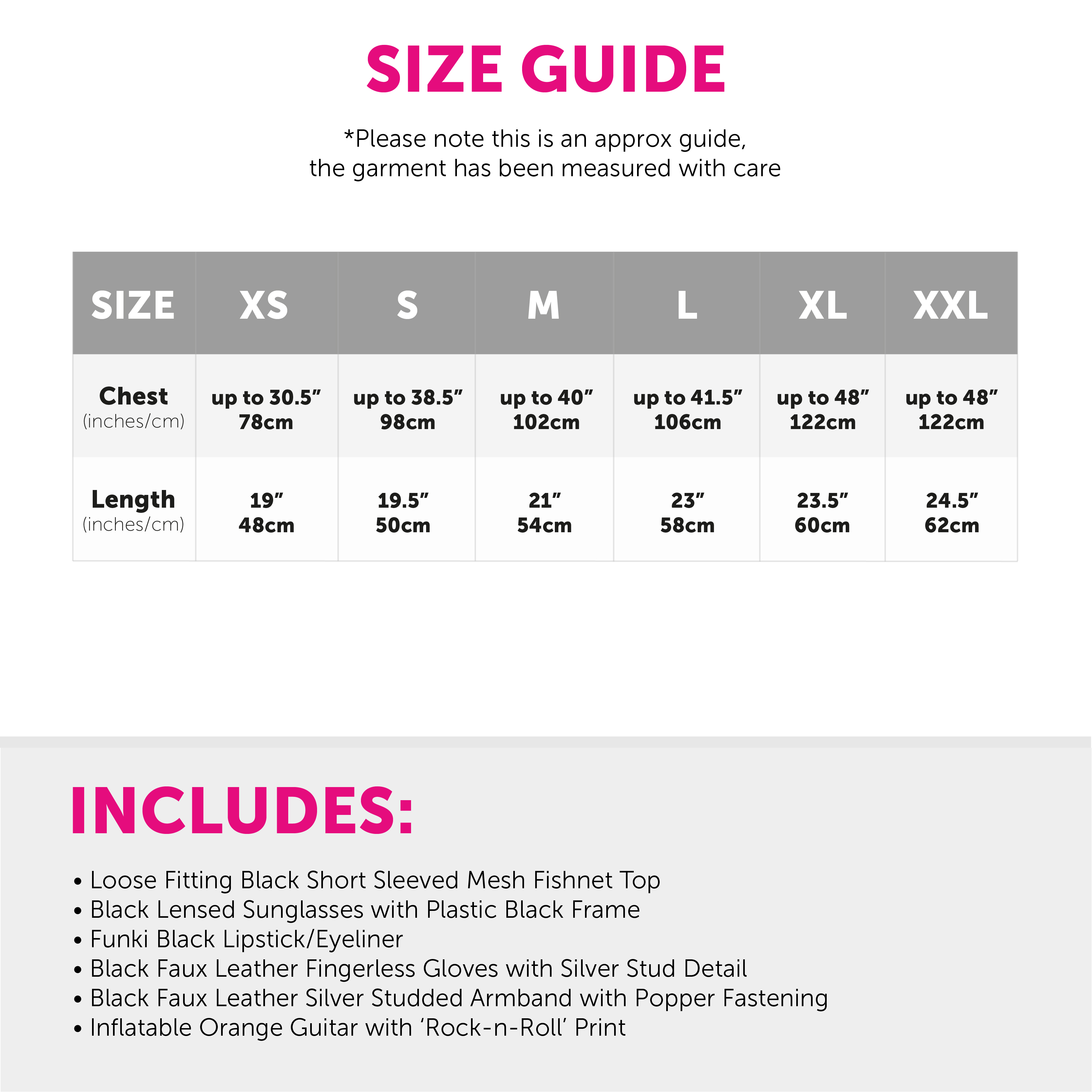 AVAILABLE IN MULTIPLE SIZES: The Adults Punk Costume Set is available in multiple sizes, with the Black Mesh Fishnet Top ranging from sizes X-Small to XX-Large: X-Small - (UK 4 - 6), Chest up to 30.5" (78cm), Length 19" (48cm) | Small - (UK 8 - 10), Chest up to 38.5" (98cm), Length 19.5" (50cm) | Medium - (UK 12 - 14), Chest up to 40" (102cm), Length 21" (54cm) | Large - (UK 16 - 18), Chest up to 41.5" (106cm), Length 23" (58cm) | X-Large - (UK 18 - 20), Chest up to 48" (122cm), Length 23.5" (60cm) | XX-Large - (UK 20 - 22), Chest up to 48" (122cm), Length 24.5" (62cm)