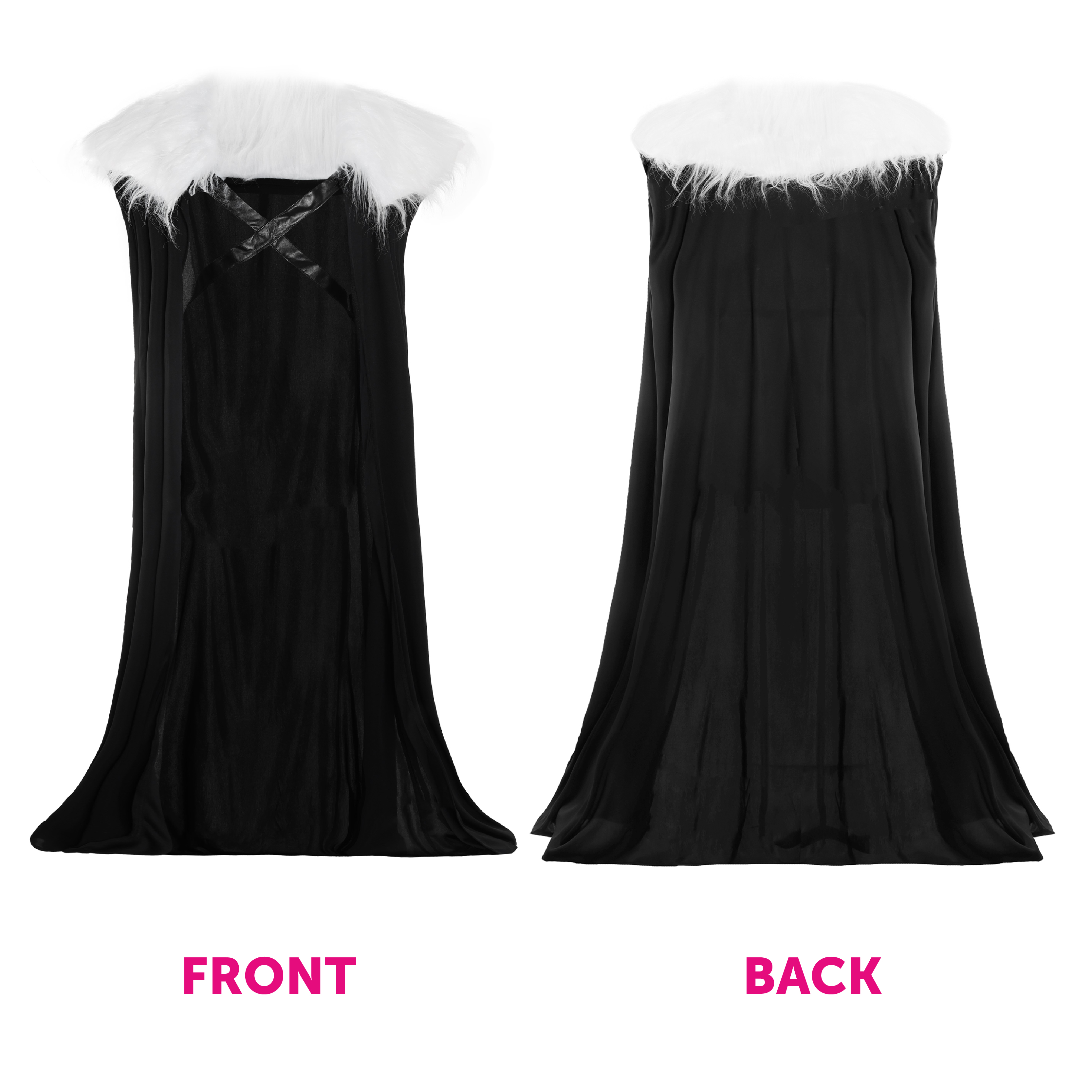 - Long Black Cloak with Faux Fur Trim: A commanding full-length cloak featuring a white faux fur collar and detailed faux leather cross-straps. Whether you're presiding over mystical challenges or guarding the path to glory, this cloak completes your transformation into a figure of myth and legend.