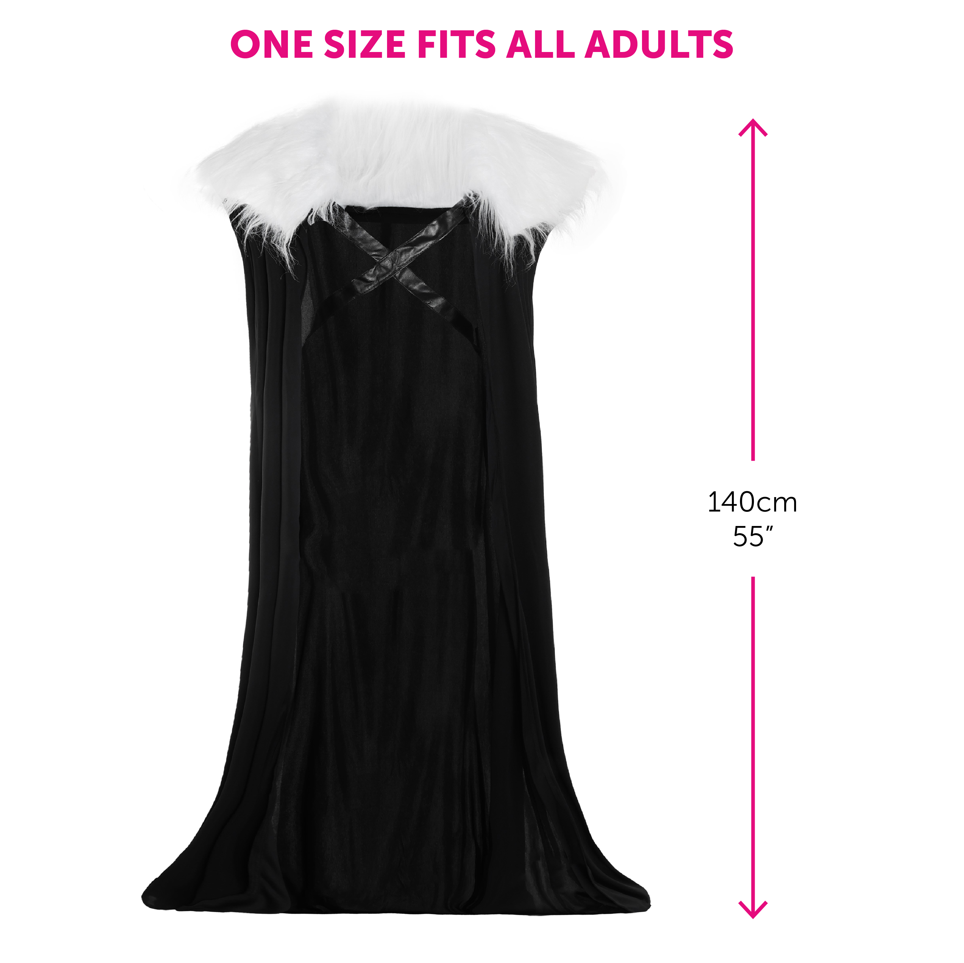 - Cloak: One size fits most adults – Chest up to 49" (124.5cm), Length: 55" (140cm)