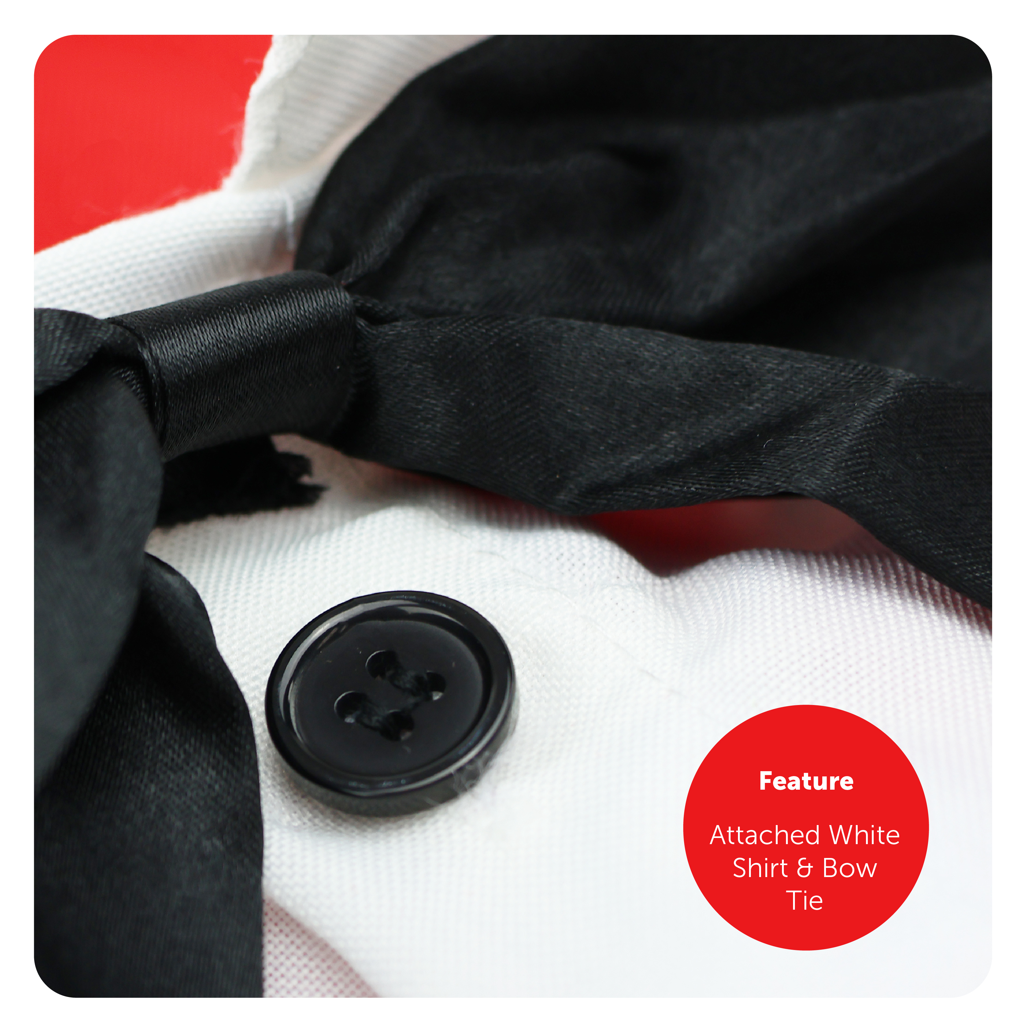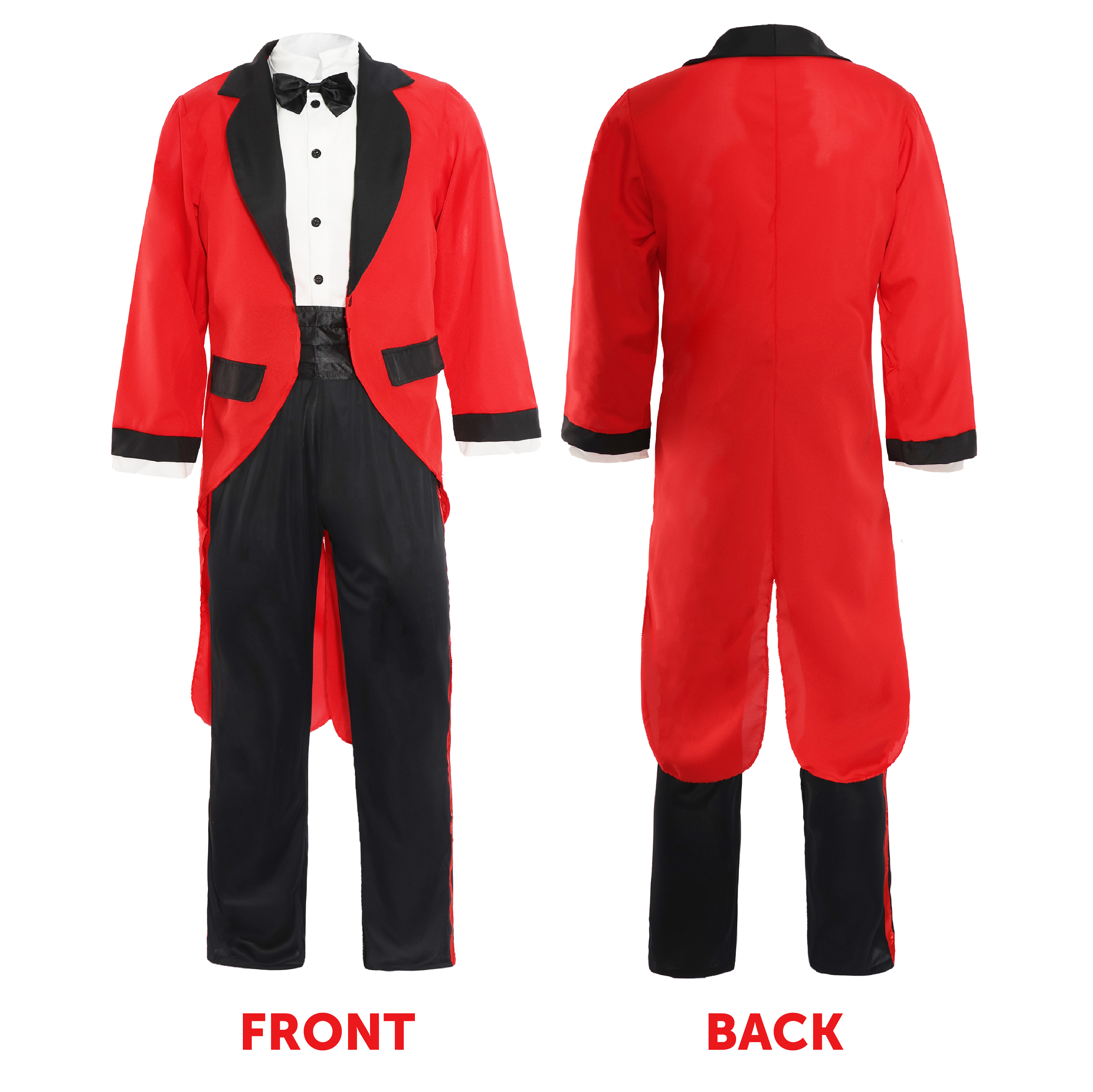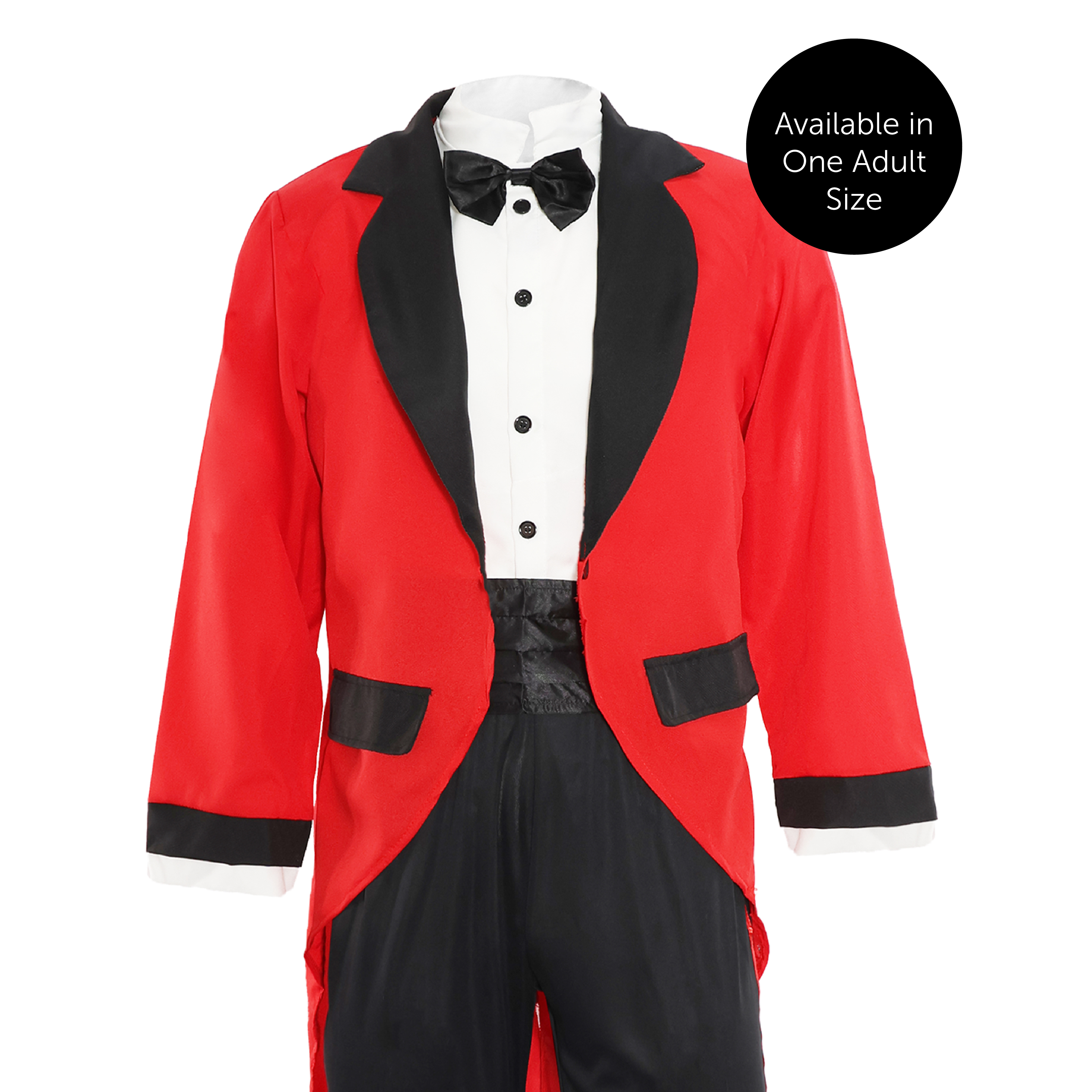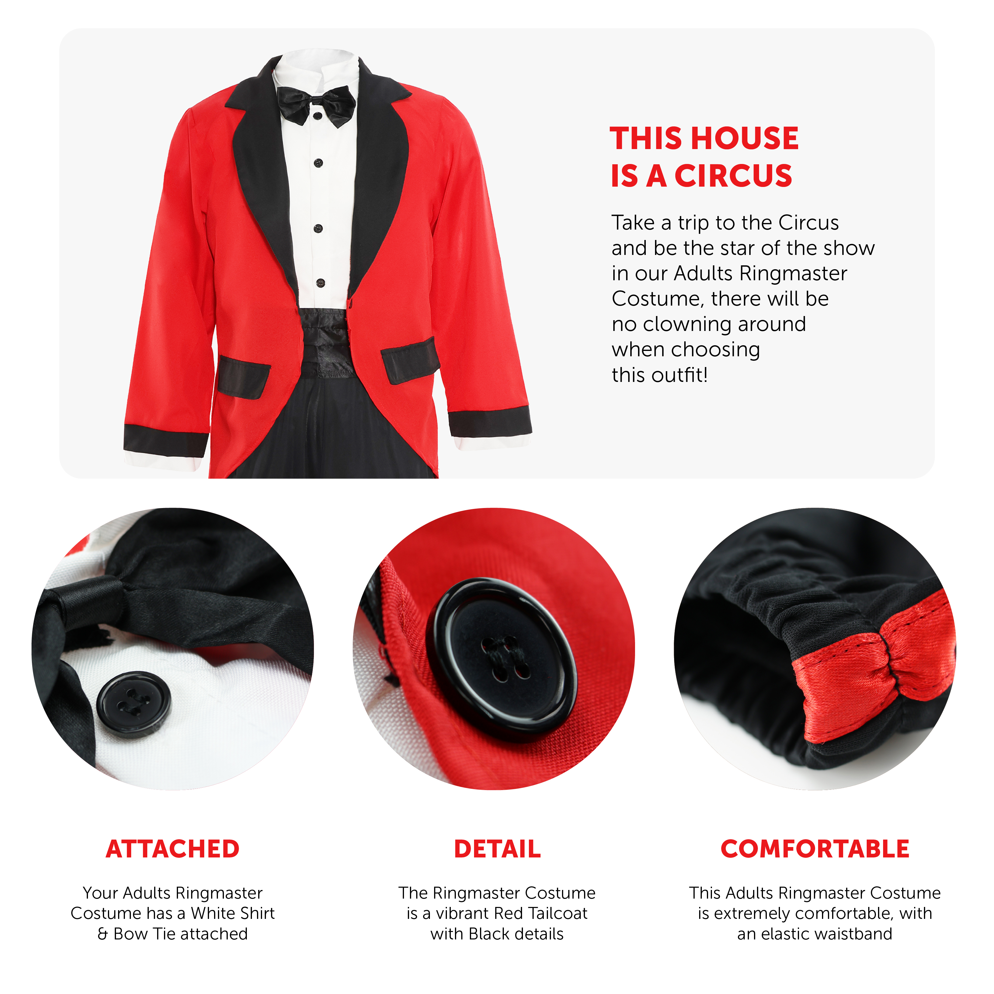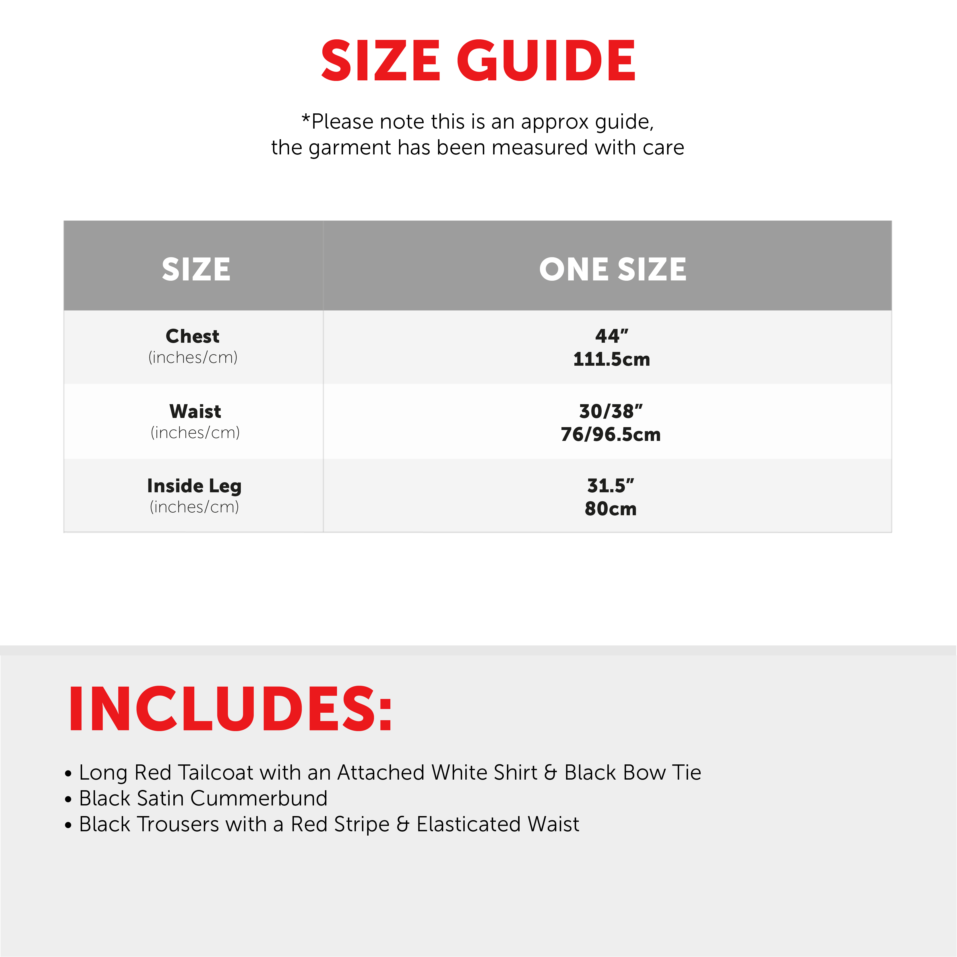 COSTUME INCLUDES: Your Adults Ringmaster Costume includes a Long Red Tailcoat with an attached White Shirt and Black Bow Tie, a Black Cummerbund, and Black Trousers with a Red Stripe down the leg and a comfortable elasticated waistband, the perfect Costume for any event!