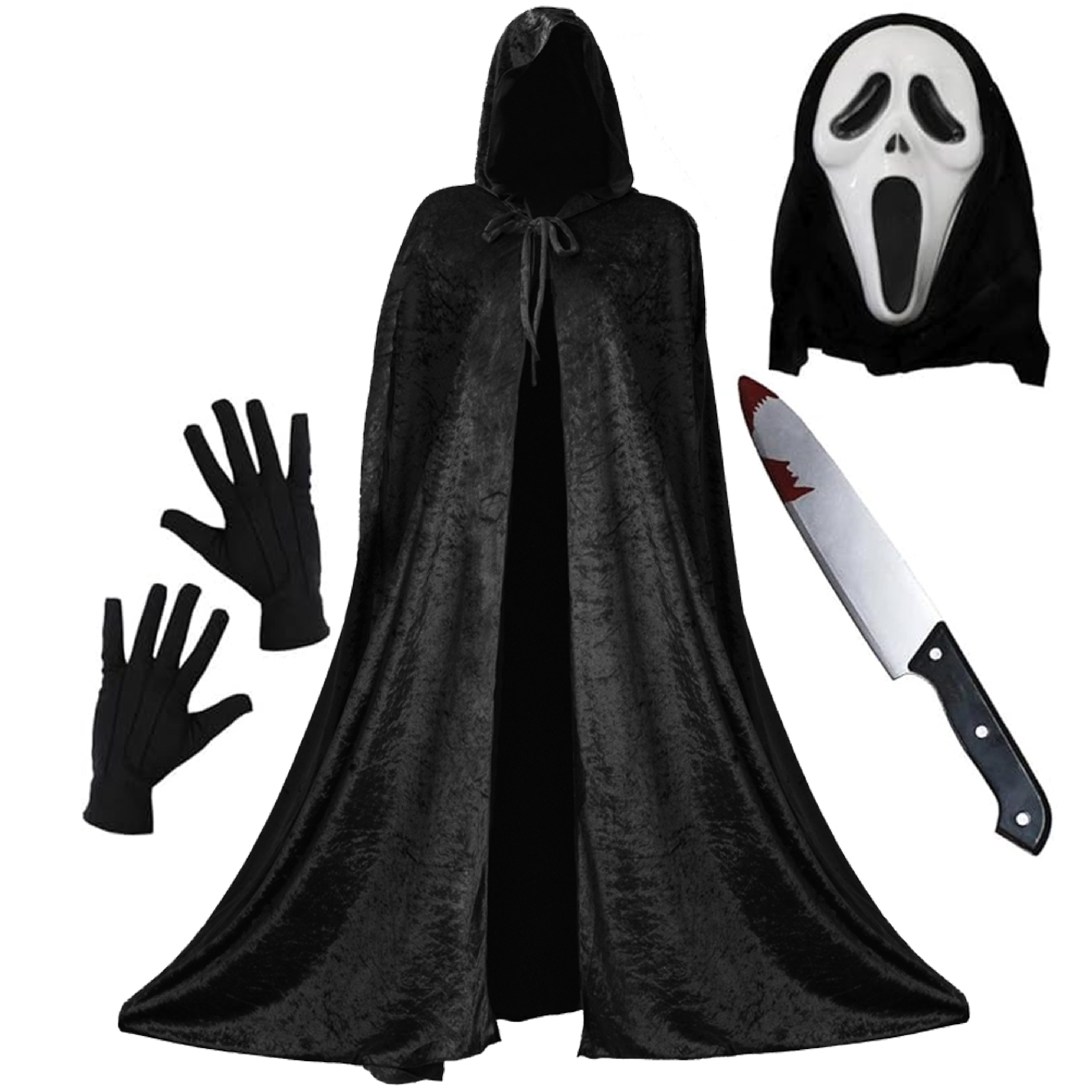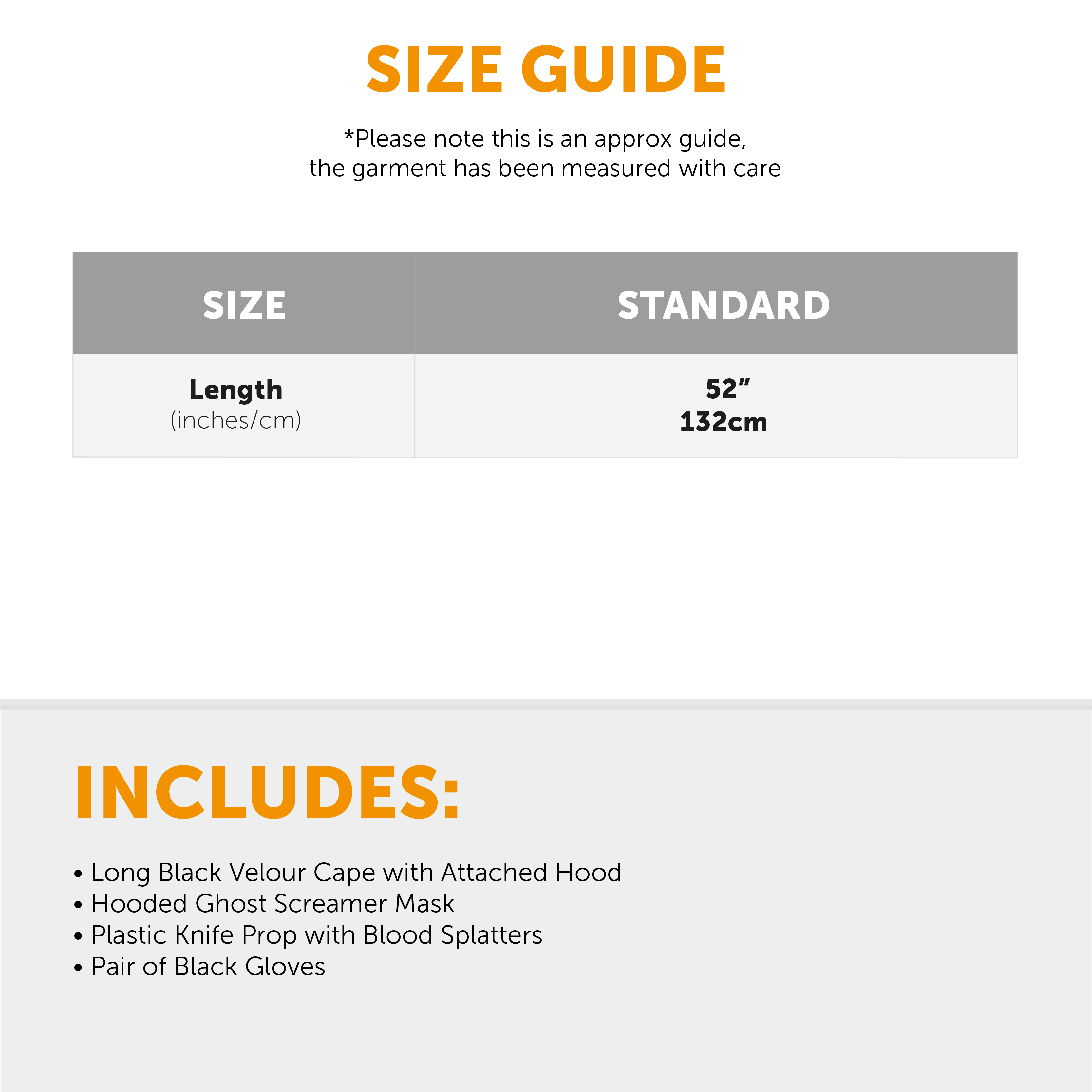 COSTUME INCLUDES: Your Adults Screamer Costume includes a long Black Hooded Velour Cape, a Hooded Ghost Face Screamer Mask, a Plastic Knife Prop with Blood Splatters, and a Pair of Black Gloves, the perfect look this Halloween!