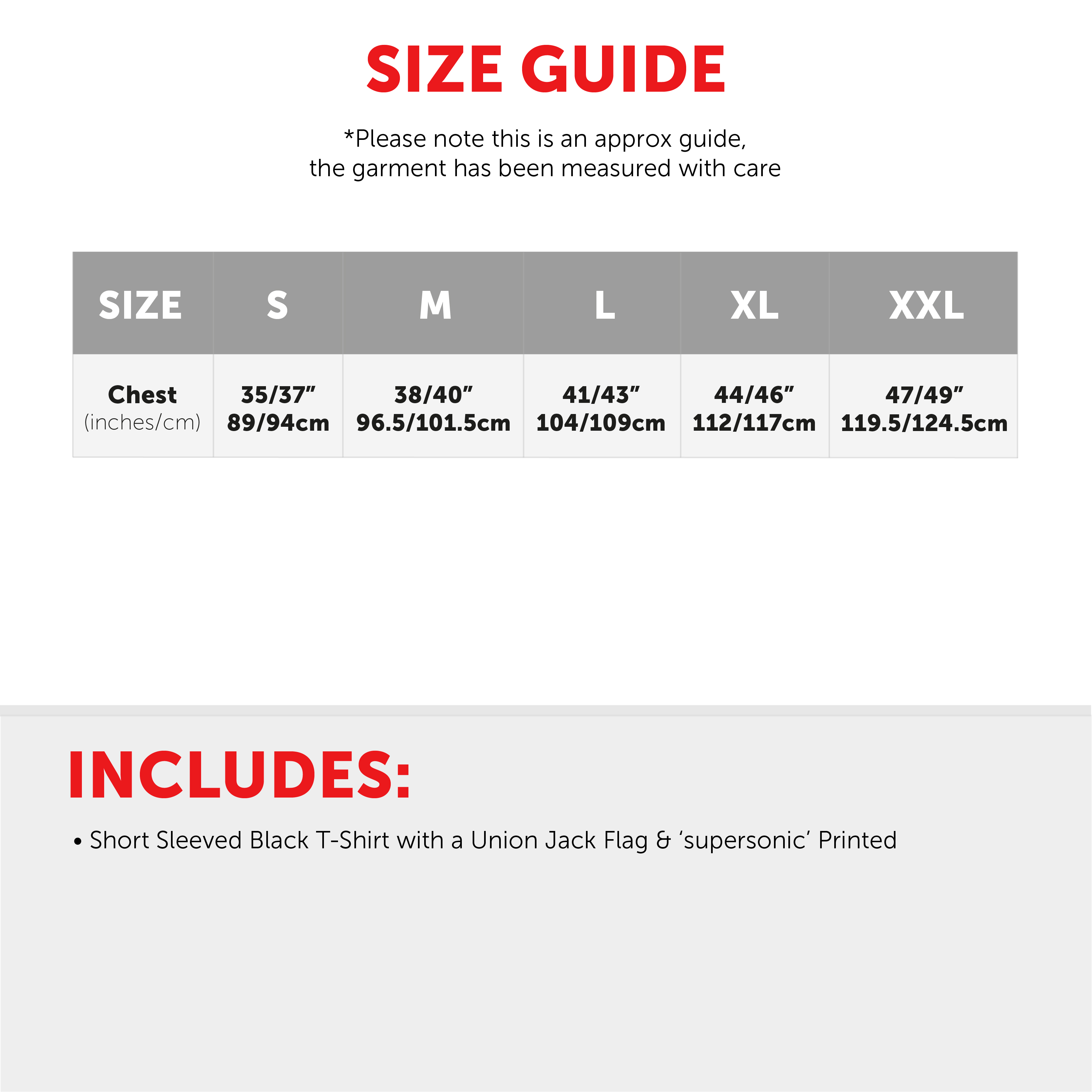 AVAILABLE IN MULTIPLE SIZES: These Adults Supersonic Union Jack T-Shirts are available in a range of sizes from Small - XX-Large: Small - Chest 35/37" (89/94cm) | Medium - Chest 38/40" (96.5/101.5cm) | Large - Chest 41/43" (104/109cm) | X-Large - Chest 44/46" (112/117cm) | XX-Large - Chest 47/49" (119.5/124.5cm)