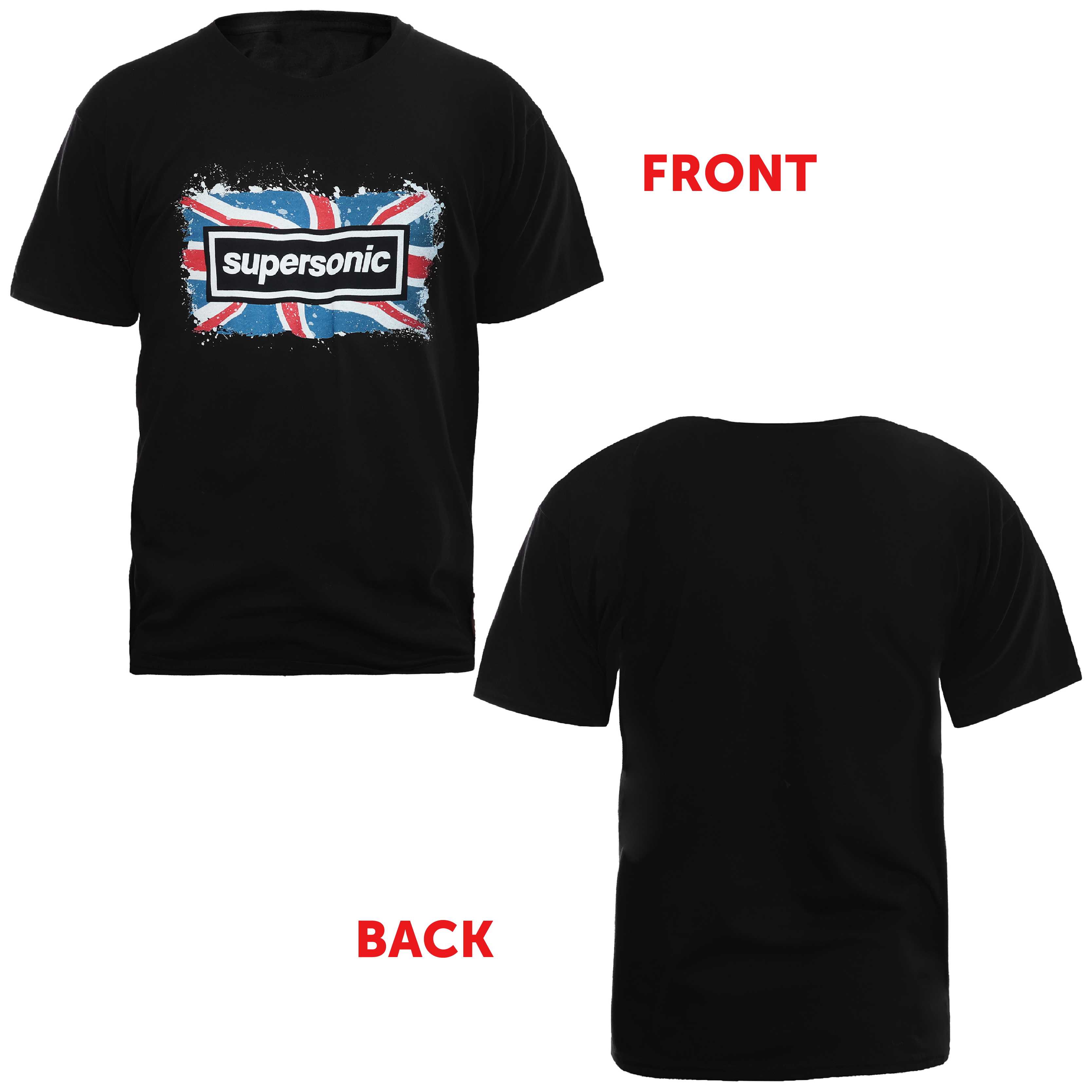 T-SHIRT DETAILS: A short sleeved Black T-Shirt with a Red, White & Blue Union Jack print, and 'supersonic' printed over the top, the perfect look for any music fan!