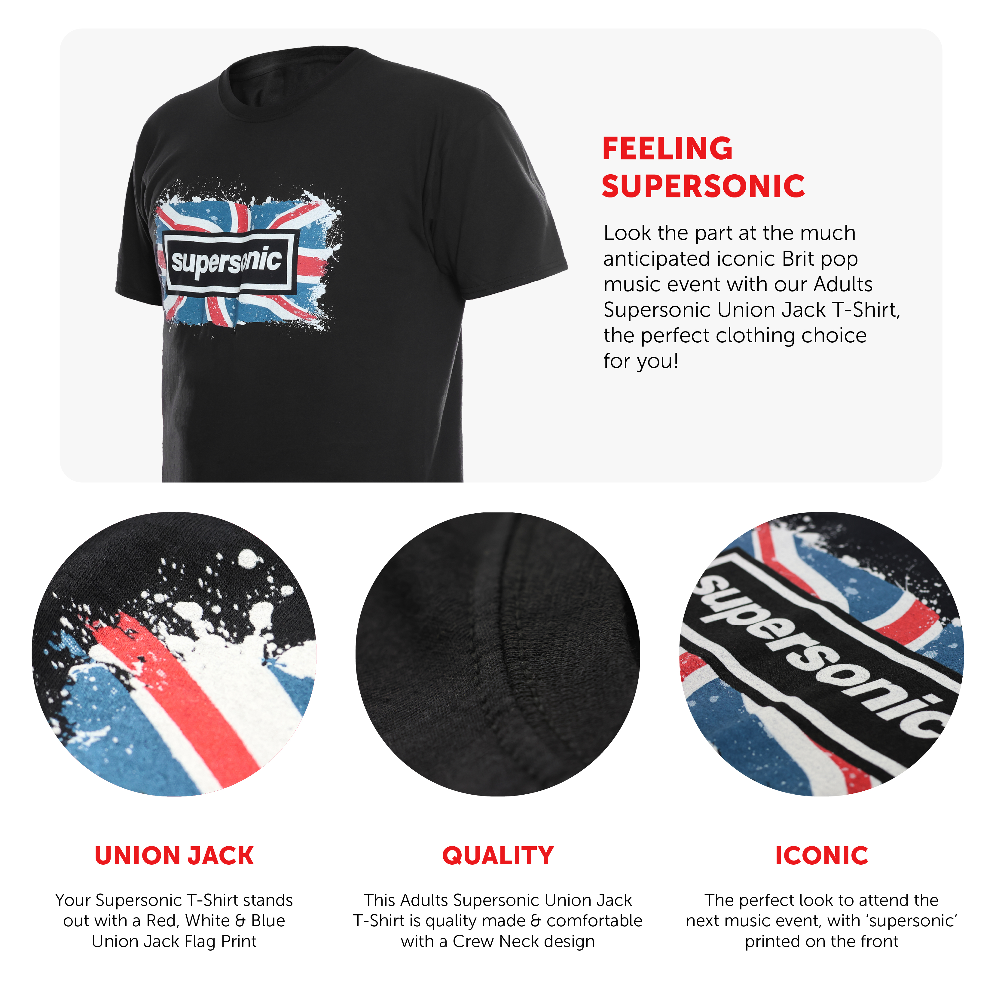 ADULTS  SUPERSONIC UNION JACK T-SHIRT: Look the part at the much anticipated iconic Britpop music event with our Adults  Supersonic Union Jack T-Shirt, the perfect clothing choice for you!