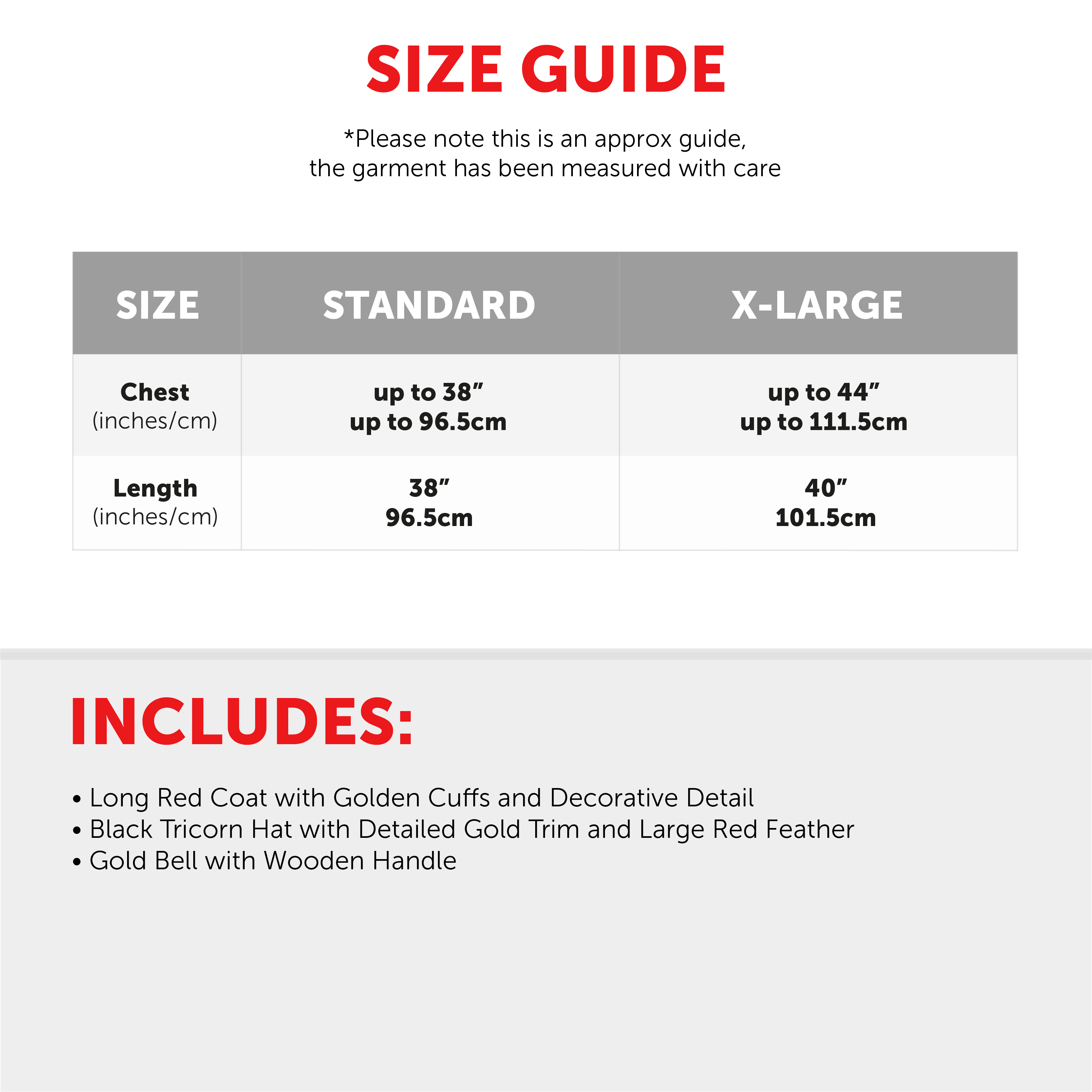 AVAILABLE IN MULTIPLE SIZES: The Adults Town Crier Costume is available in two sizes, Standard and X-Large: Standard - Chest: Up To 38" (96.5cm), Length: 38" (96.5cm) | X-Large - Chest: Up To 44" (111.5cm), Length: 40" (101.5cm)