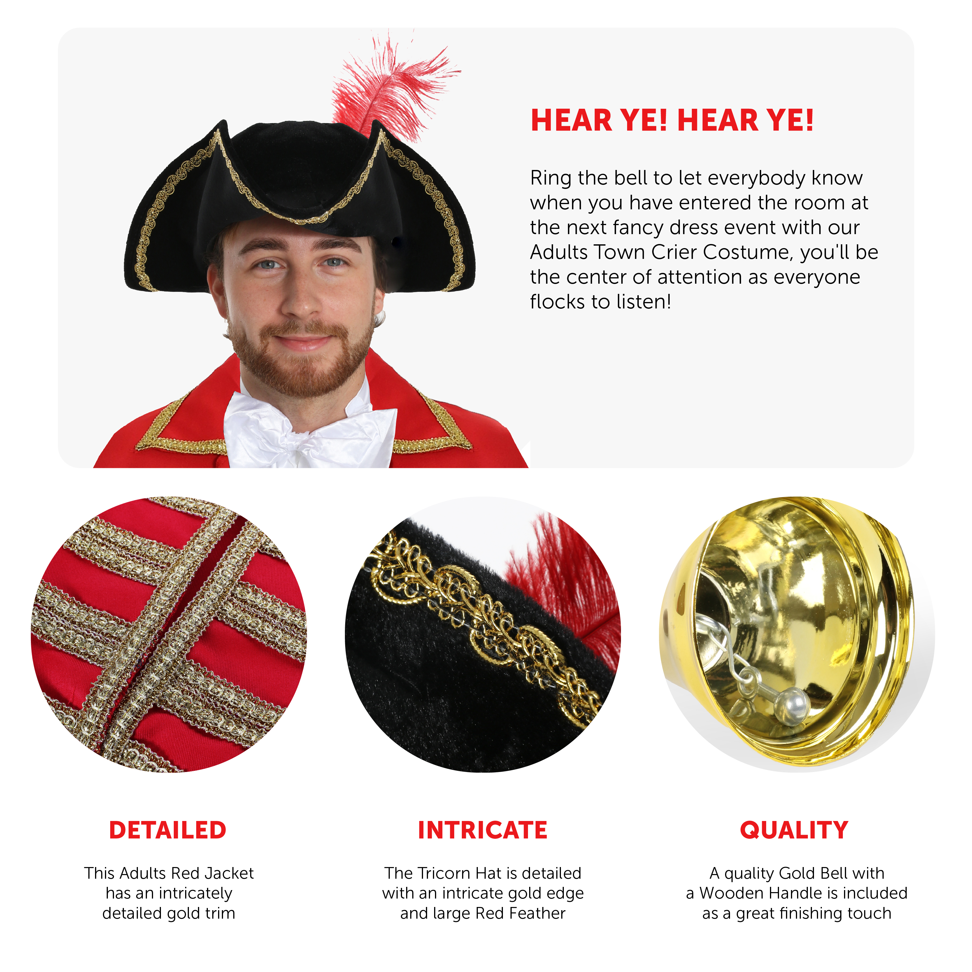 TOWN CRIER COSTUME INCLUDES: Your Adults Town Crier Costume includes a Long Red Coat with Golden Cuffs and Decorative Detail, a Black Tricorn Hat with a detailed Gold Trim and Large Red Feather, and a quality Gold Bell to finish the look!