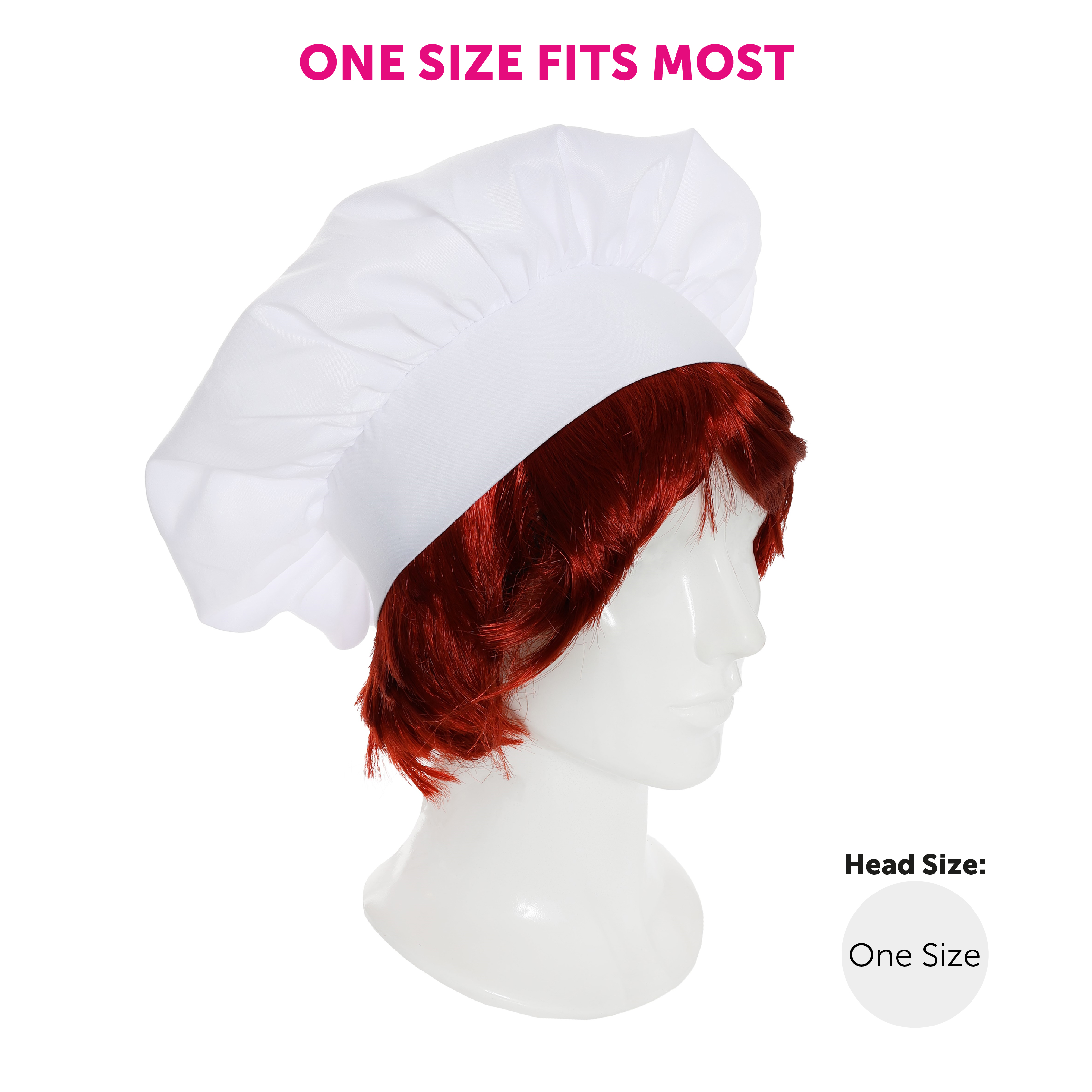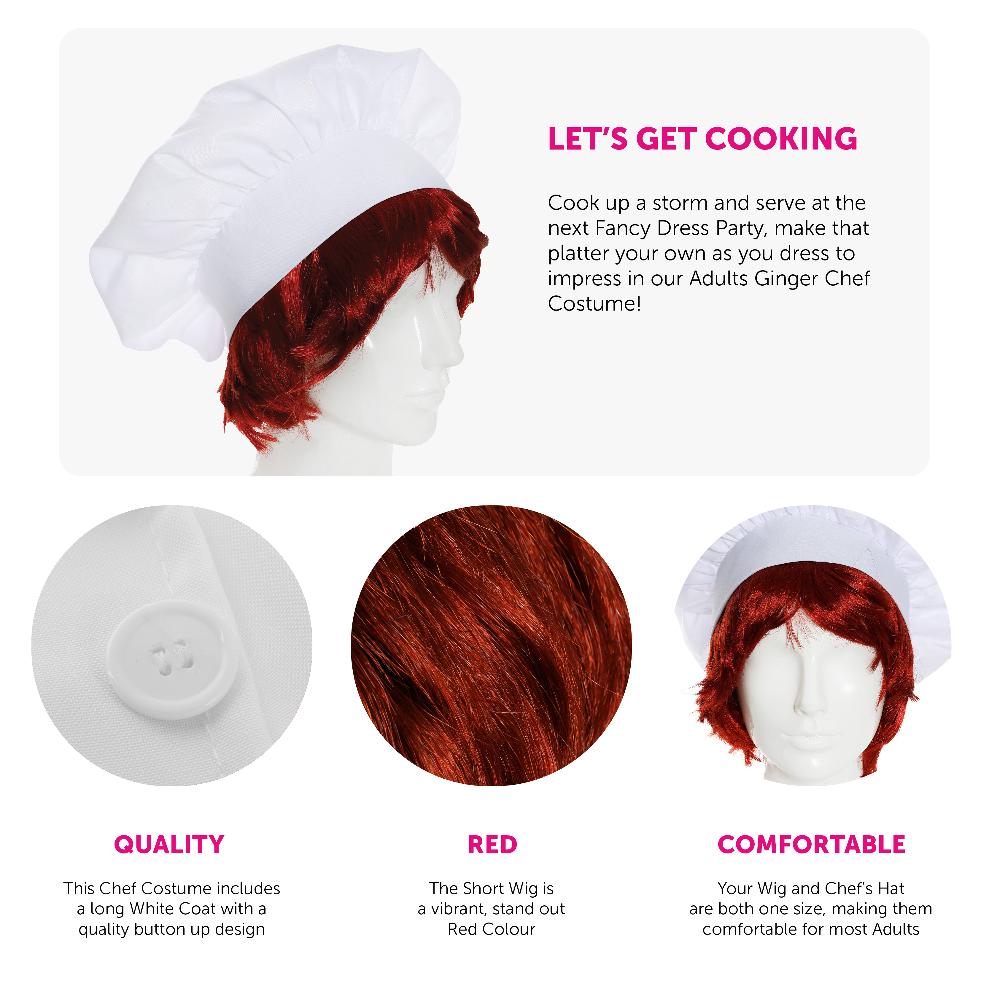 ONE SIZE FITS MOST: Your Short Ginger Wig and White Chef's Hat are both one size, meaning they are designed to suitably fit most Adults comfortably!
