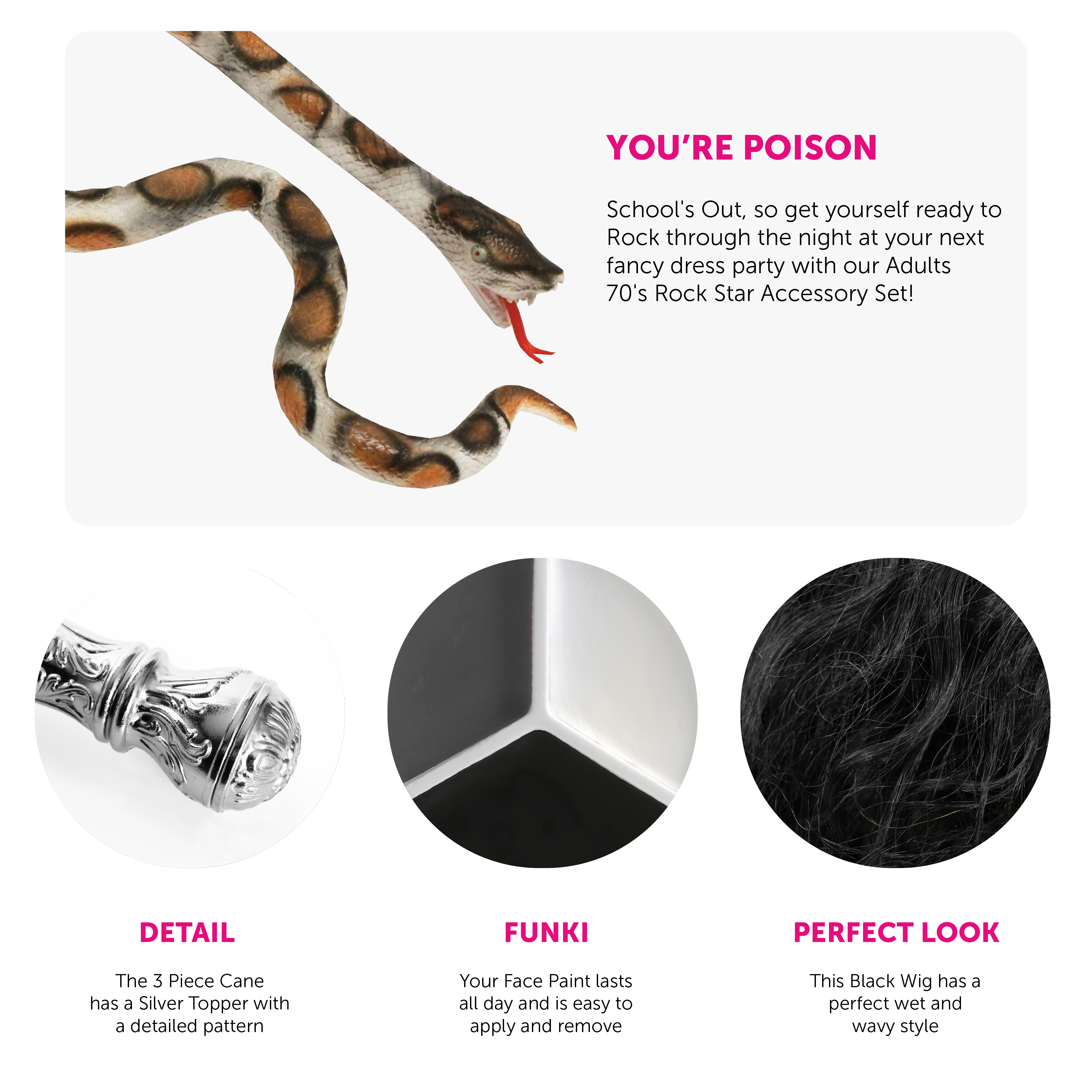 ACCESSORY SET INCLUDES: This Adults 70's Rock Star Accessory Set includes a tall, Black Top Hat, a Black Crimped style Wig, 3 Piece Screwable Cane with a detailed Silver Topper, a palette of Black, White and Grey Face Paint and a Life-Sized Latex Snake!
