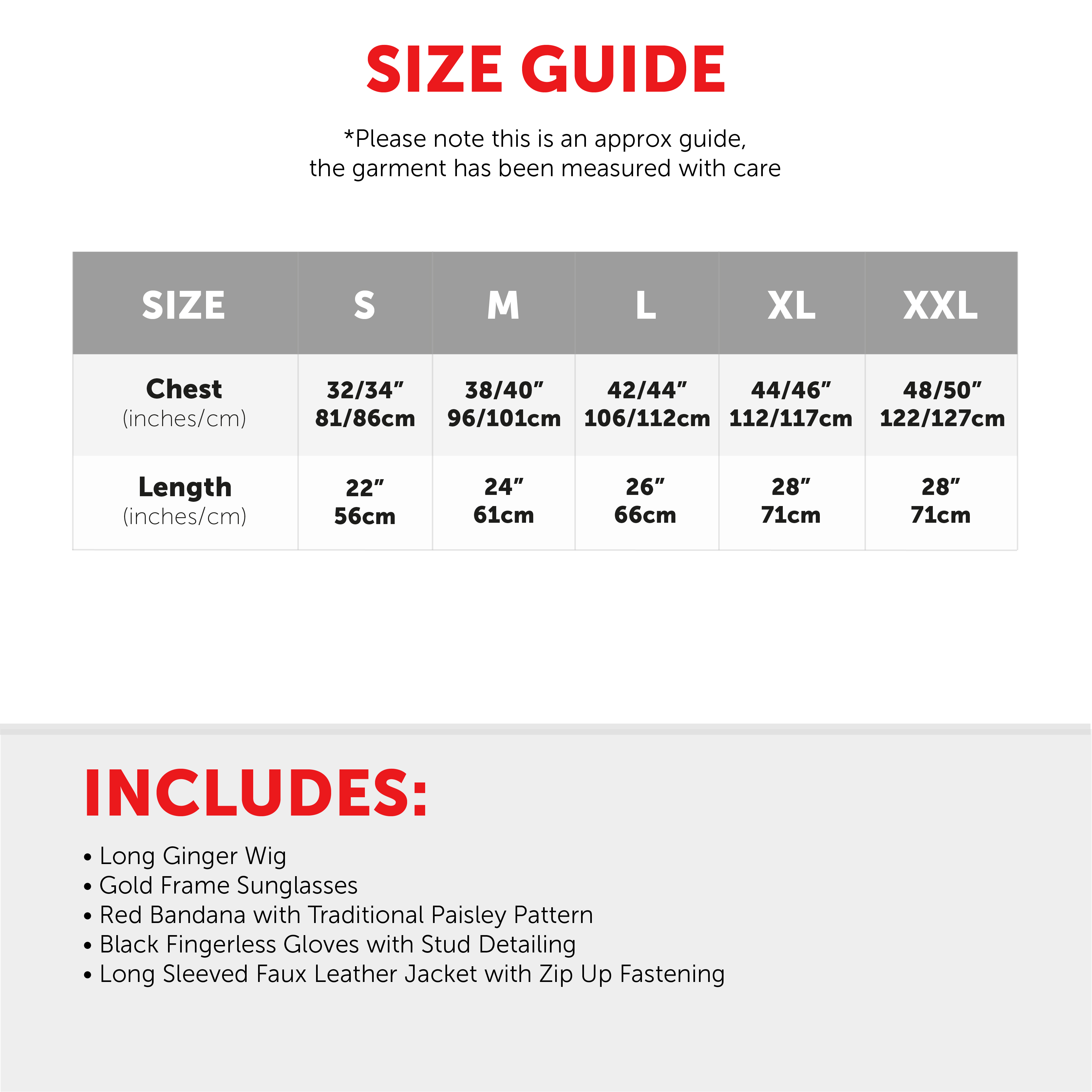 AVAILABLE IN MULTIPLE SIZES: Your Adults Leather Jacket is available in sizes Small to XX-Large: Small - Chest 32/34" (81/86cm), Length 22" (56cm) | Medium - Chest 38/40" (96/101cm), Length 24" (61cm) | Large - Chest 42/44" (106/112cm), Length 26" (66cm) | X-Large - Chest 44/46" (112/117cm), Length 28" (71cm) | XX-Large - Chest 48/50" (122/127cm), Length 28" (71cm)