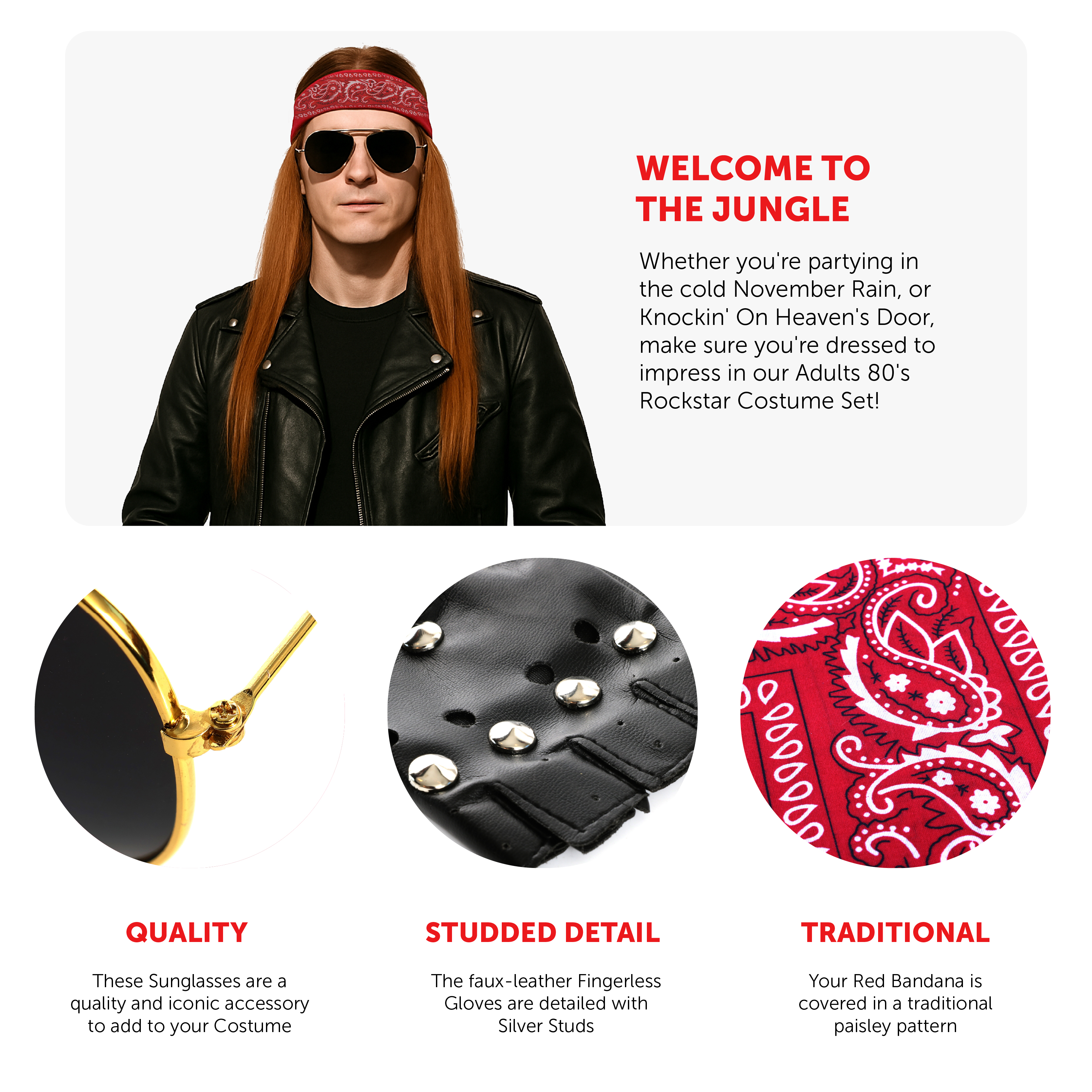 SET INCLUDES: This Costume Set includes a Long Ginger Wig, Gold Frame Sunglasses, a Red Bandana with a traditional Paisley pattern, a pair of Black Faux-Leather Fingerless Gloves with Silver Stud detailing, and a Black Faux-Leather Jacket!