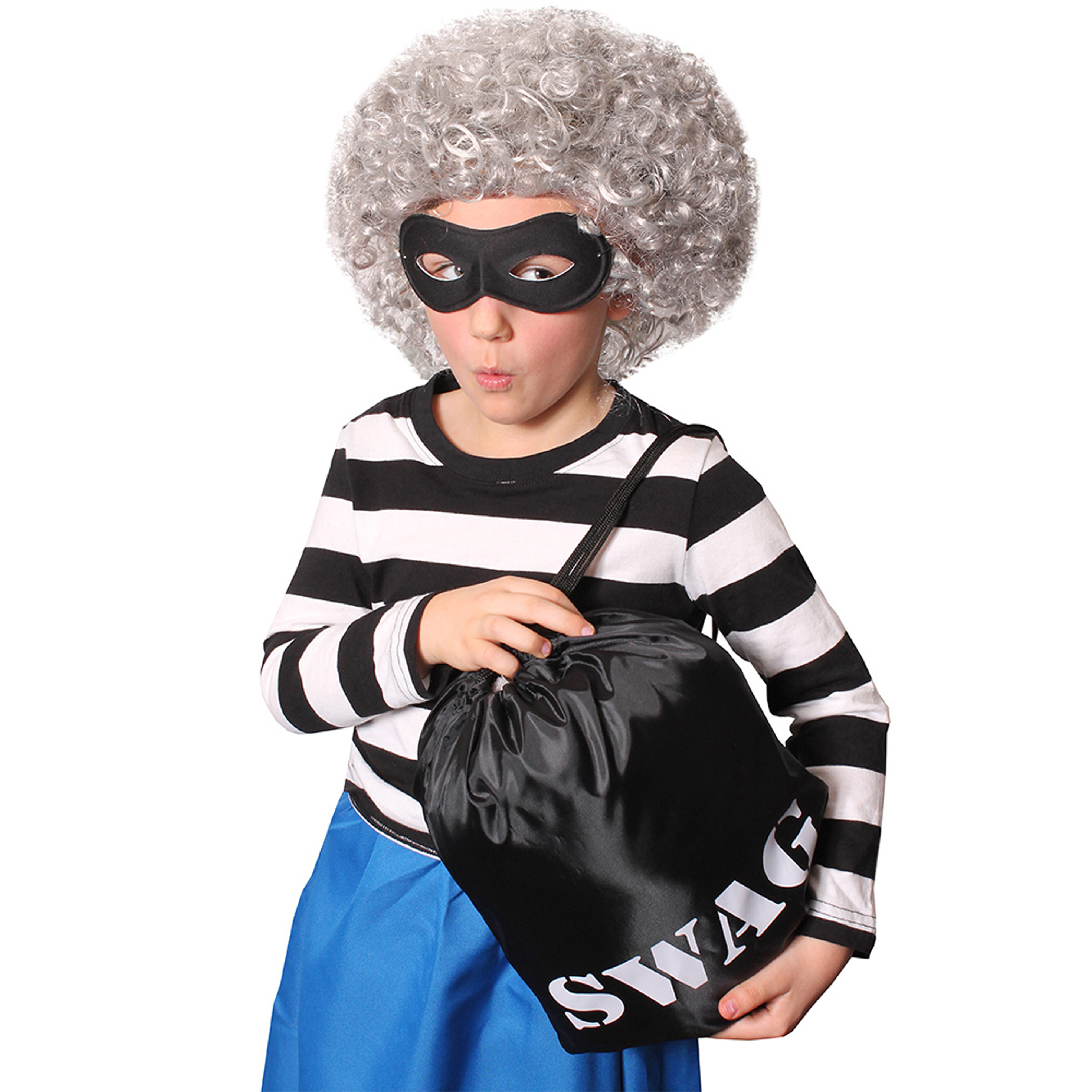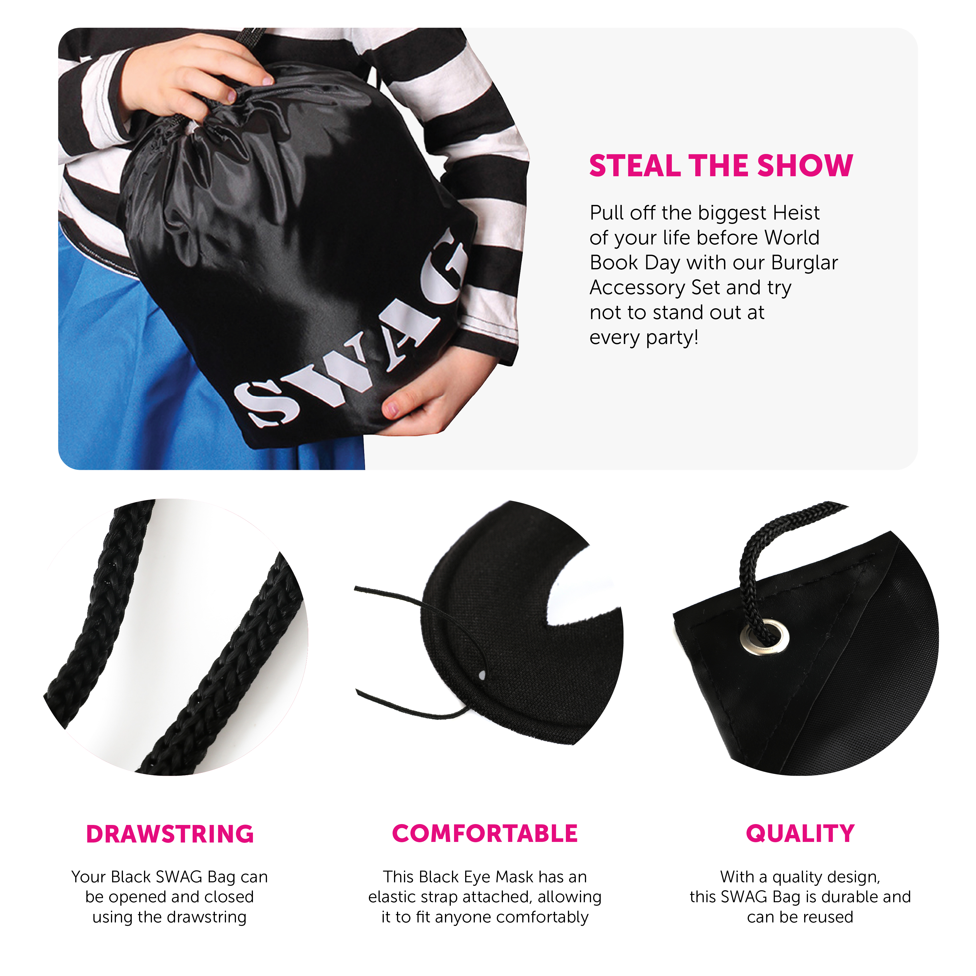 SET INCLUDES: This Burglar Accessory Set includes a Black Eye Mask on a comfortable elasticated strap, and a Black Drawstring Bag with SWAG Printed on the front, the perfect look for you this World Book Day!