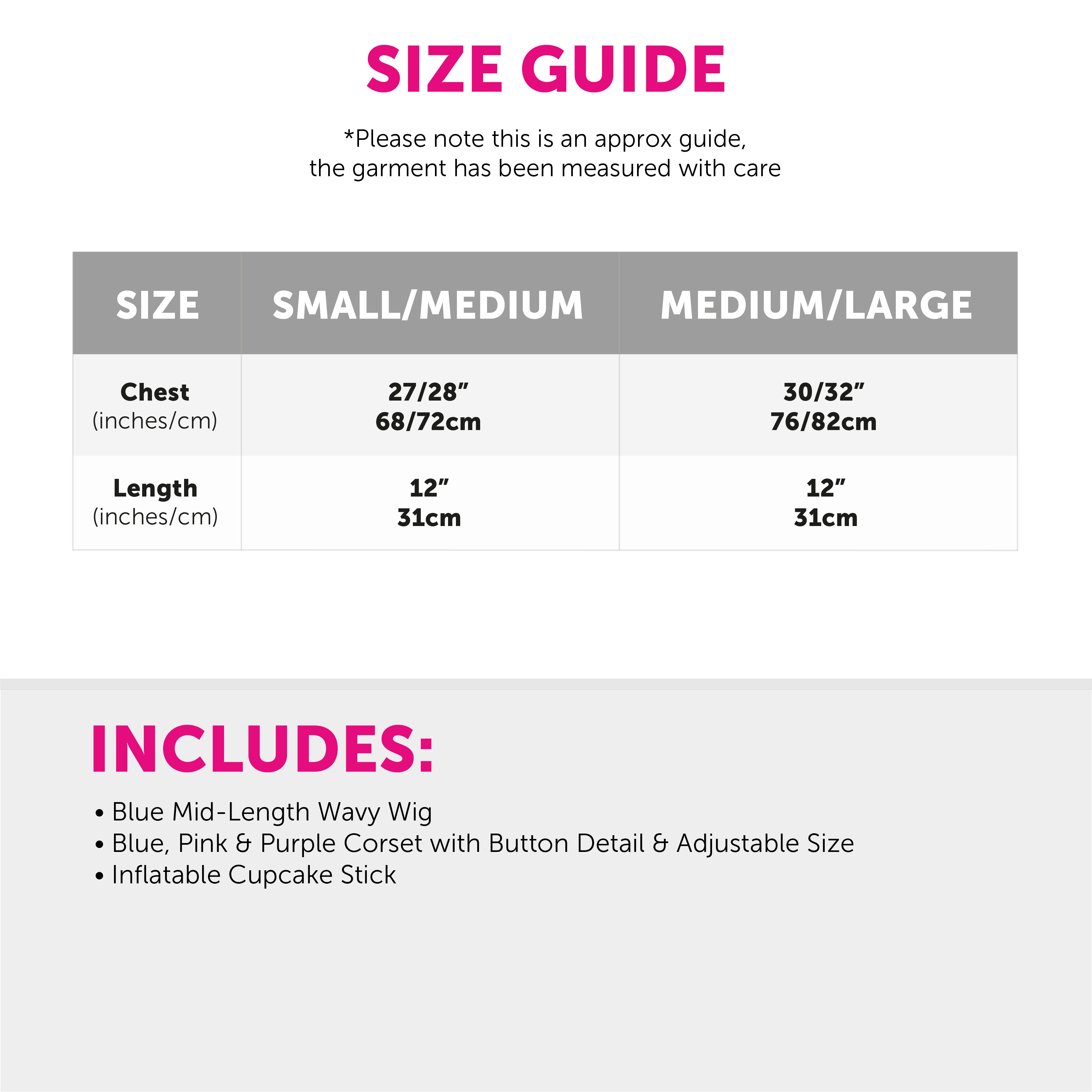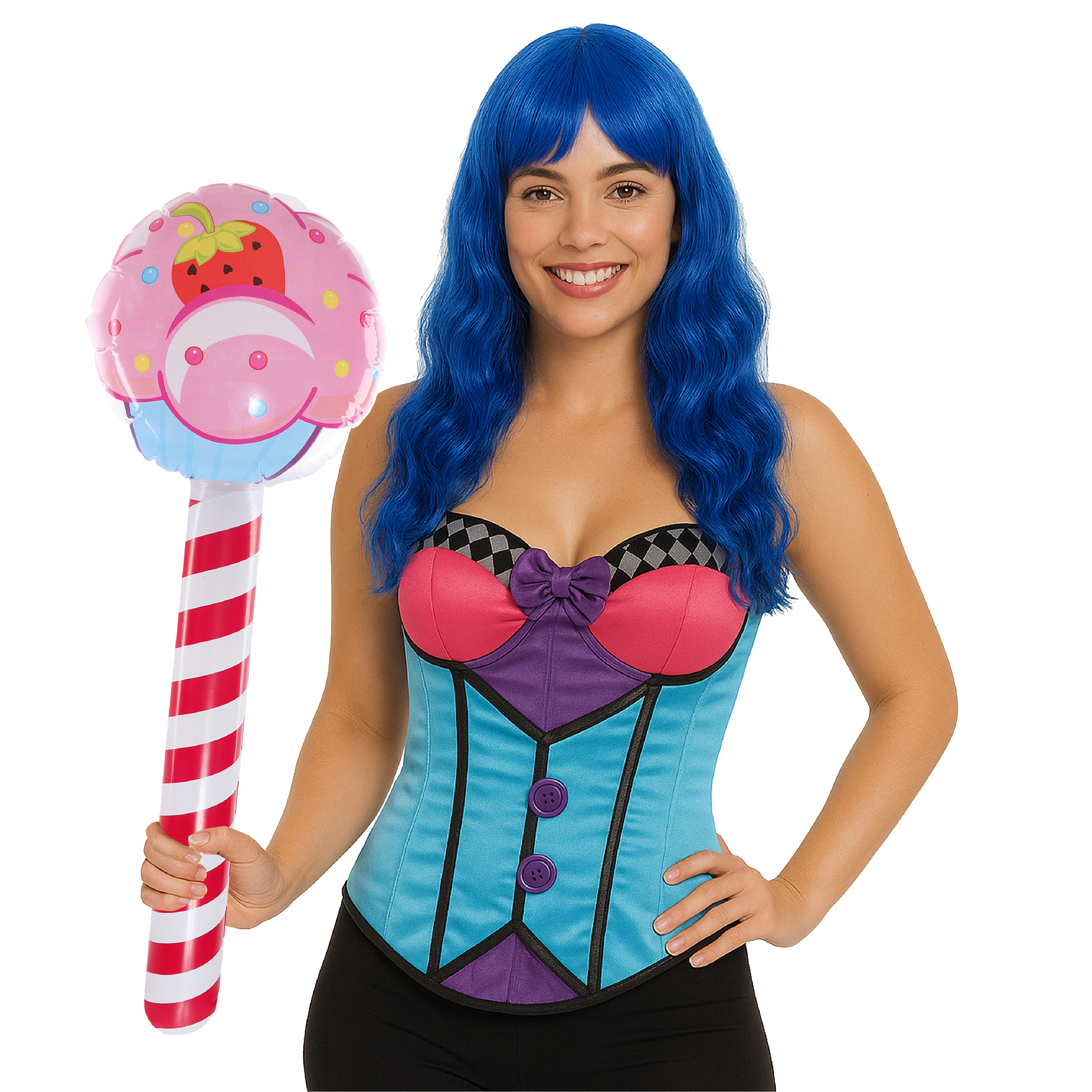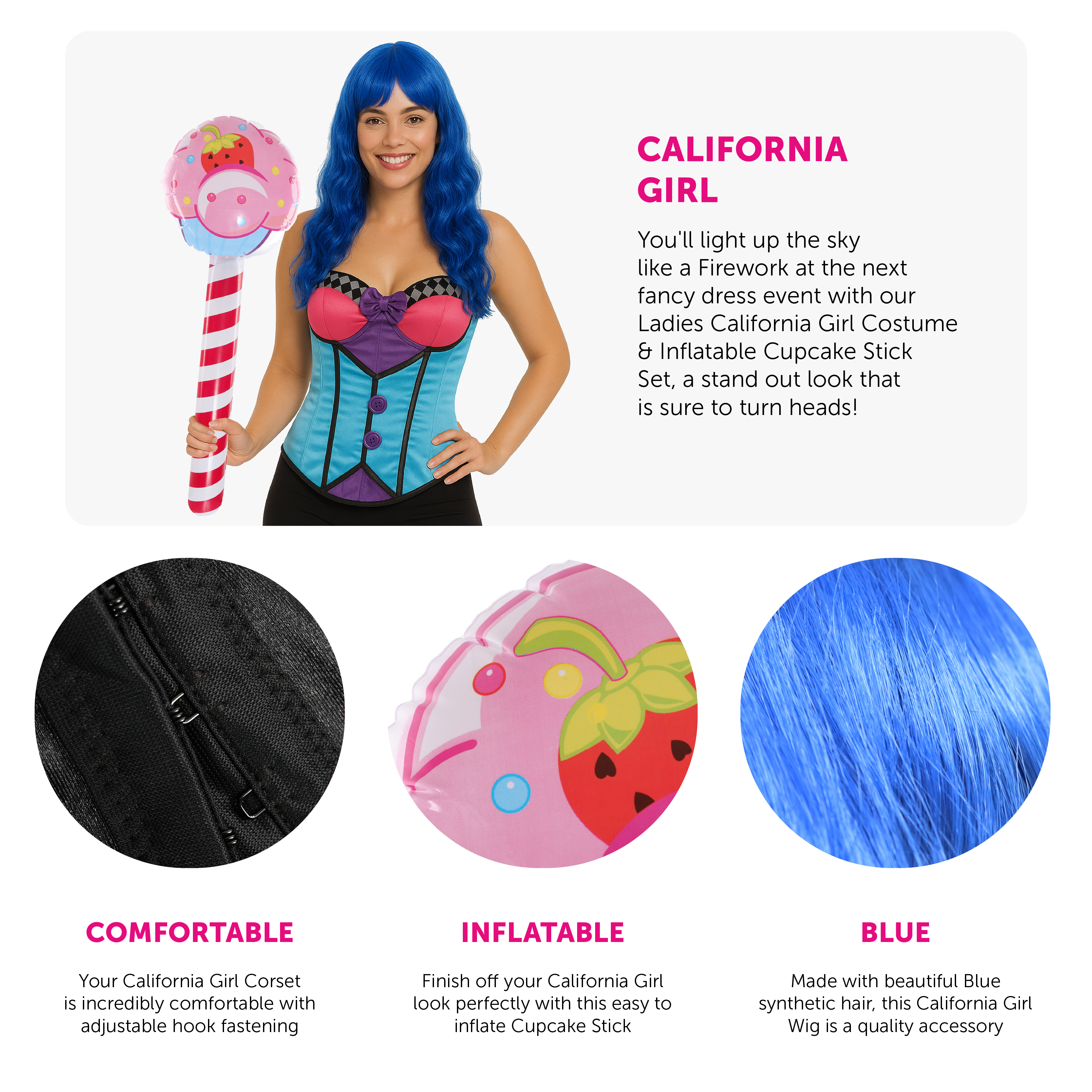 SET INCLUDES: This California Girl Costume Set includes a Mid-length Wavy Blue Wig, a bold, colourful Blue, Pink and Purple Corset with hook fastening on the back and an Inflatable Cupcake Stick, with a colourful Cupcake design, detailed with sprinkles and a Strawberry, the perfect Costume piece for music themed fancy dress events!