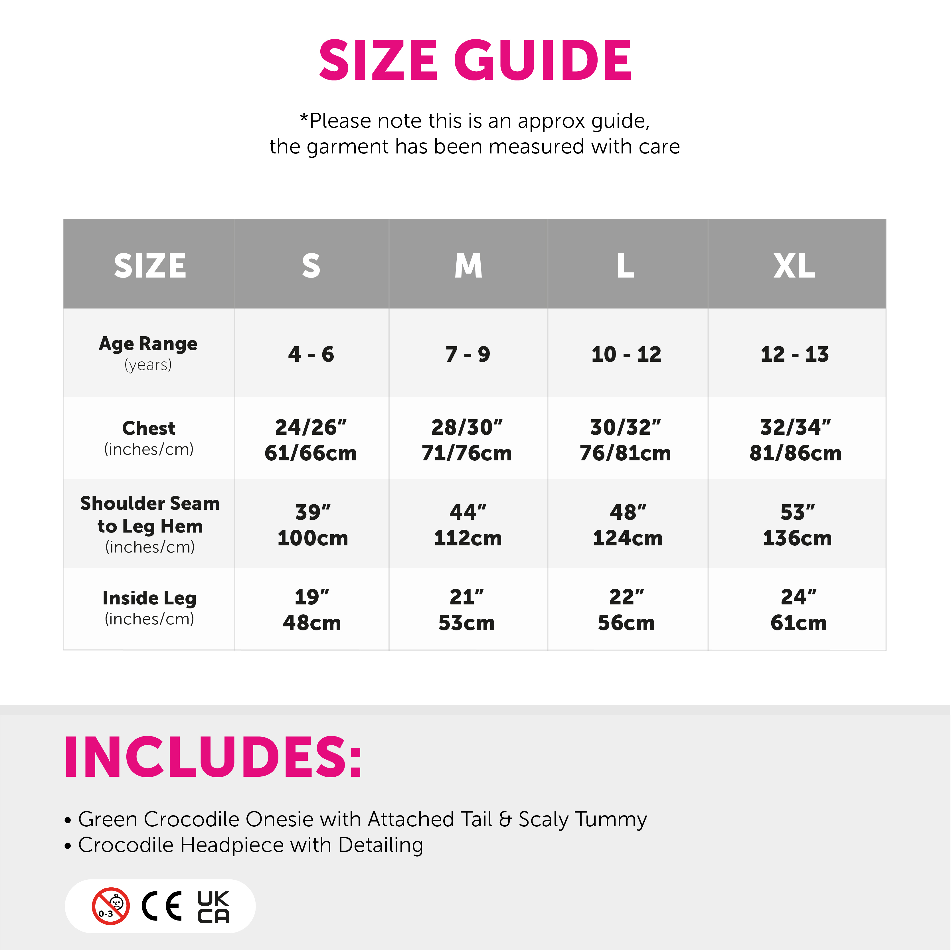 AVAILABLE IN MULTIPLE SIZES: Our Childs Crocodile Costumes are available in multiple from Small to X-Large: Small - 4-6 Years: Chest: 24-26"/cm, Shoulder Seam to Leg Hem: 39"/100cm, Inside Leg: 19"/cm | Medium - 7-9 Years: Chest: 28-30"/cm, Shoulder Seam to Leg Hem: 44"/112cm, Inside Leg: 21"/cm | Large - 10-12 Years: Chest: 30-32"/cm, Shoulder Seam to Leg Hem: 48"/124cm, Inside Leg: 22"/cm | X-Large - 12-13 Years: Chest: 32-34"/cm, Shoulder Seam to Leg Hem: 53"/136cm, Inside Leg: 24"/cm