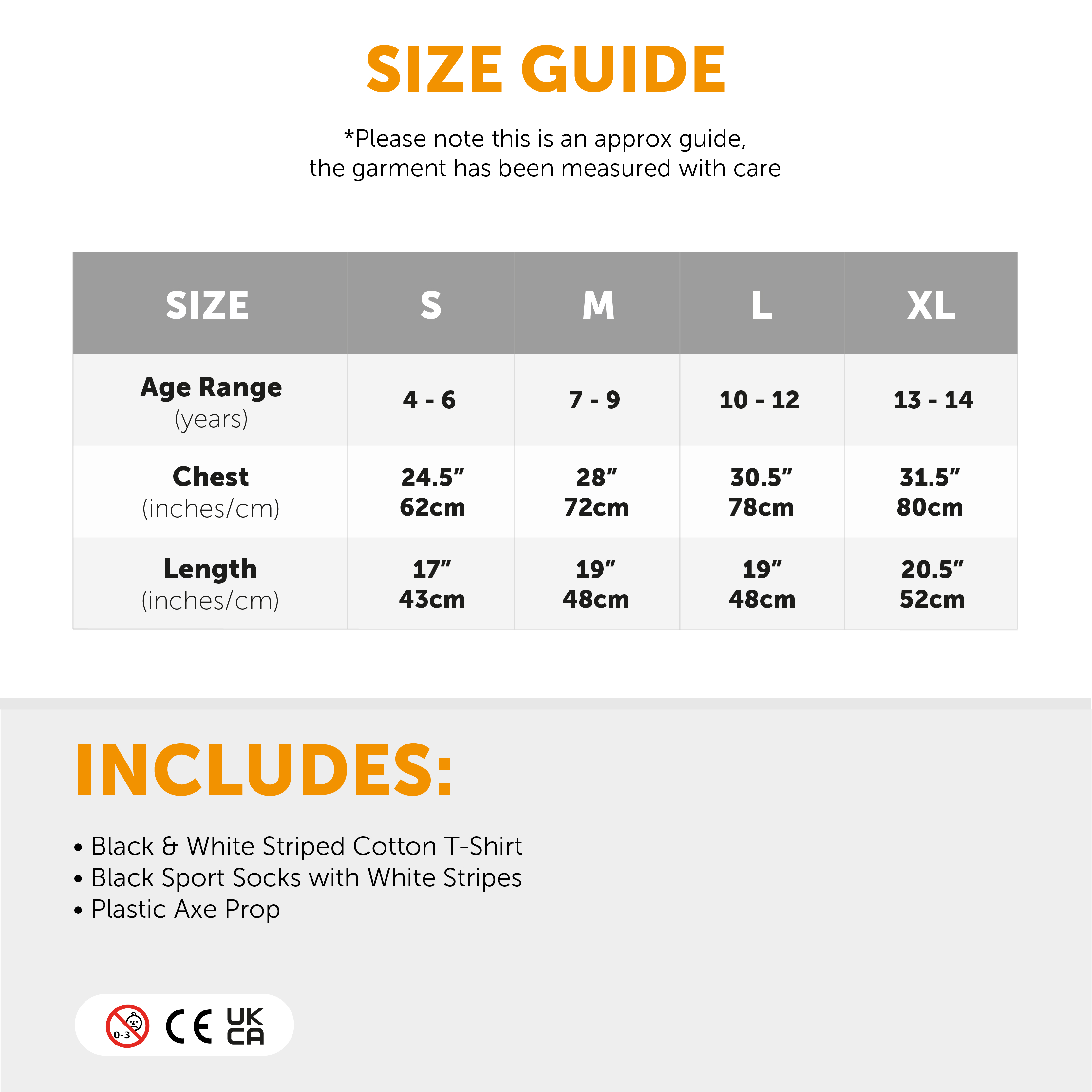 AVAILABLE IN MULTIPLE SIZES: This Child's Pugsley Costume is available in a range of sizes from Small to X-Large: Small (4 - 6 years) Chest 24.5" (62cm), Length 17" (43cm) | Medium (7 - 9 years) Chest 28" (72cm), Length 19" (48cm) | Large (10 - 12 years) Chest 30.5" (78cm), Length 19" (48cm) | X-Large (13 - 14 years) Chest 31.5" (80cm), Length 20.5" (52cm)