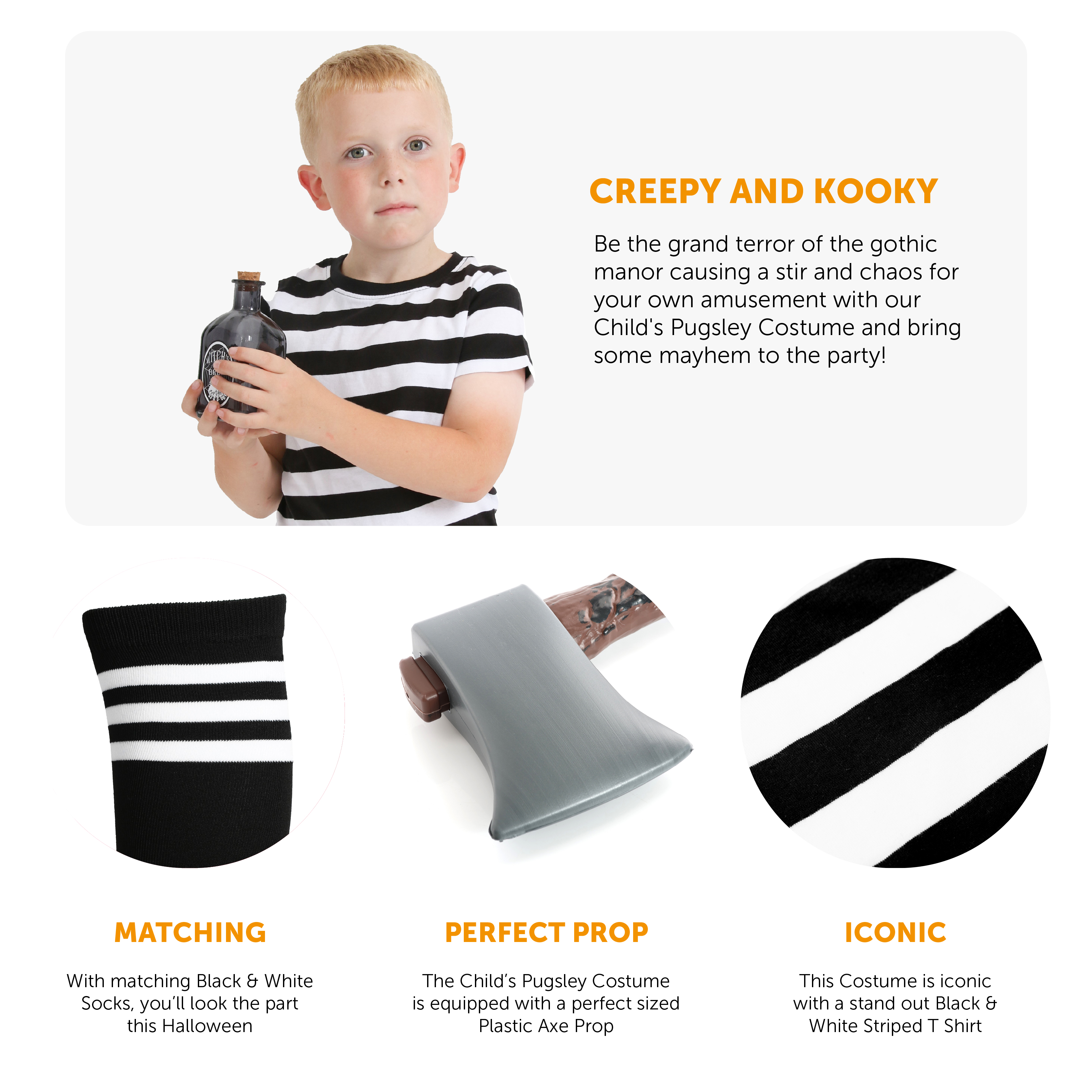 COSTUME DETAILS: Your Child's Pugsley Costume includes a Black and White Striped, Short Sleeved T Shirt, a Plastic Axe Prop and a pair of Black Socks with White Stripes, the perfect costume set!