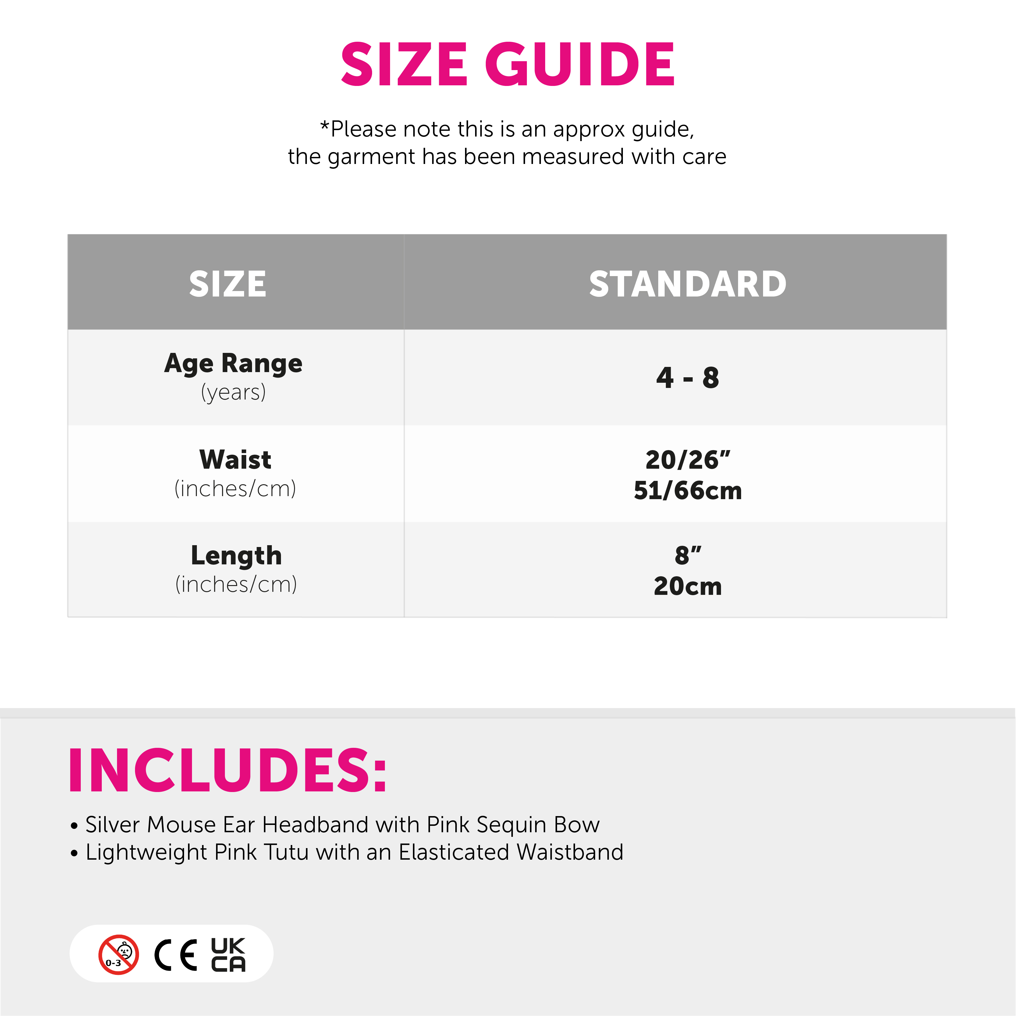 COSTUME INCLUDES: The Child's Mouse Ballerina Costume includes a Silver Headband with sparkly, Silver Mouse Ears attached and a Pink Bow in the middle, and a vibrant Pink Tutu with netted Pink layers and an elasticated waistband, the perfect look for you this World Book Day!