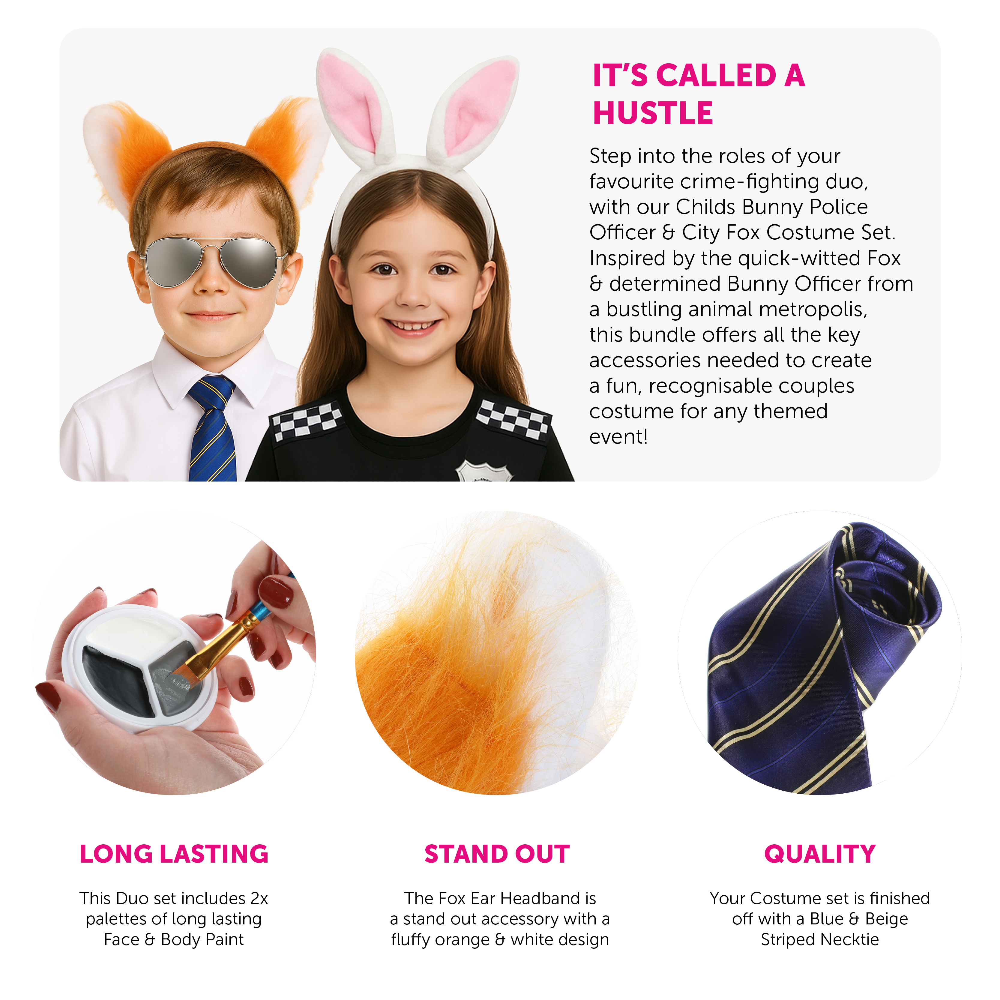SET INCLUDES: This Childs Duo Costume Set includes a White & Pink Bunny Ear Headband with a White Bunny Tail, a Black Police Vest with Checkered Black & White details, a metal pin badge with a large star and 'Special Police' on the front, an Orange fluffy Fox Ear Headband, a Blue & Beige Striped Necktie, a fluffy Orange Fox Tail, a pair of Silver Reflective Sunglasses, a palette of Orange & White Face and Body Paint, and a palette of Black, Grey & White Face and Body Paint, the perfect way to finish off your outfit!