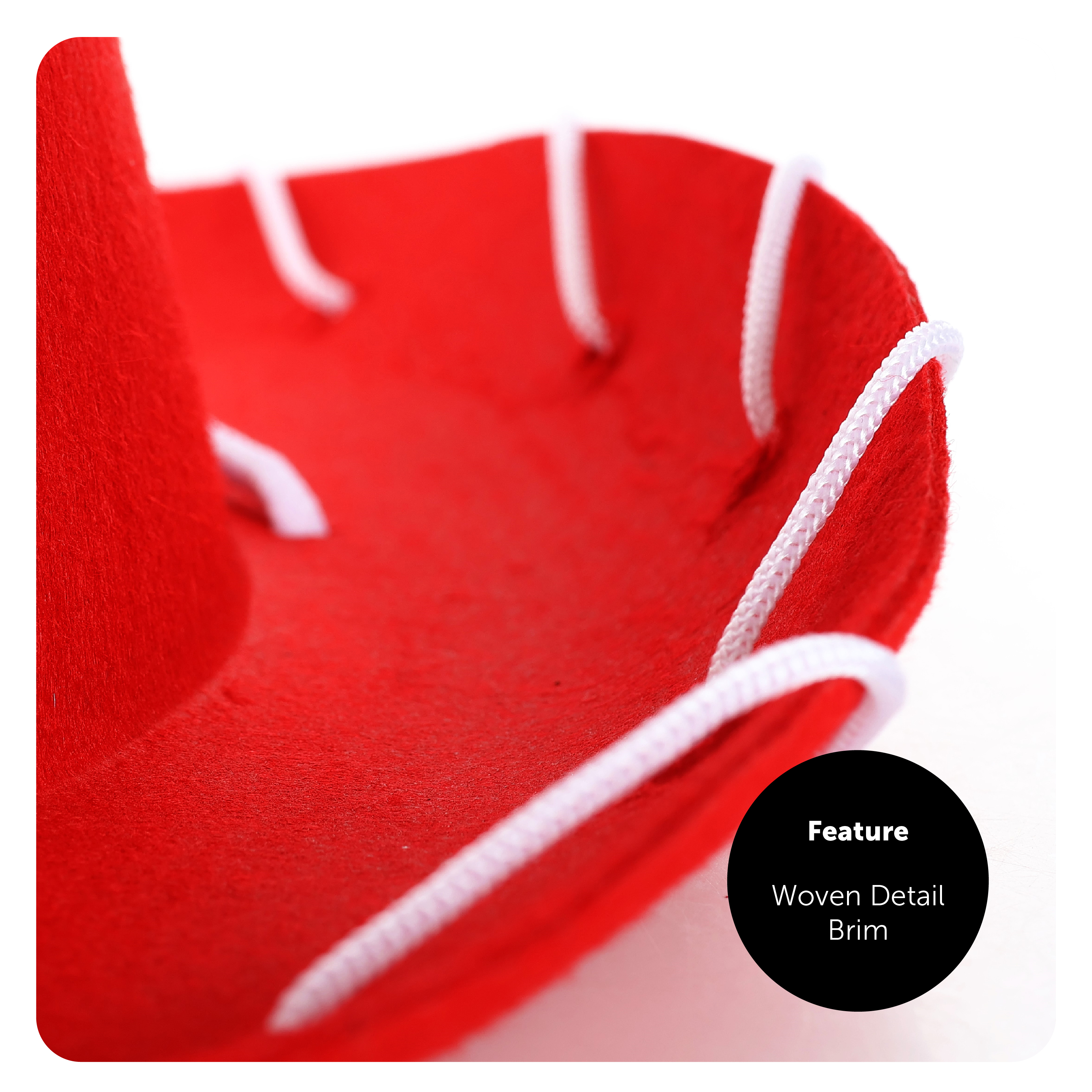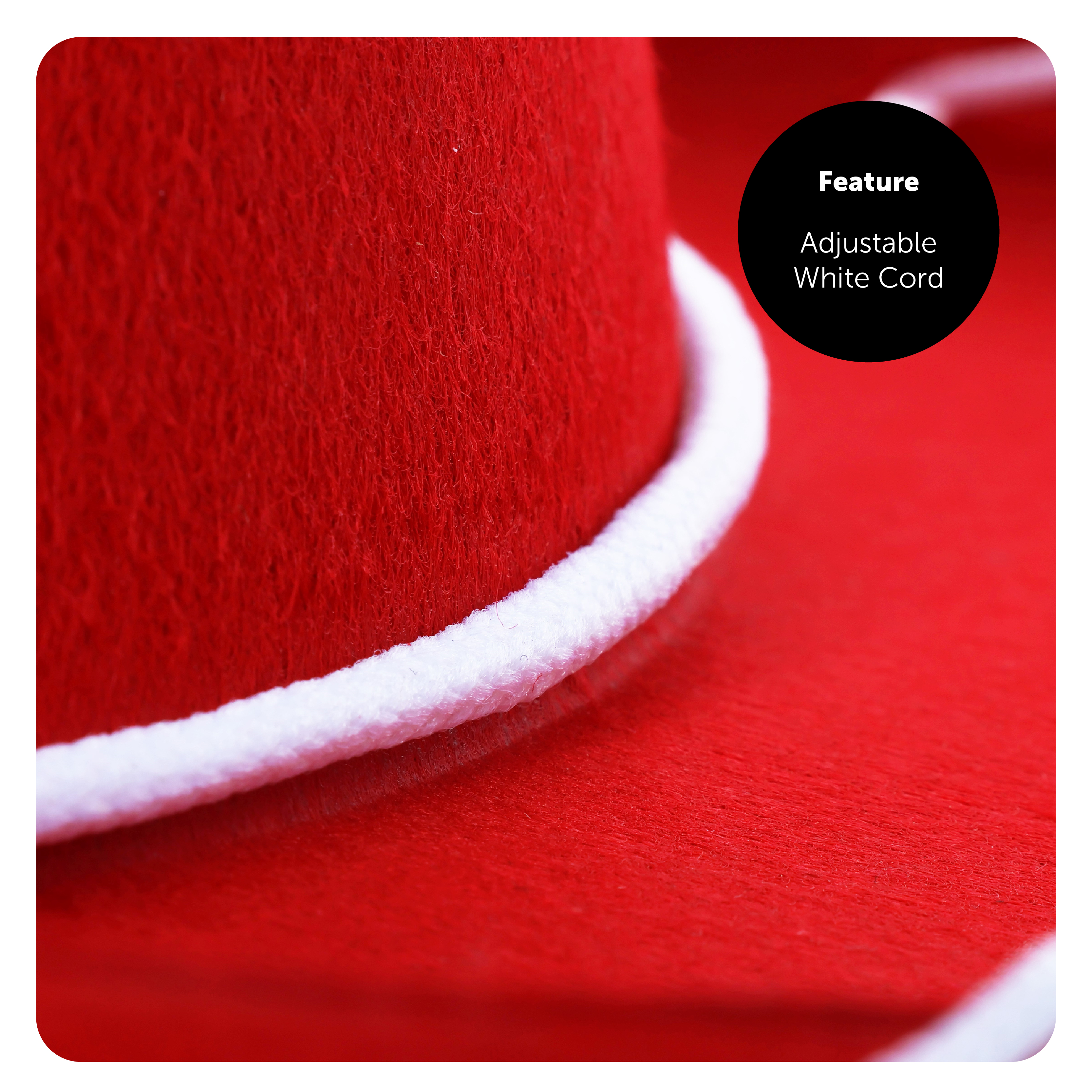 HAT DETAILS: The Child's Cowboy Hat is a sturdy Red felt Cowboy Hat with thin White Rope woven around the brim and an adjustable White Cord for the perfect fit!