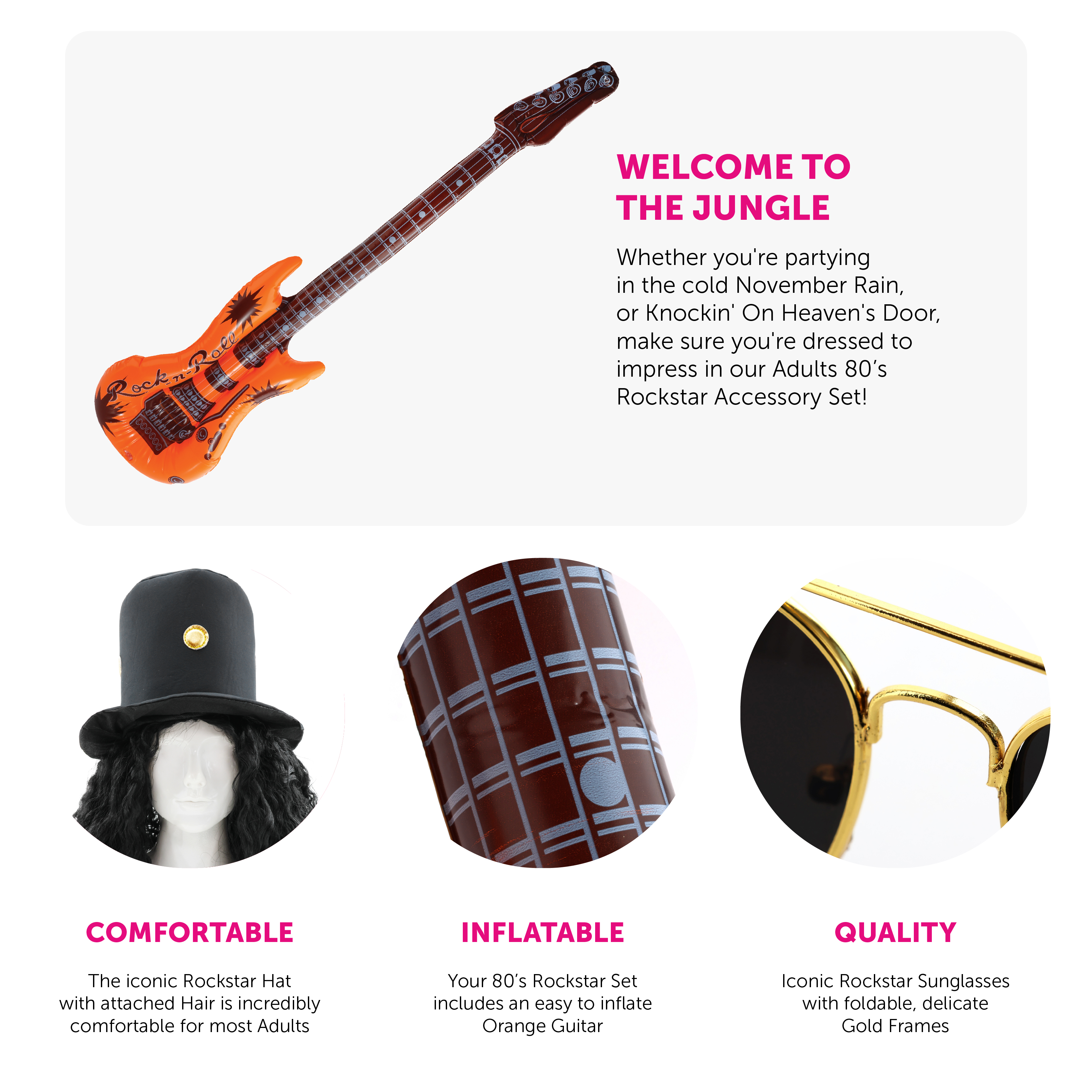ACCESSORY SET INCLUDES: This Accessory Set includes a tall Black Top Hat with Gold detail and long hair attached, a wet-look, Relaxed Black Afro Wig, Gold Frame Sunglasses, and an Inflatable Orange Guitar, the perfect look for any fancy dress event!