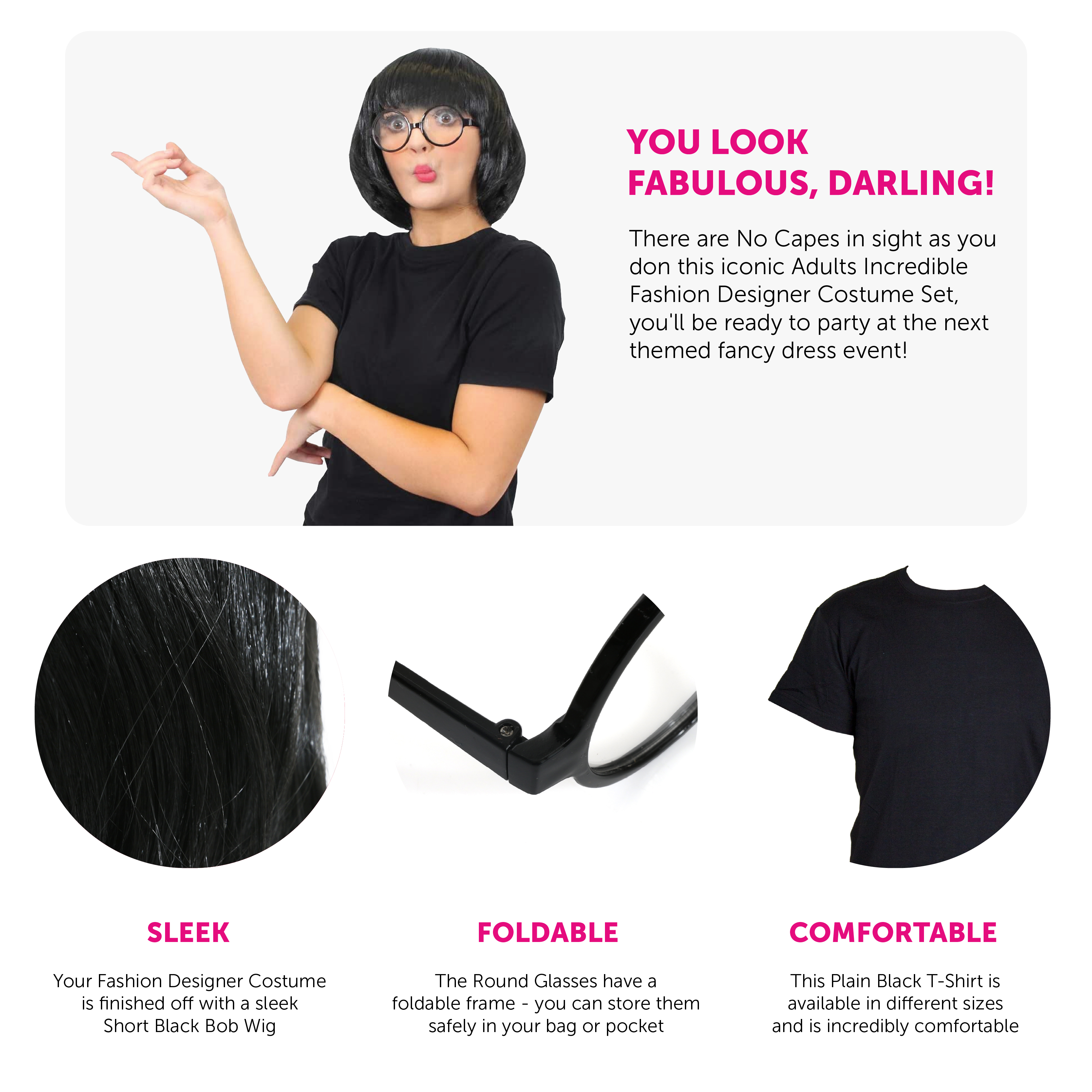 FASHION DESIGNER DETAILS: This Adults Incredible Fashion Designer Costume Set includes a Plain Black T-Shirt, a short, straight haired Black Bob Wig and a pair of plastic black framed Round Glasses with clear lenses, the perfect addition to your outfit!