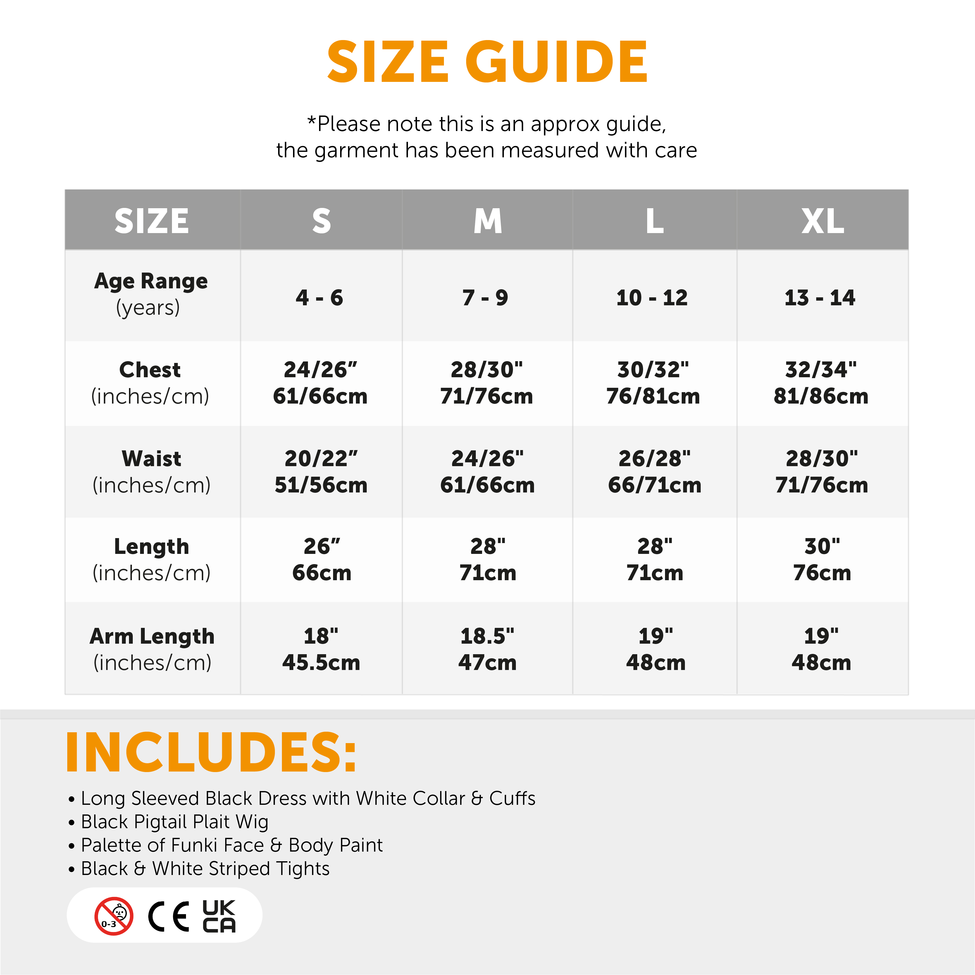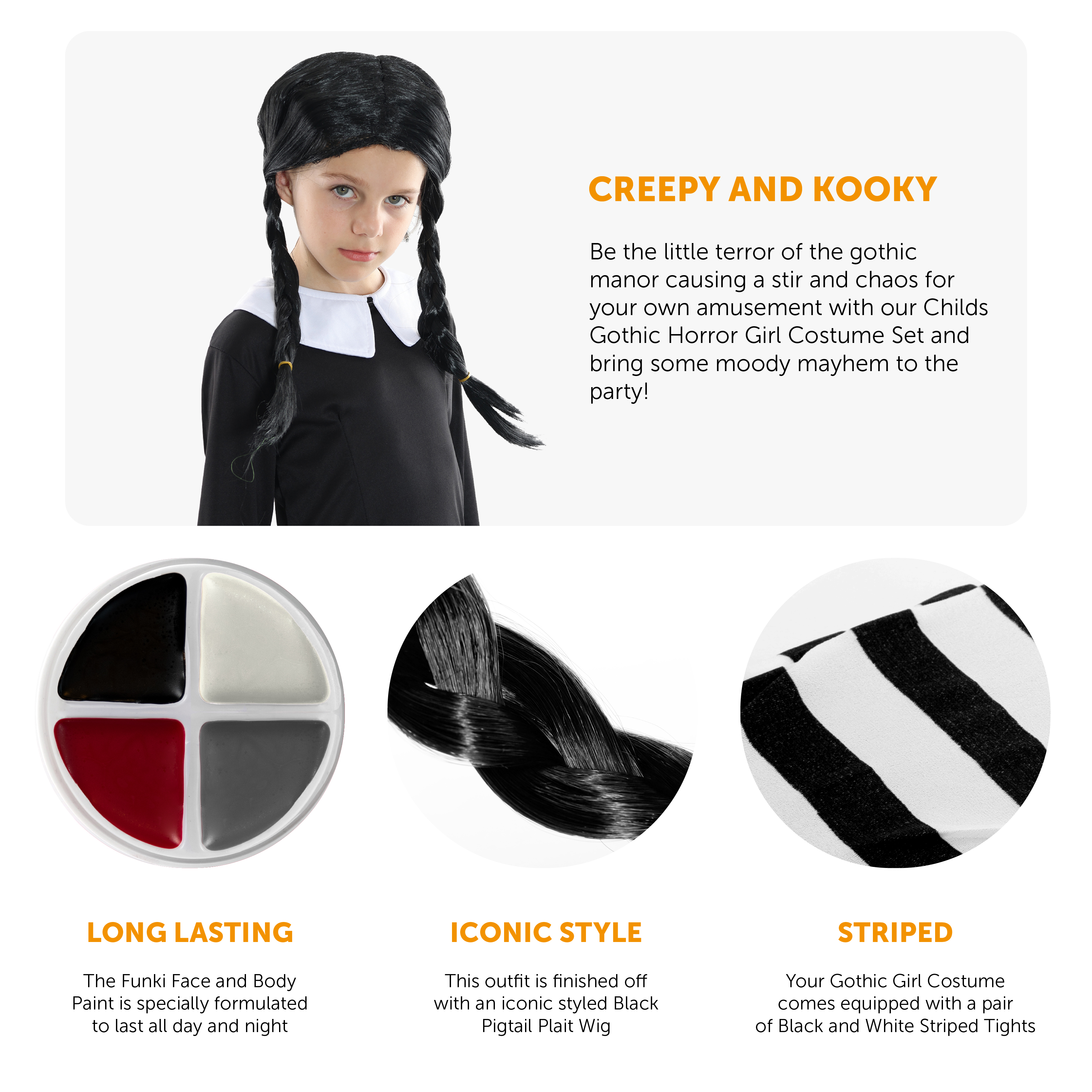 COSTUME DETAILS: Your Child's Gothic Horror Girl Costume includes a Long Sleeve Black Dress with a White Collar and a zip up back, a Black Pigtail Plait Wig, a Palette of Funki Face and Body Paint with colours Red, Grey, Black and White, and a pair of Black and White Striped Tights, a great look for you this Halloween!