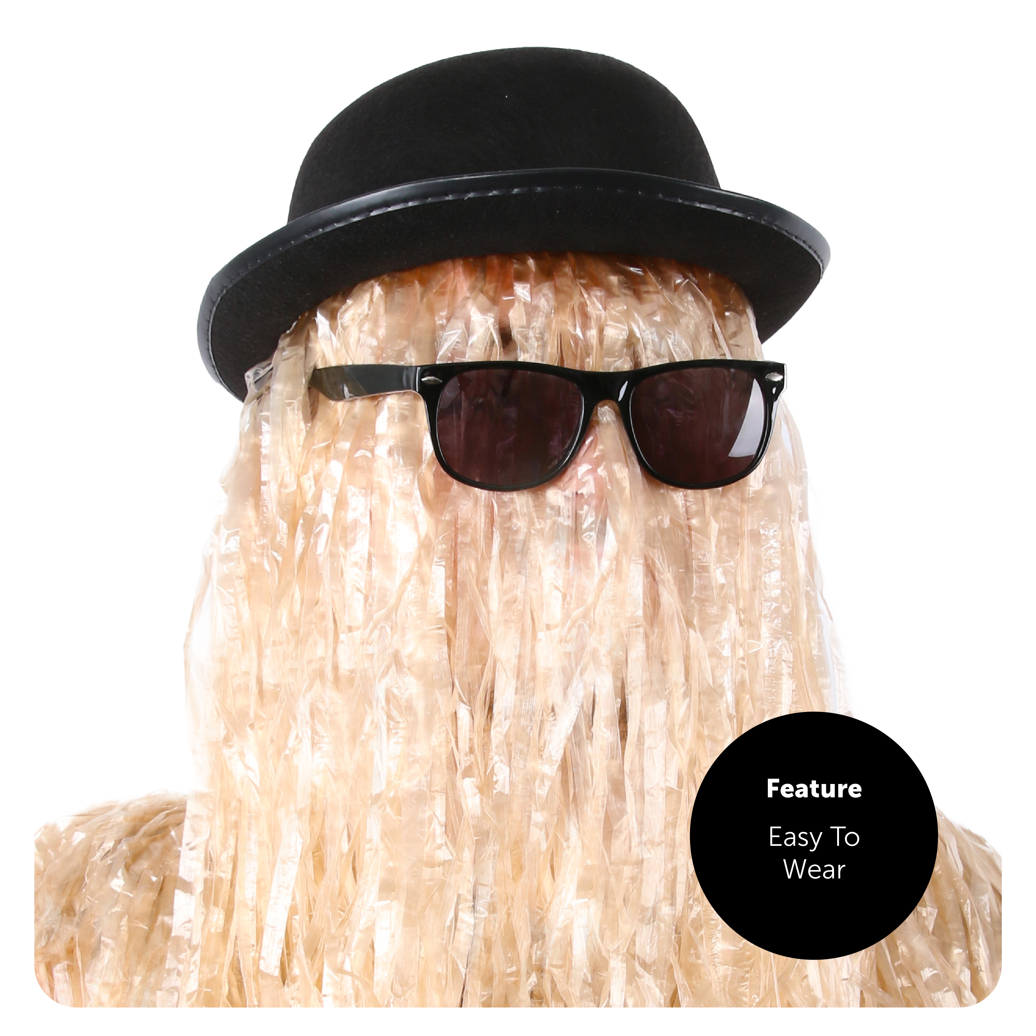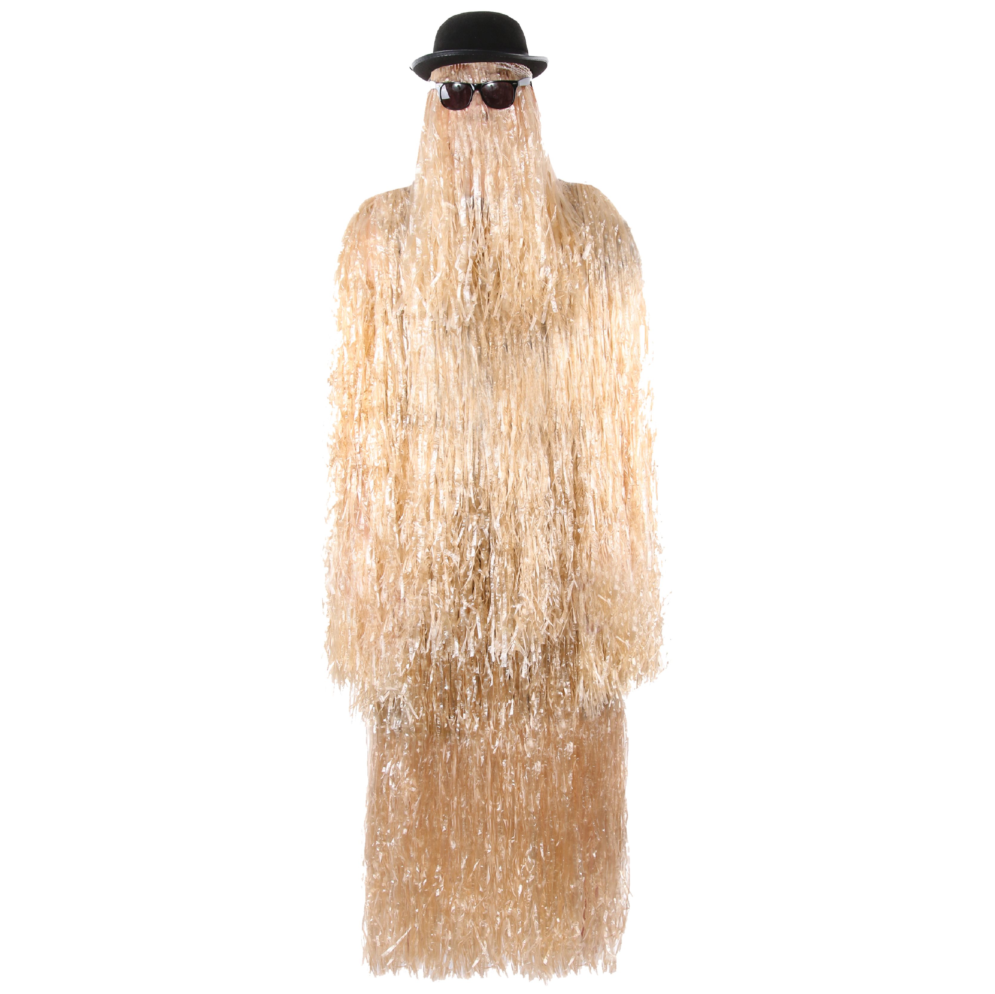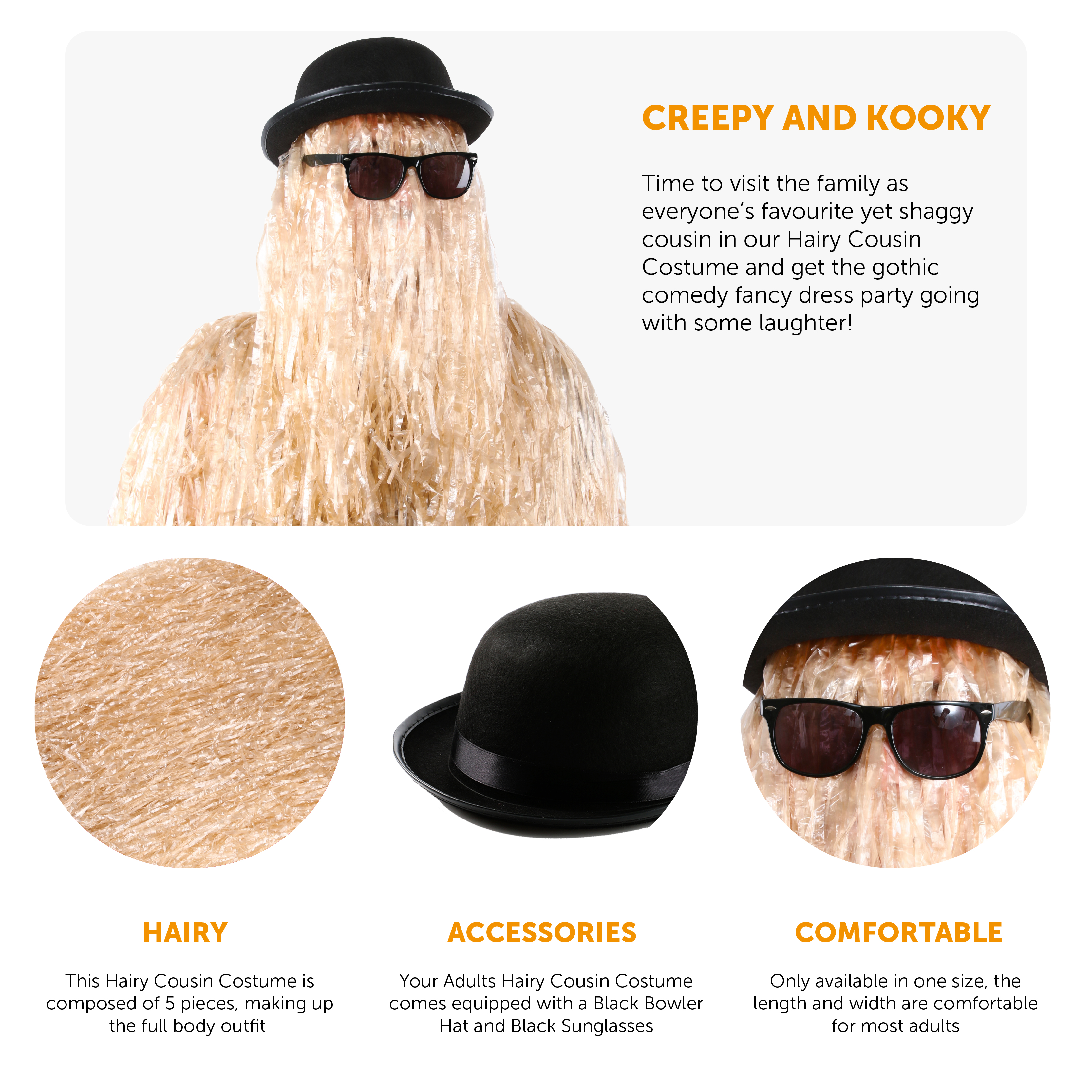 HAIRY COUSIN COSTUME DETAILS: Your Hairy Cousin Costume is composed of 2 Hairy Arm sleeves, 1 Head Piece, 1 Body Piece, and a Skirt/Leg Piece to bedazzle yourself in hair, as well as including a 58cm Bowler Hat, and a pair of Black Sunglasses!
