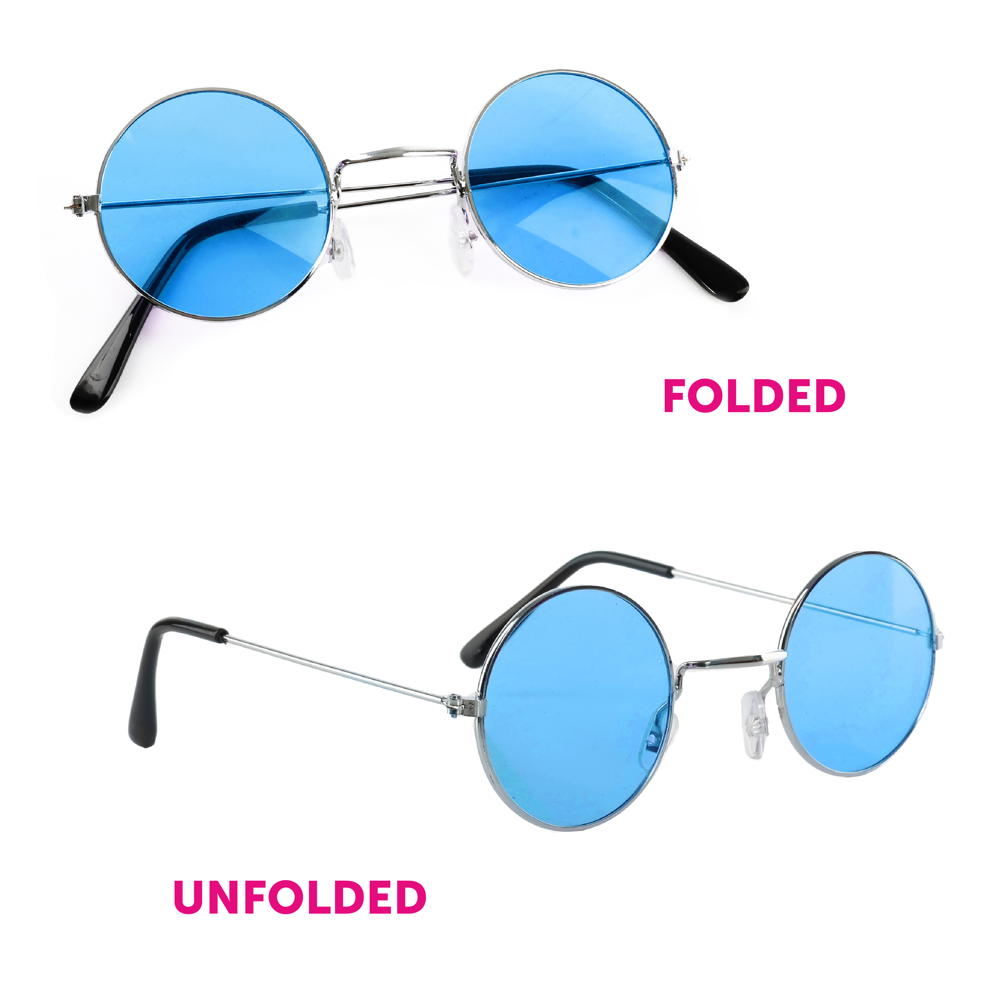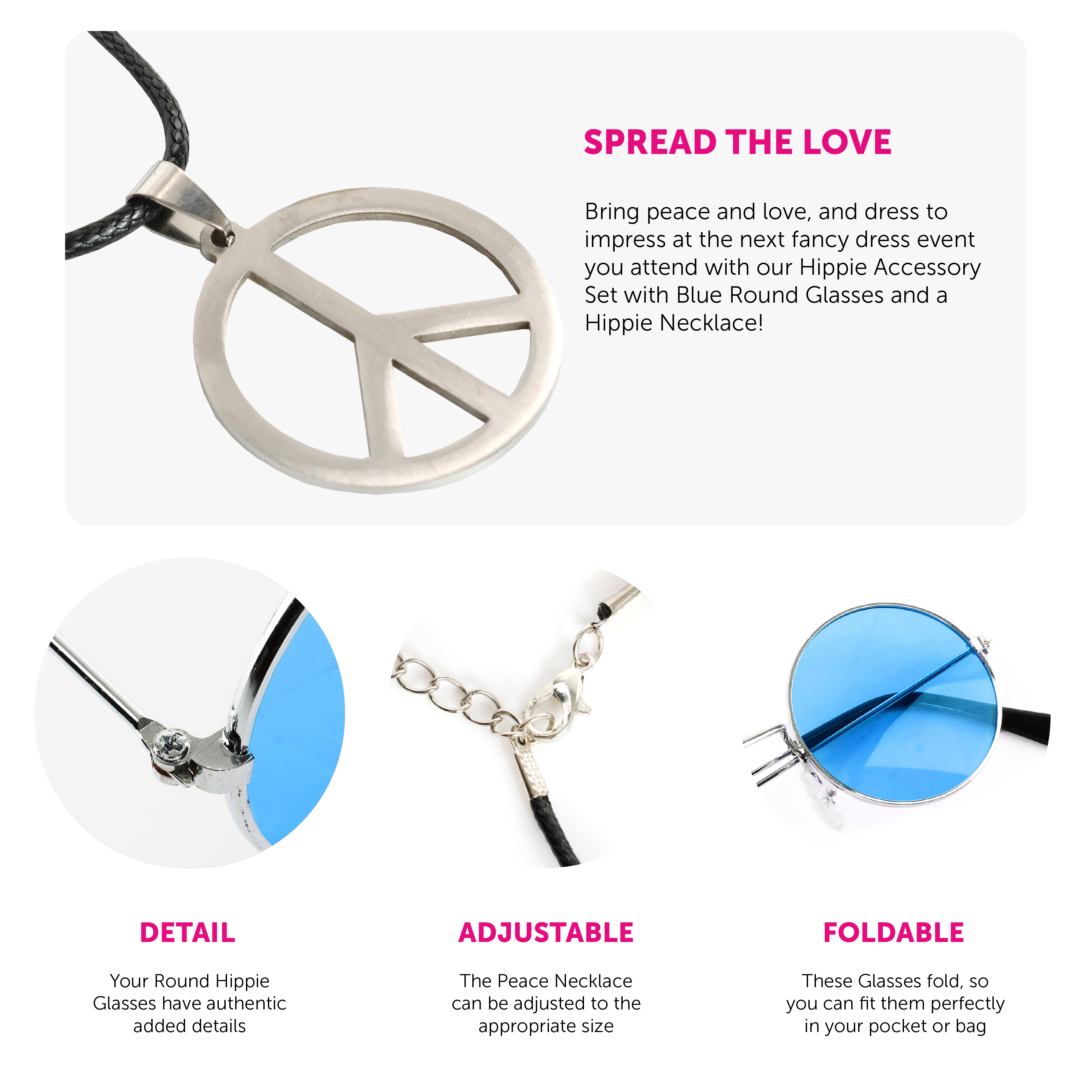 ACCESSORY SET INCLUDES: This Hippie Accessory Set includes a pair of Round Frame Glasses with Blue Lenses and an adjustable Necklace with a Peace Symbol pendant, the perfect accessories to add to your Hippie Outfit!