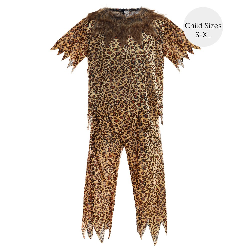 The soft-feeling leopard print top features rugged, tattered edges and a faux fur collar for an authentic prehistoric appearance. The matching trousers complete the outfit while remaining comfortable and easy to wear for parties, play, and performances.