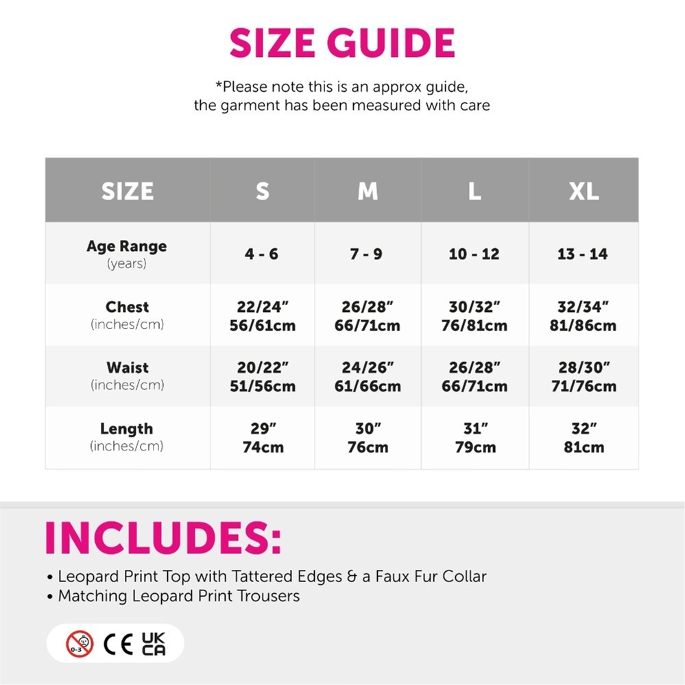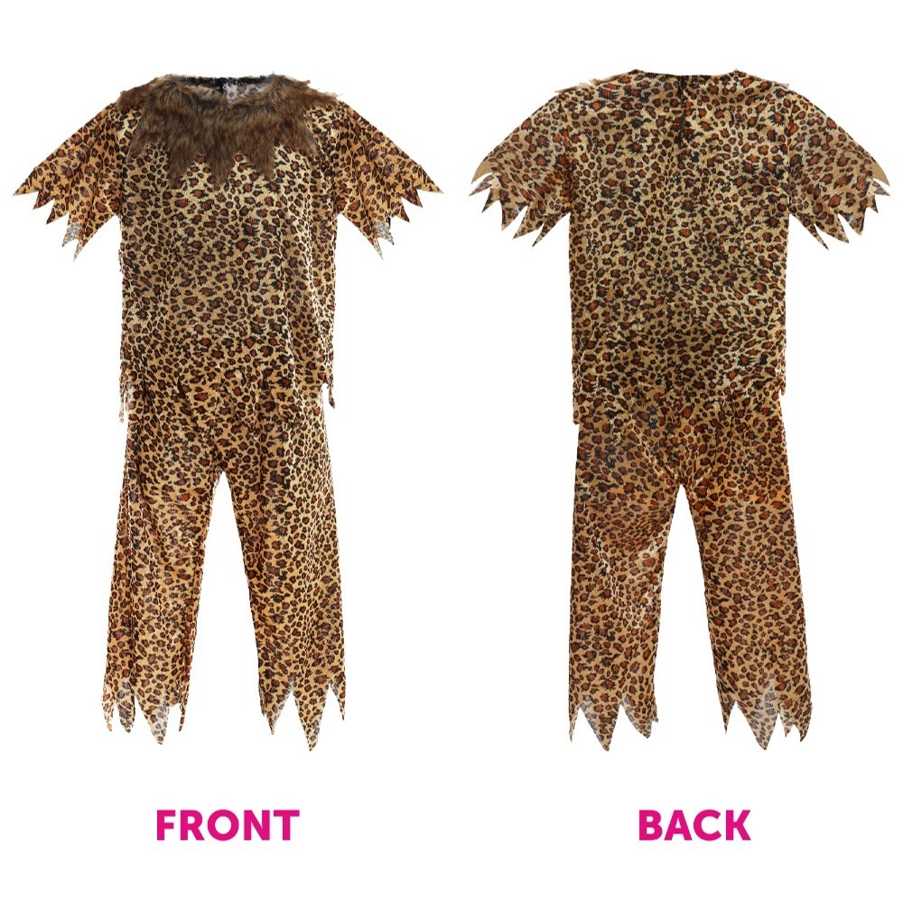 The soft-feeling leopard print top features rugged, tattered edges and a faux fur collar for an authentic prehistoric appearance. The matching trousers complete the outfit while remaining comfortable and easy to wear for parties, play, and performances.