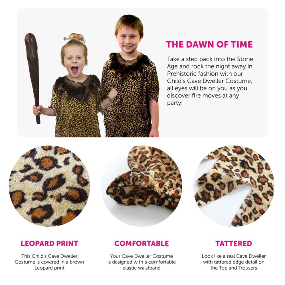 Take a step back into the Stone Age and rock the night away in prehistoric fashion with this Child’s Cave Dweller Costume. Perfect for themed parties, school events, and fancy dress fun, this complete outfit brings ancient adventure to life — right down to the wild caveman hair and club.